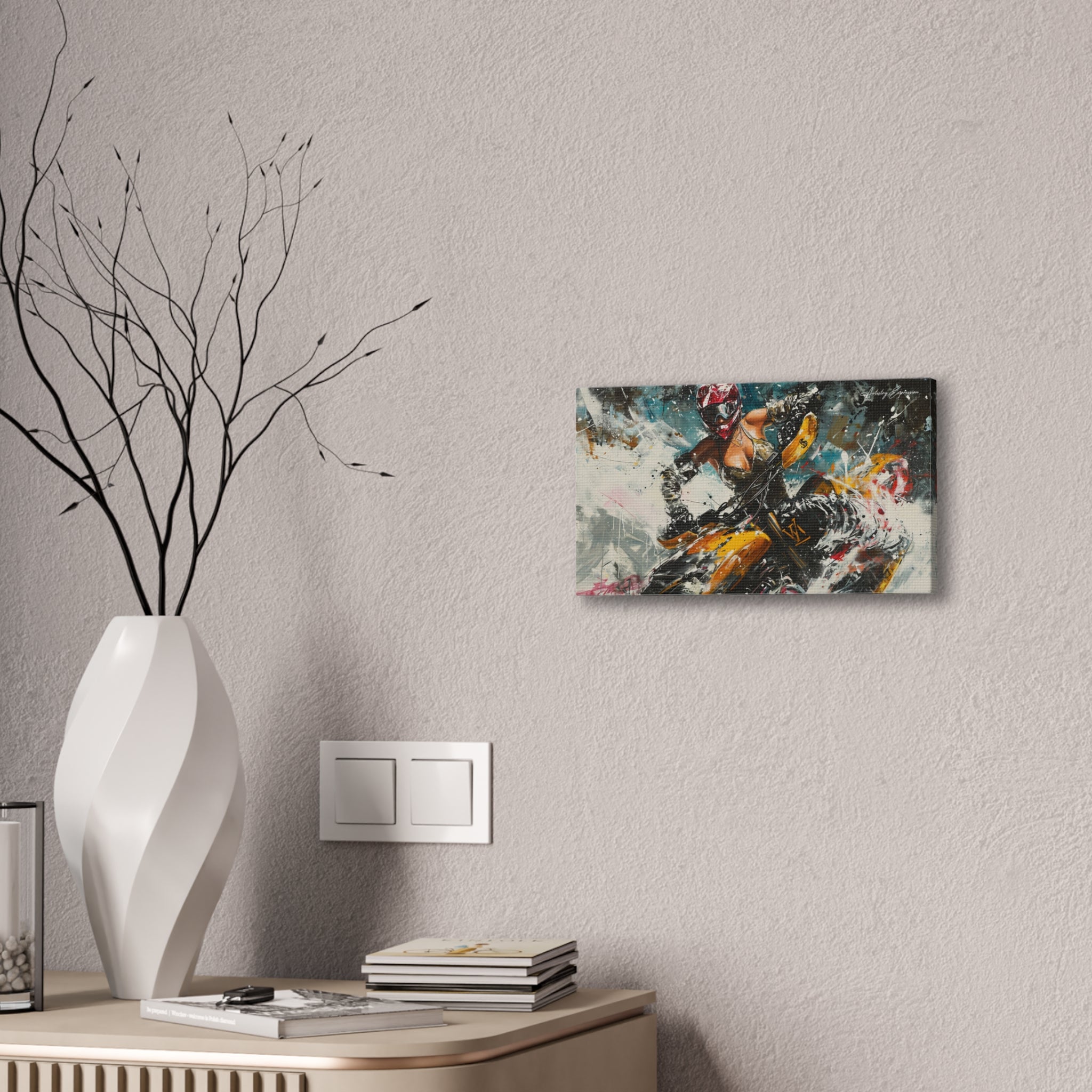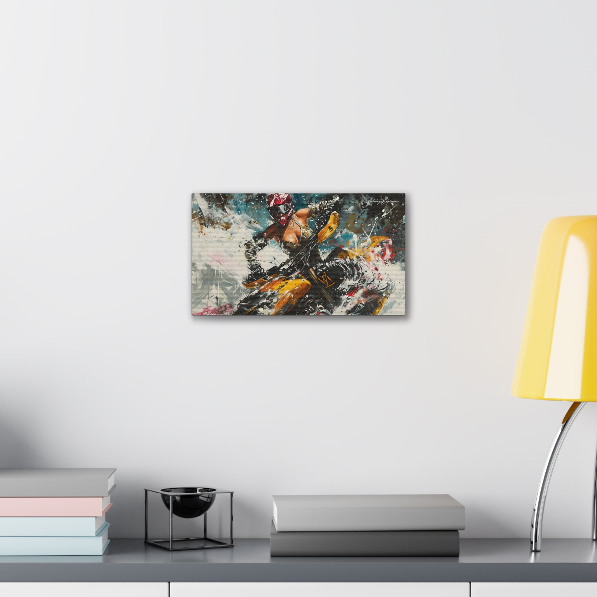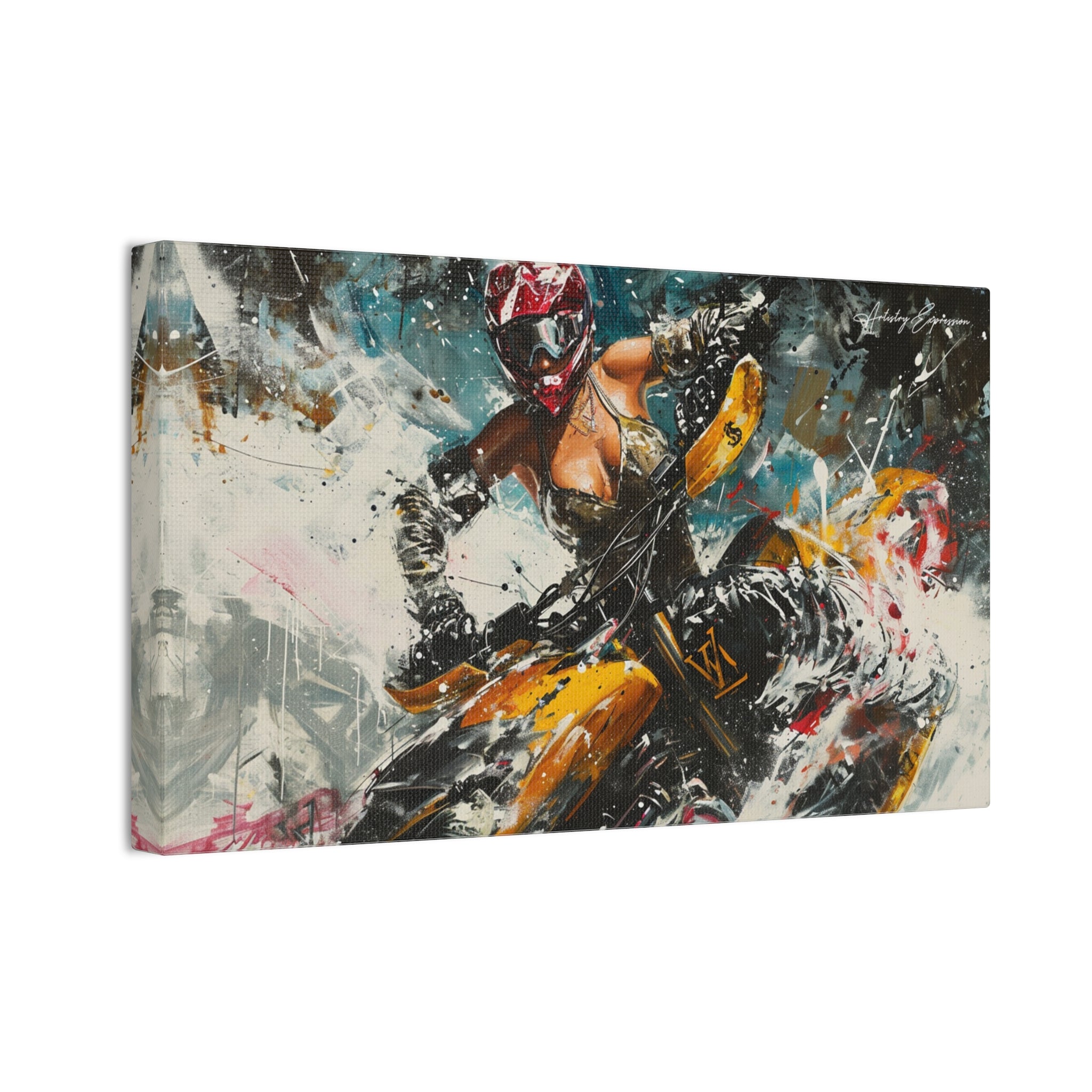 In this dynamic oil painting, a bold lady braves the snow as she rides a motorcycle, her journey infused with vibrant colors against the wintry landscape. The scene captures the thrilling contrast between the icy surroundings and the fiery spirit of adventure.