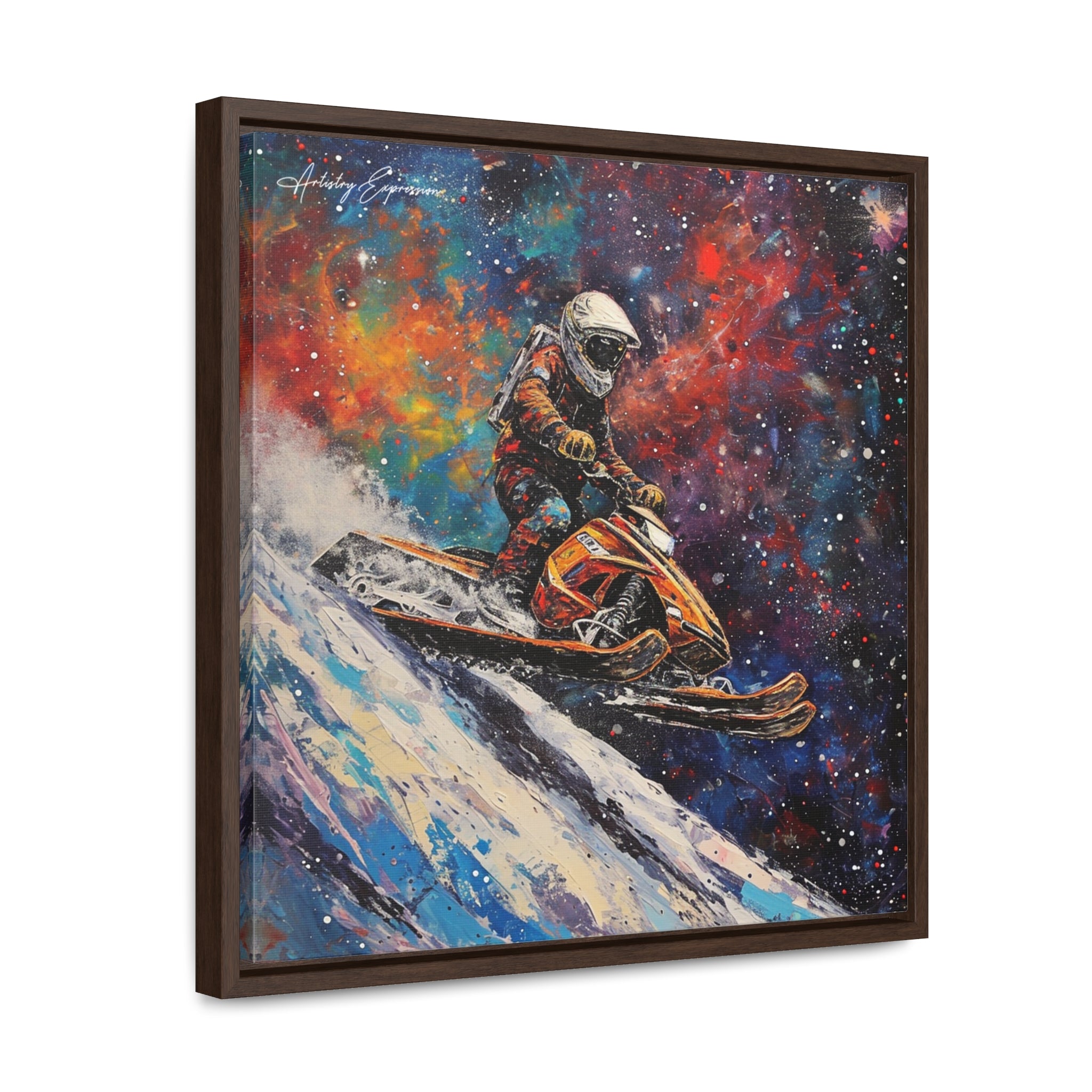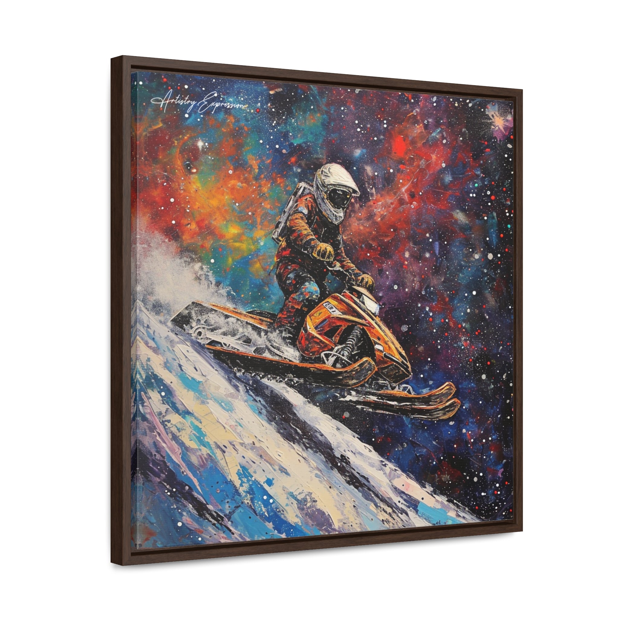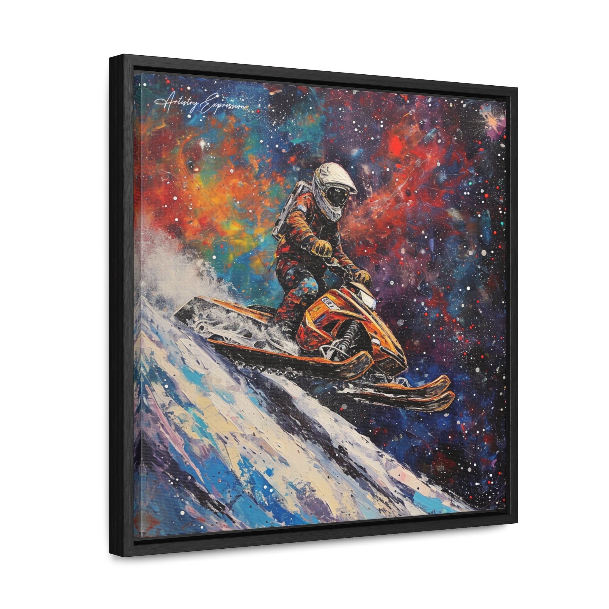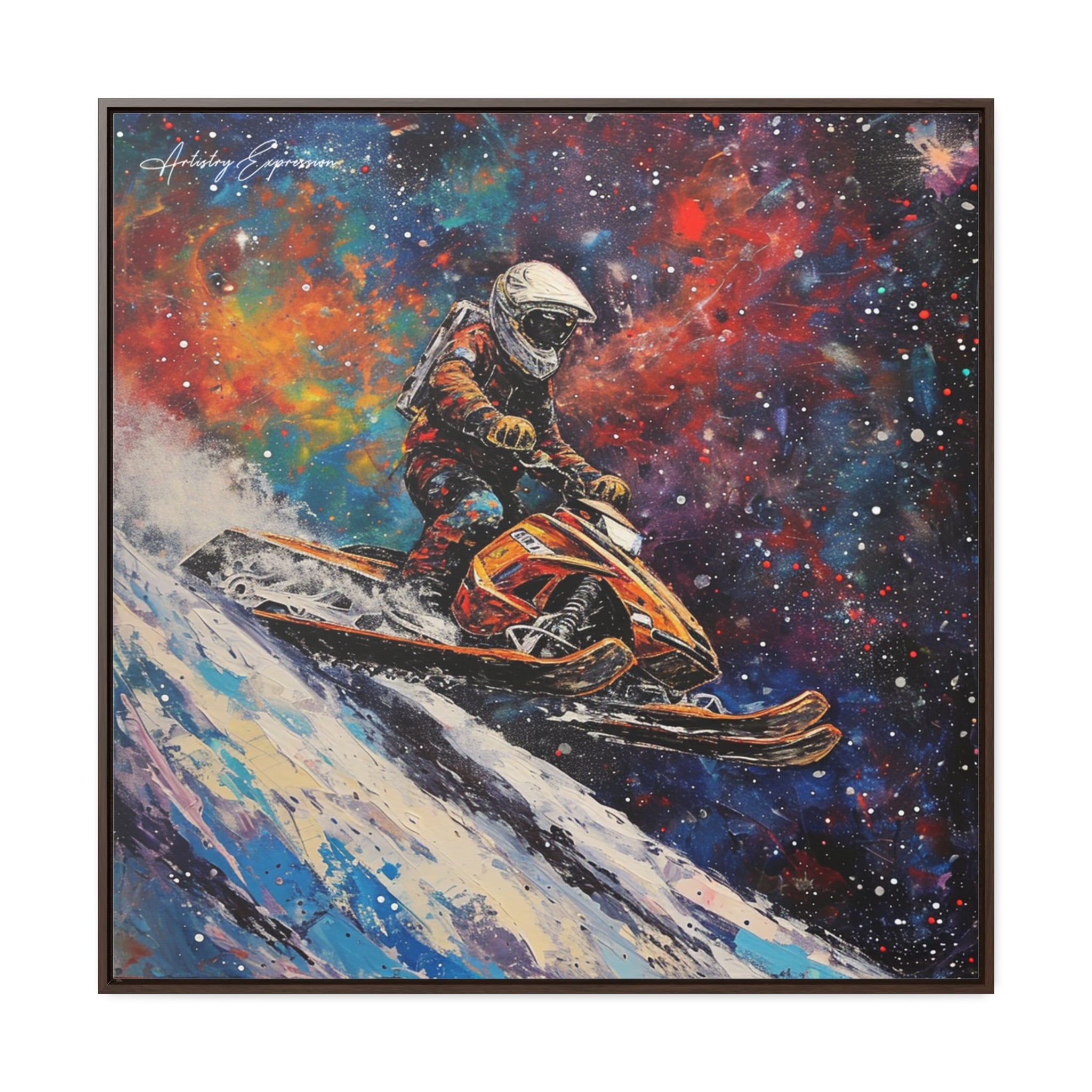 In this electrifying canvas, an astronaut navigates a colorful snowmobile through the vastness of space, merging the thrill of speed with the cosmic beauty of the universe. The dynamic scene captures the essence of adventure and exploration beyond earthly confines.