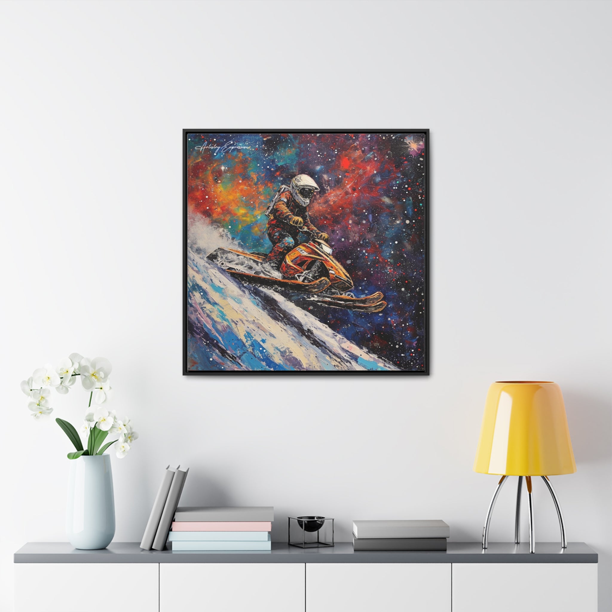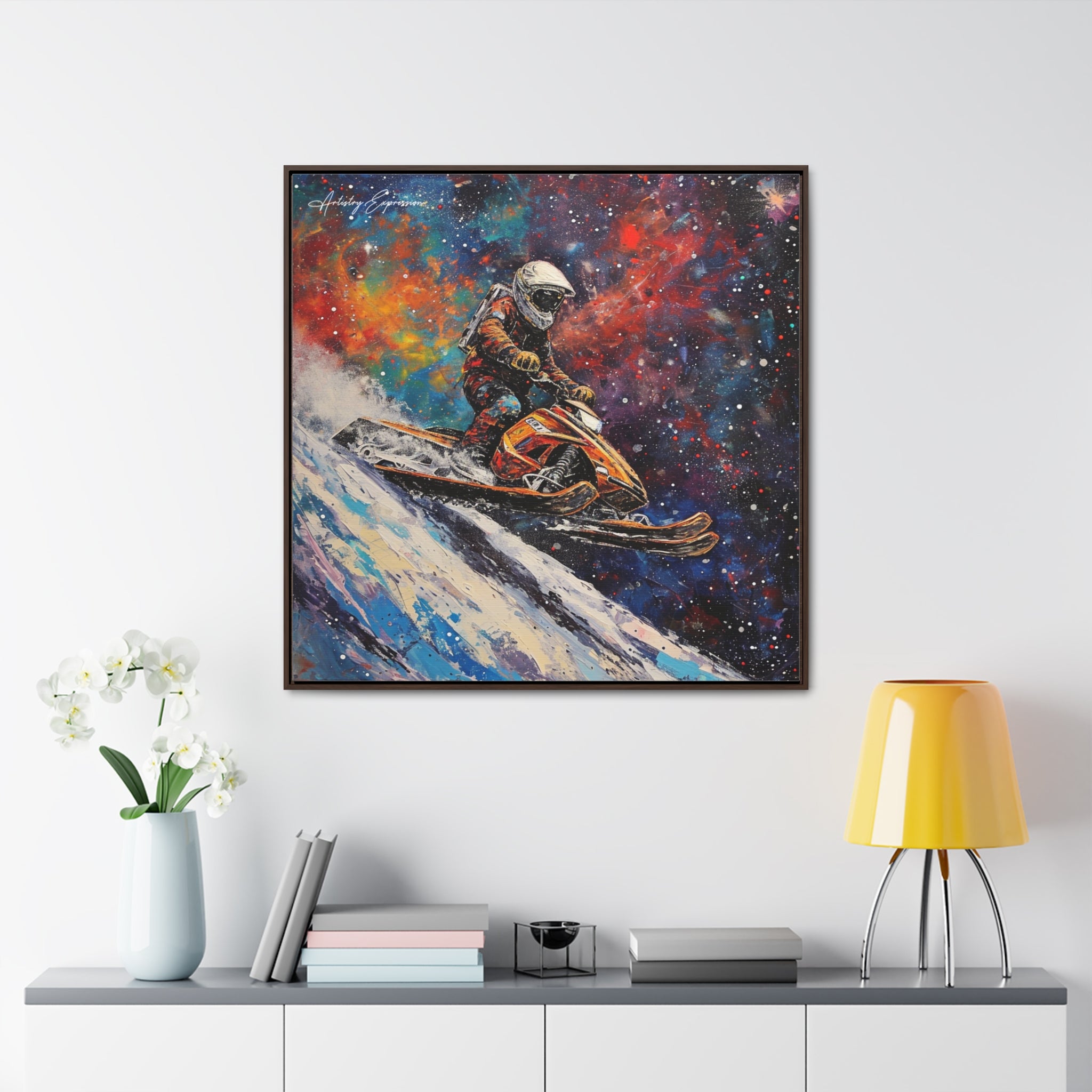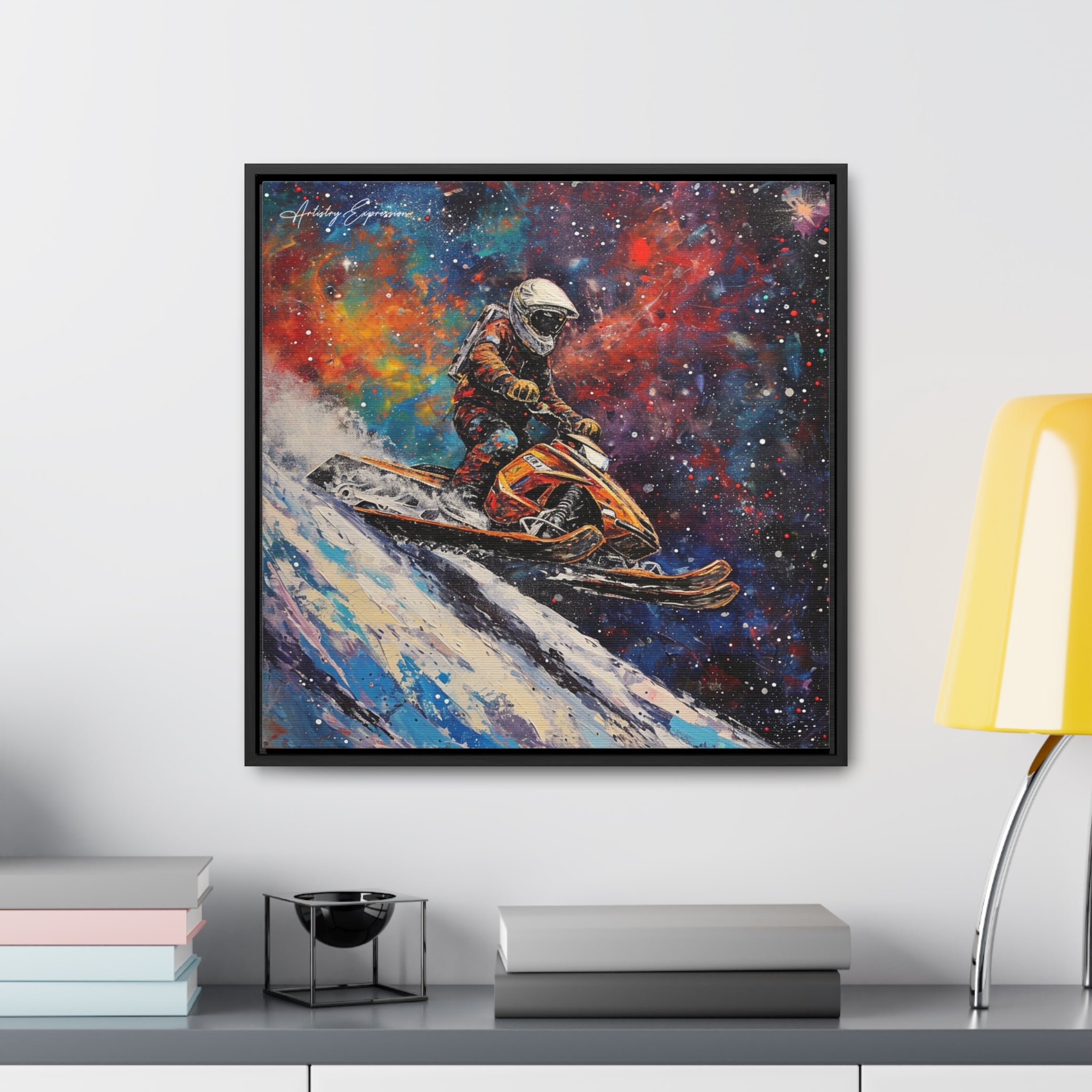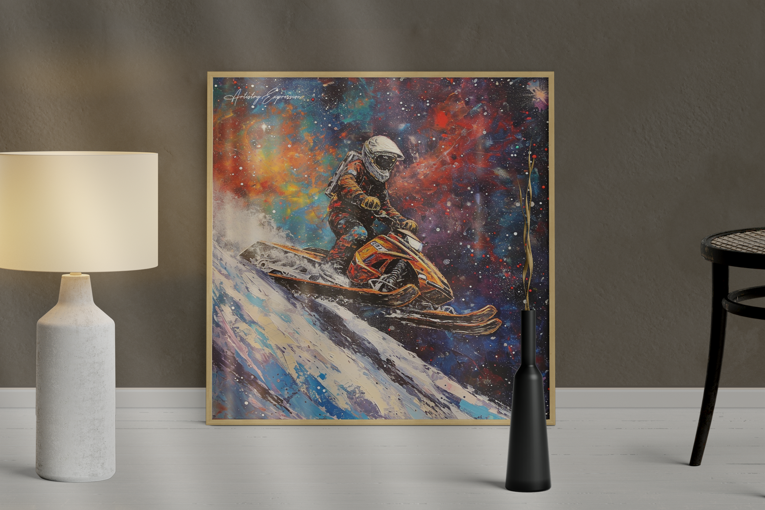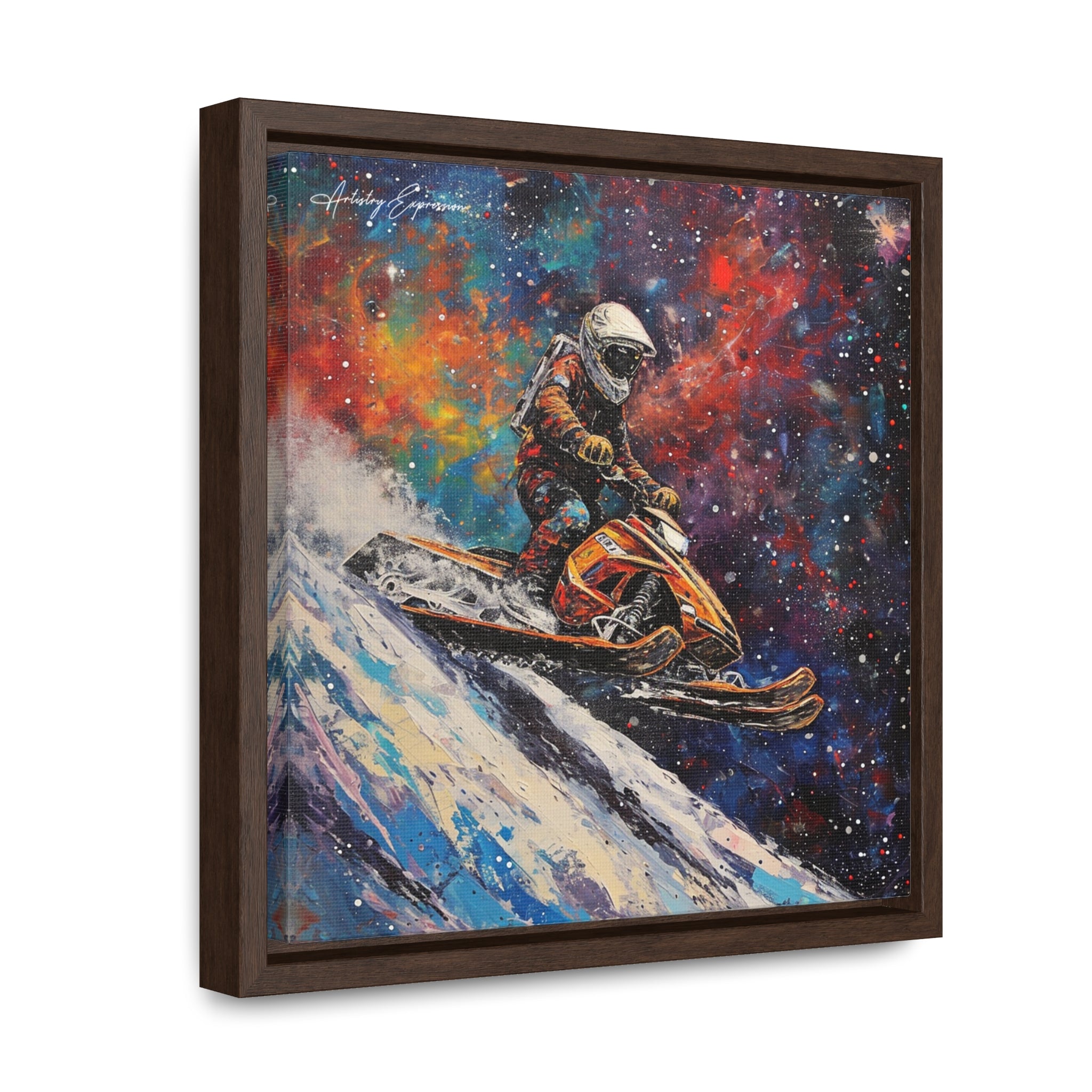 In this electrifying canvas, an astronaut navigates a colorful snowmobile through the vastness of space, merging the thrill of speed with the cosmic beauty of the universe. The dynamic scene captures the essence of adventure and exploration beyond earthly confines.