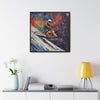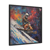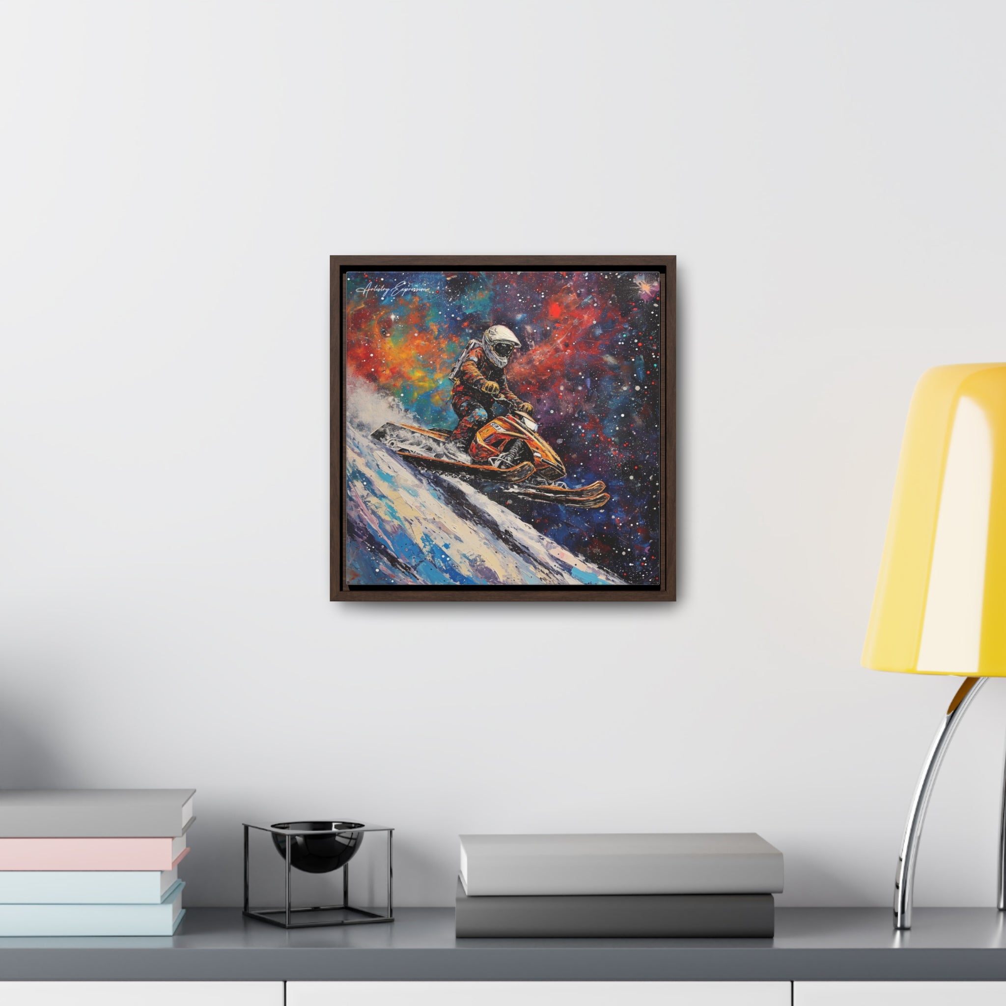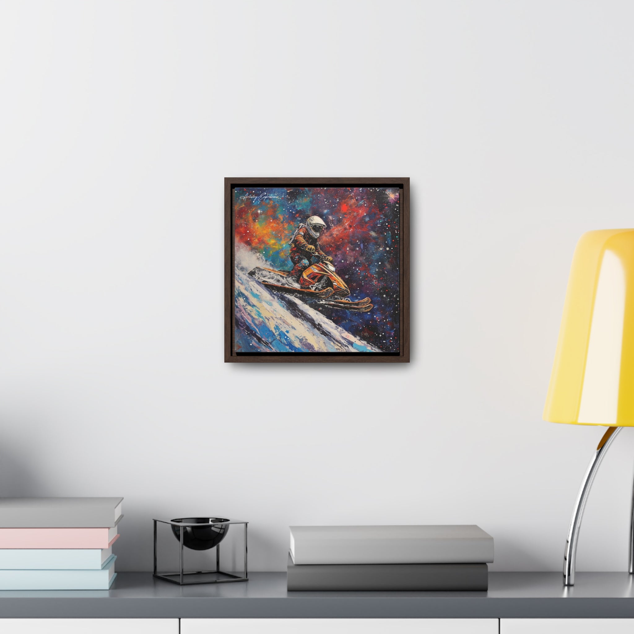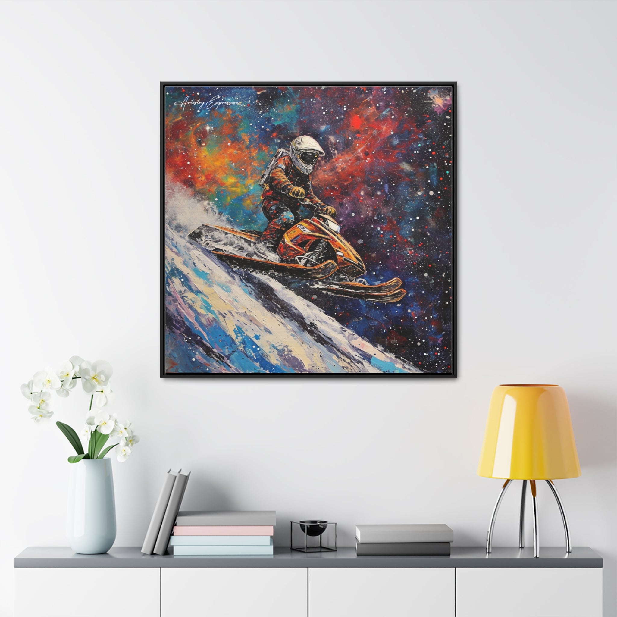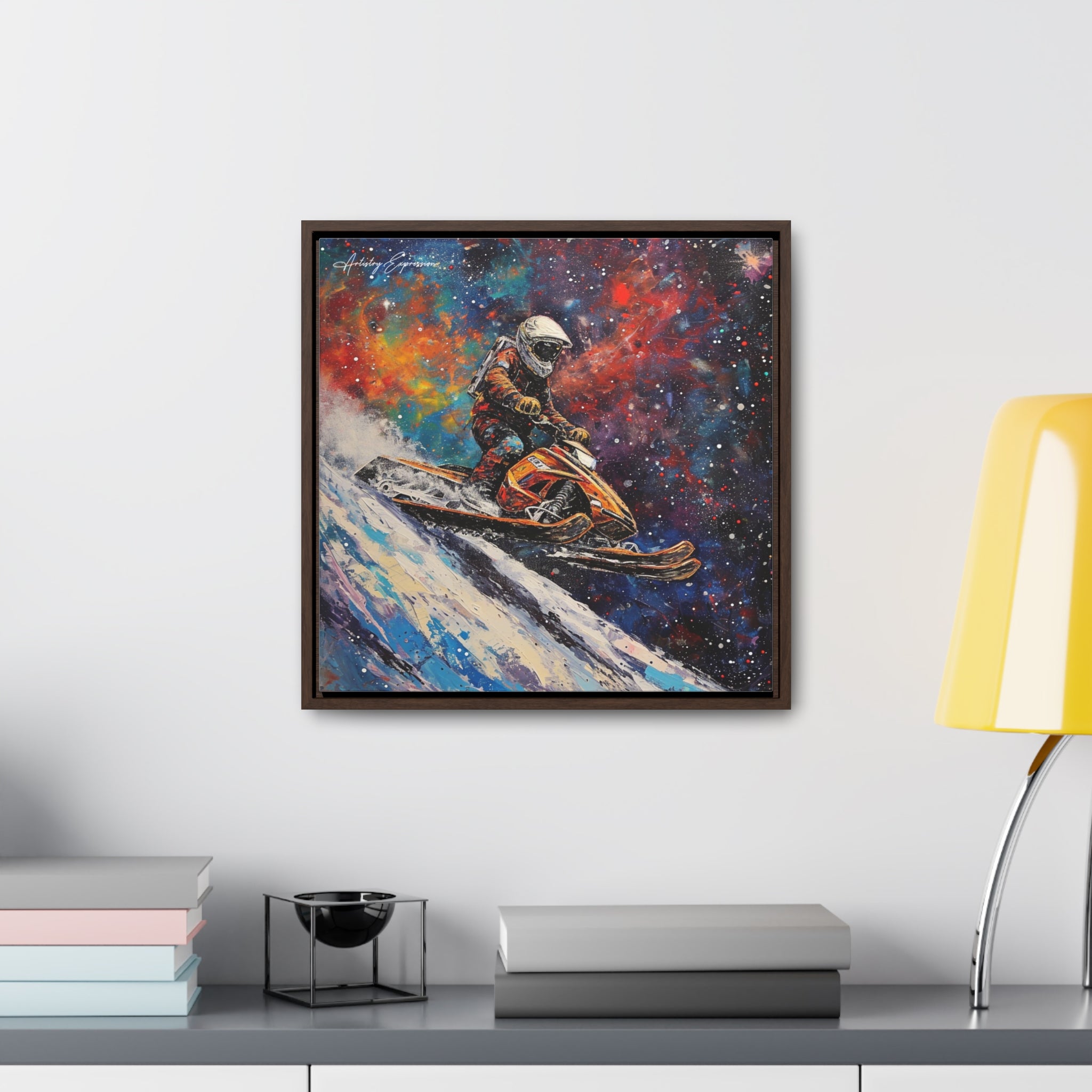 In this electrifying canvas, an astronaut navigates a colorful snowmobile through the vastness of space, merging the thrill of speed with the cosmic beauty of the universe. The dynamic scene captures the essence of adventure and exploration beyond earthly confines.