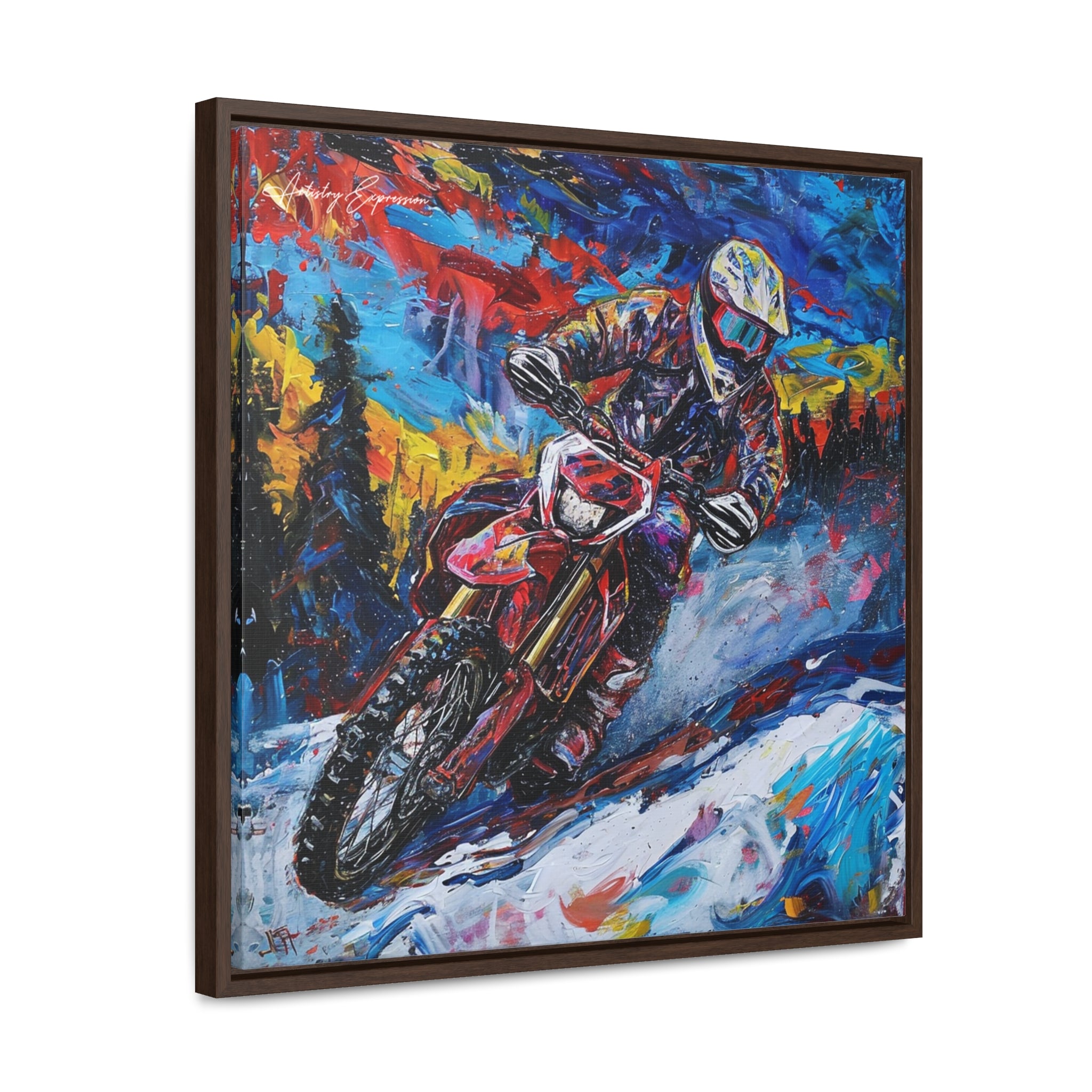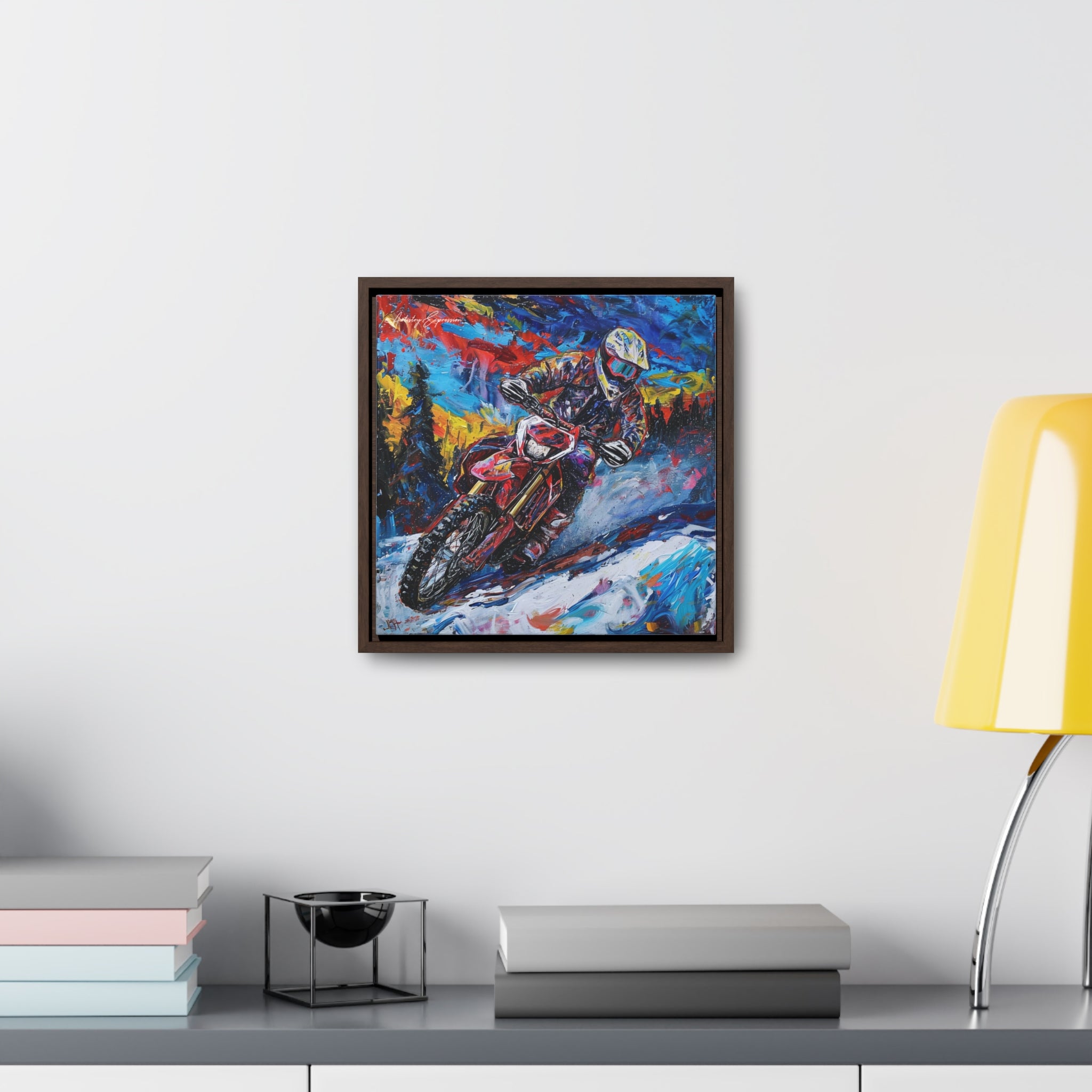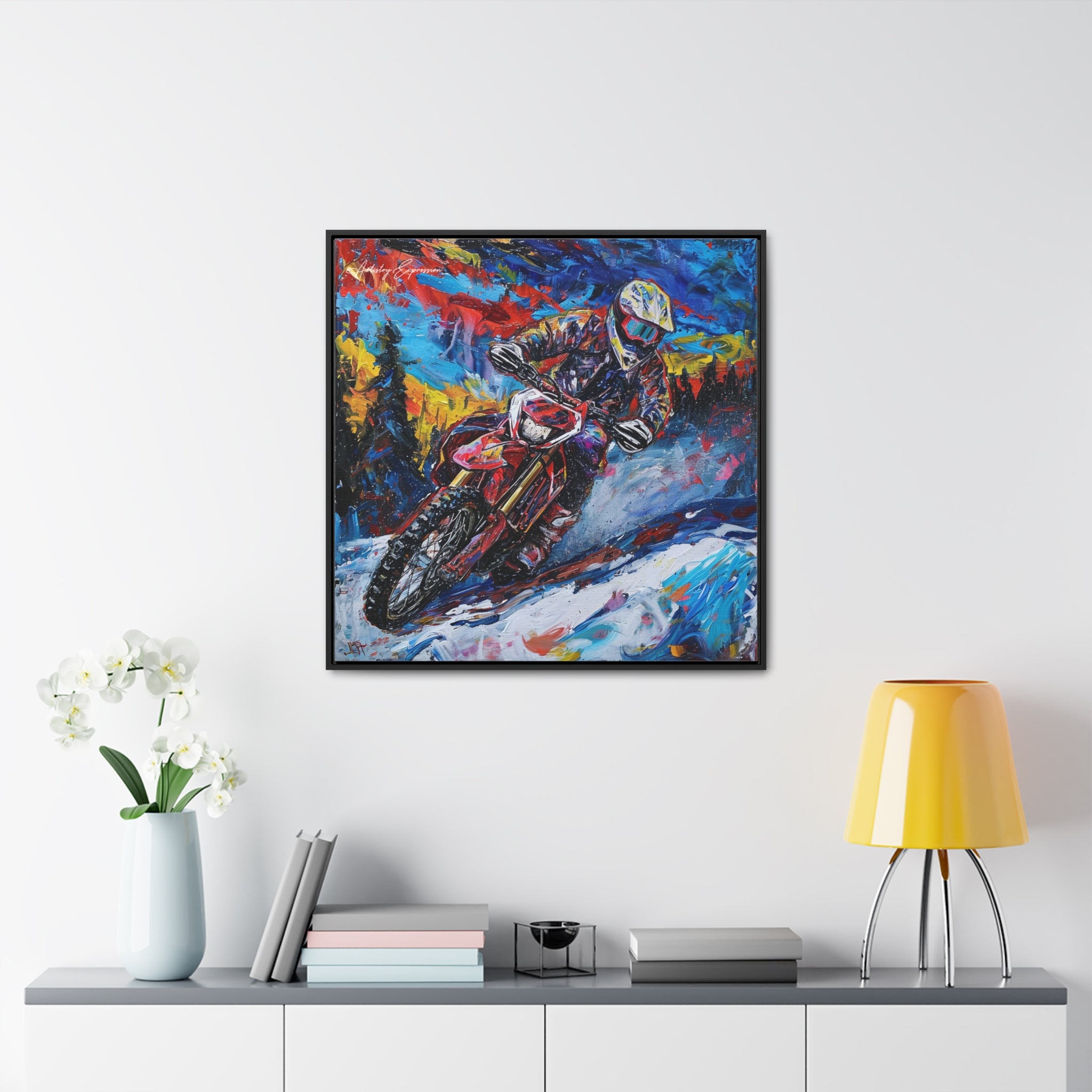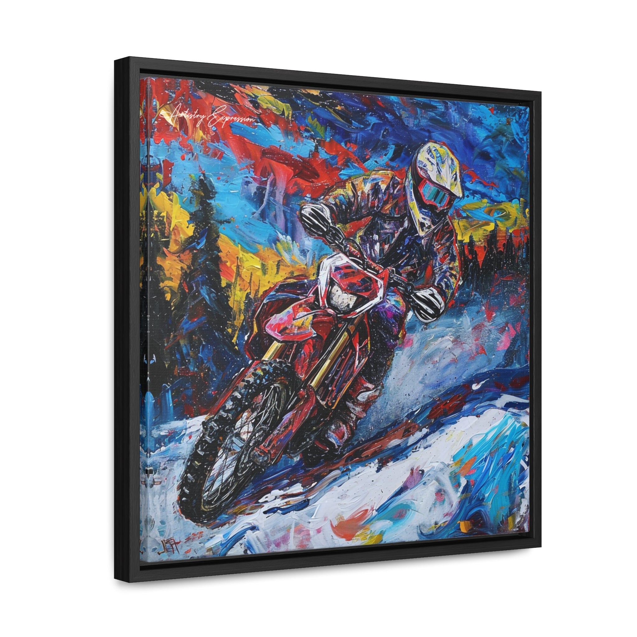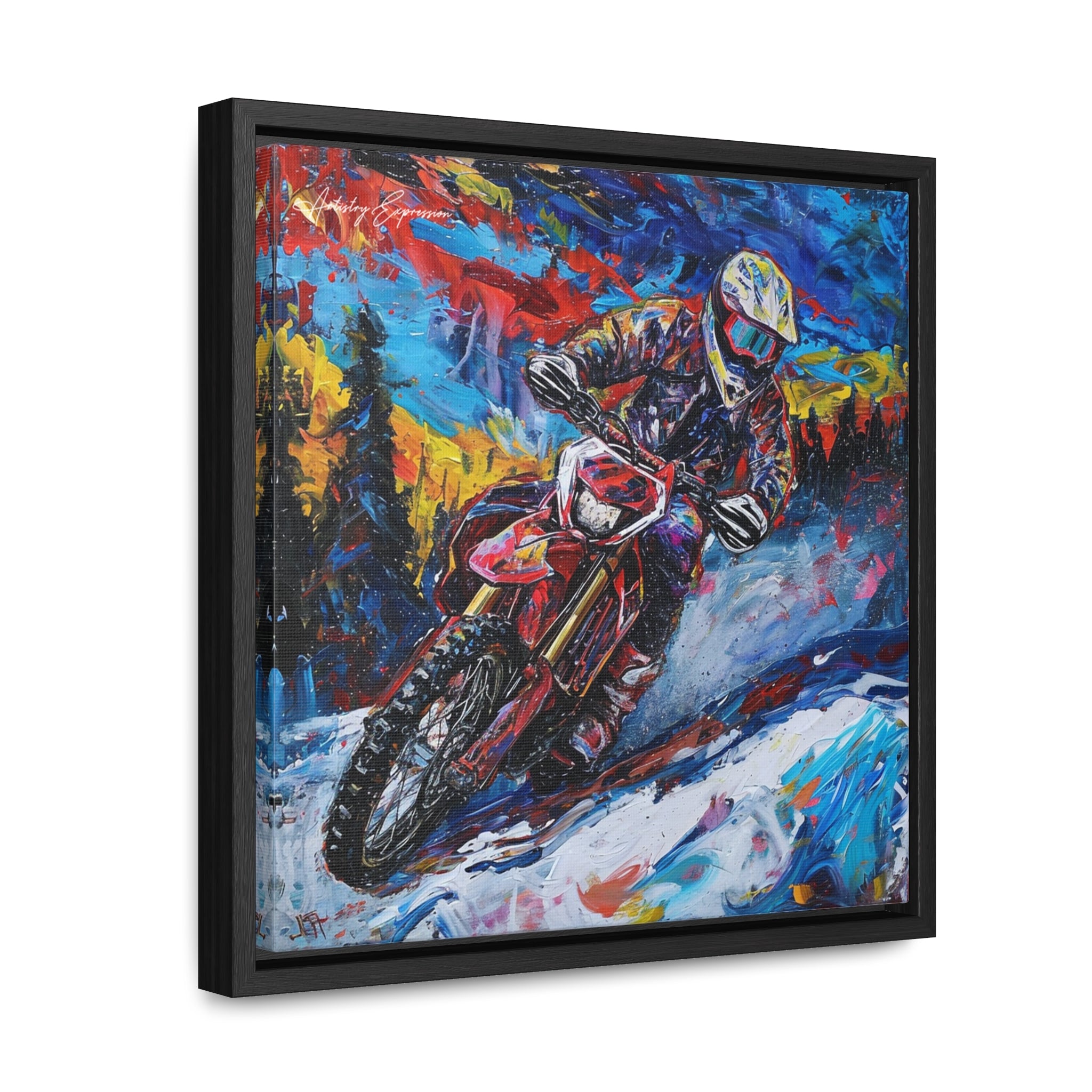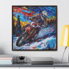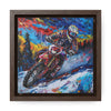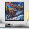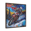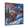 In this dynamic canvas, a colorful motorcycle speeds through snowy terrain, blending the thrill of speed with the tranquility of a winter landscape. The vibrant hues capture the essence of adventure amidst the icy terrain.