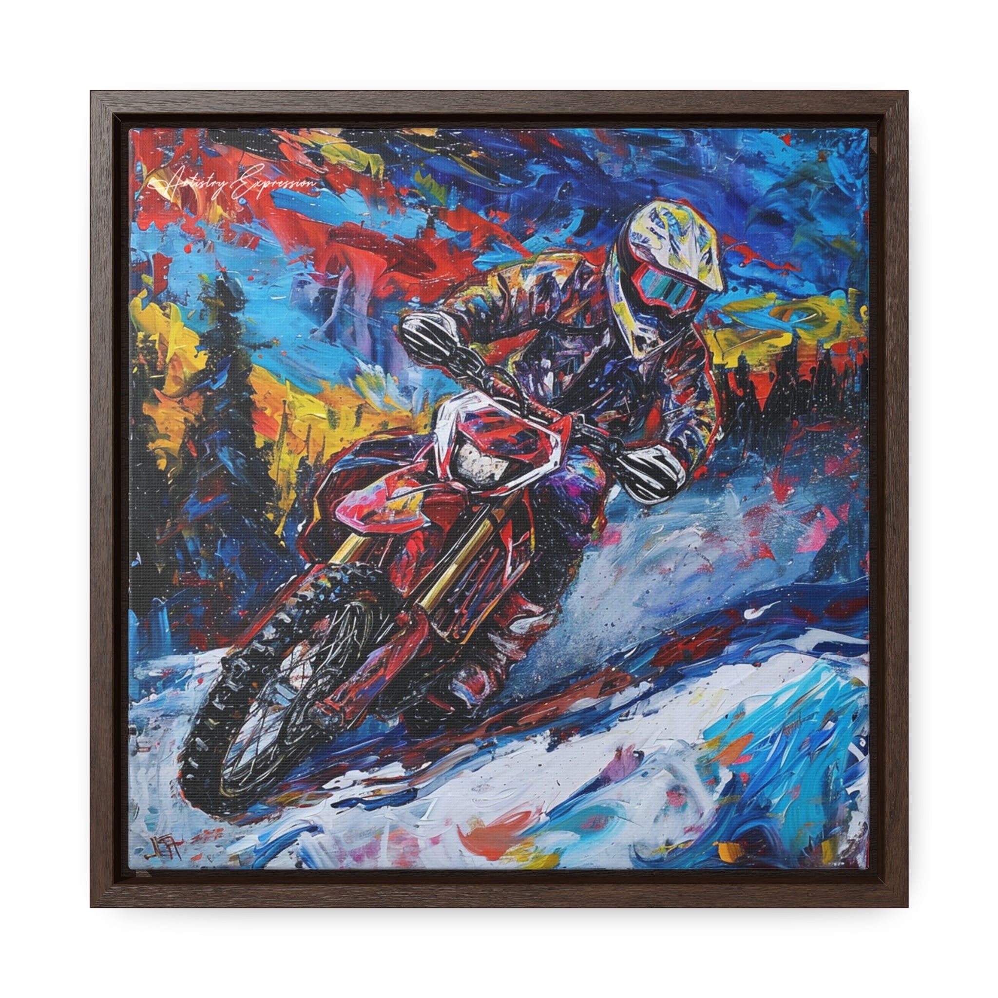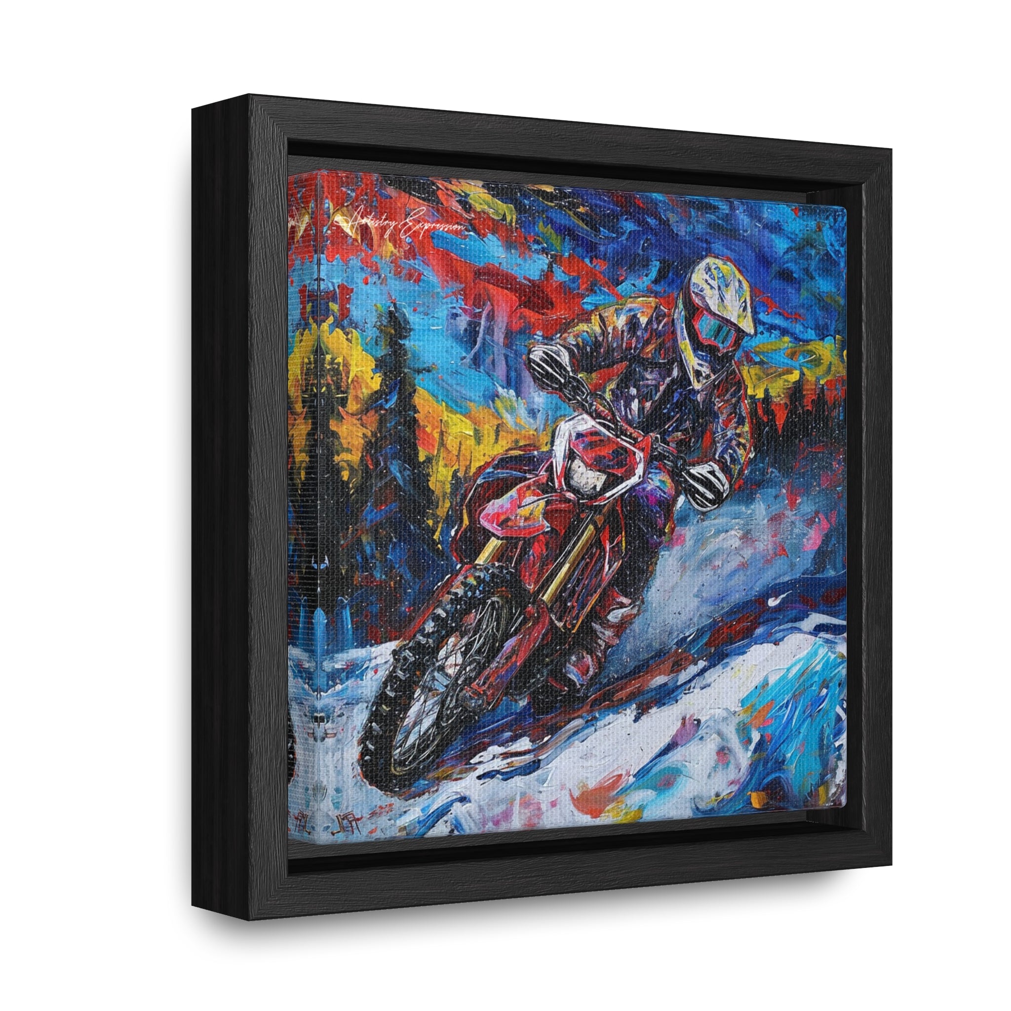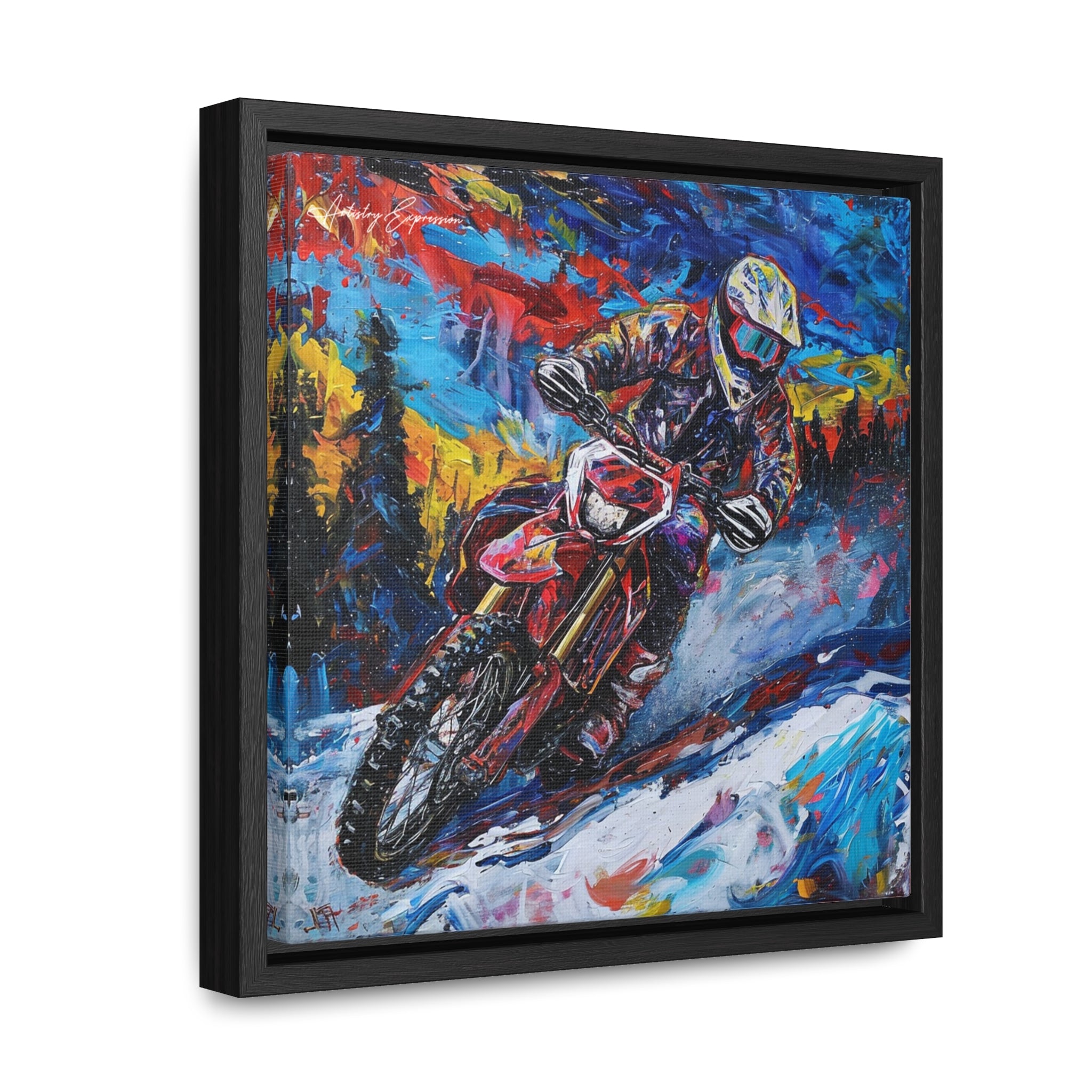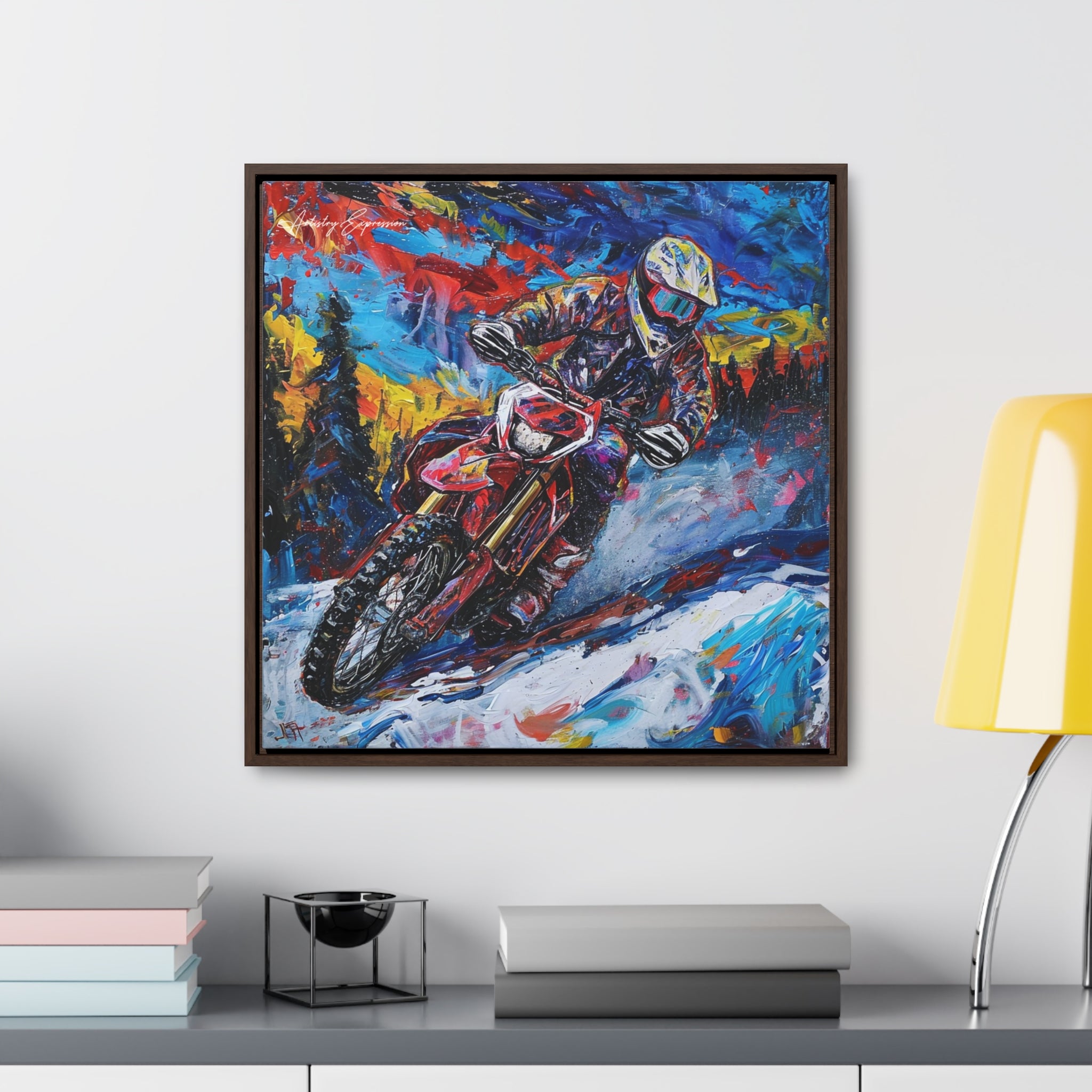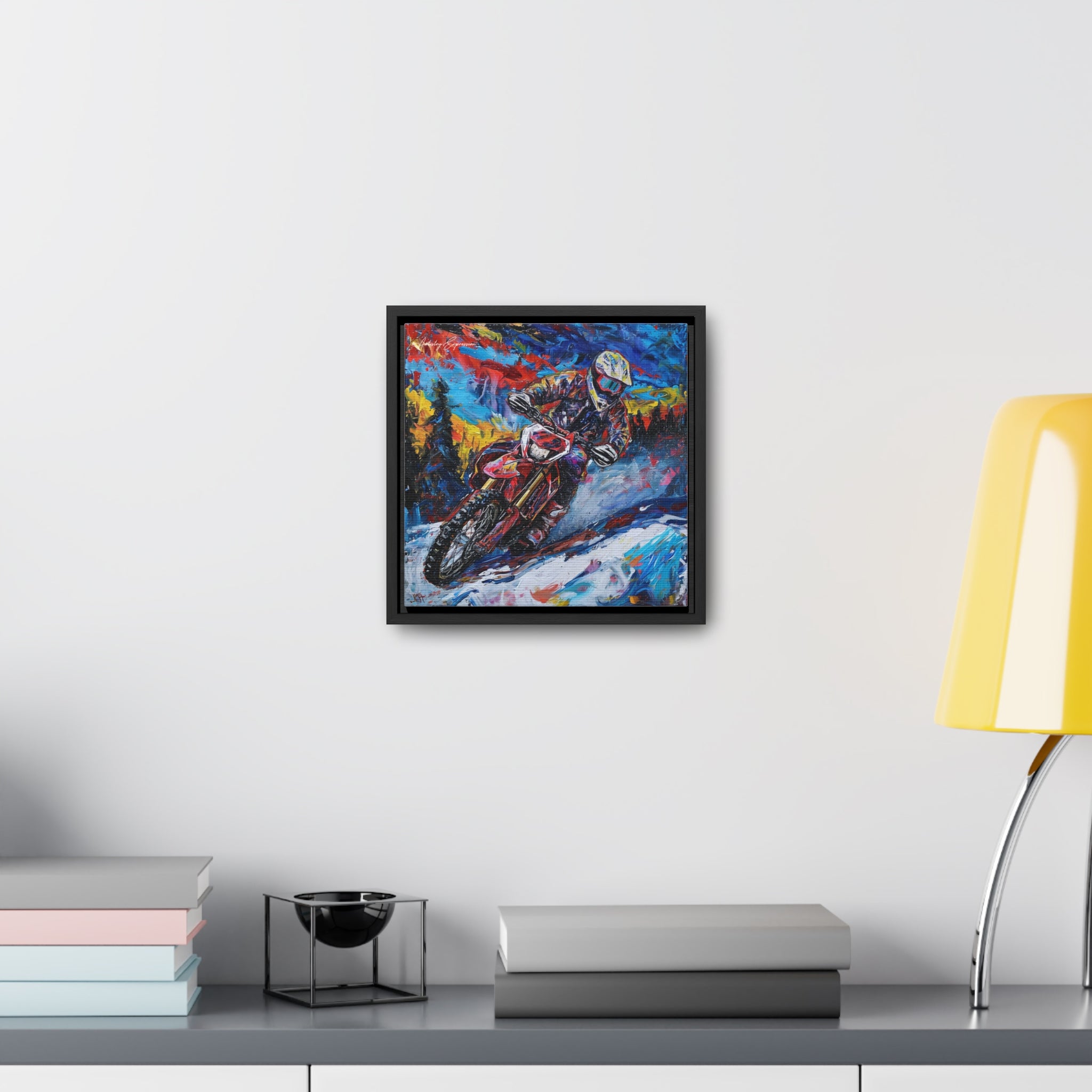 In this dynamic canvas, a colorful motorcycle speeds through snowy terrain, blending the thrill of speed with the tranquility of a winter landscape. The vibrant hues capture the essence of adventure amidst the icy terrain.