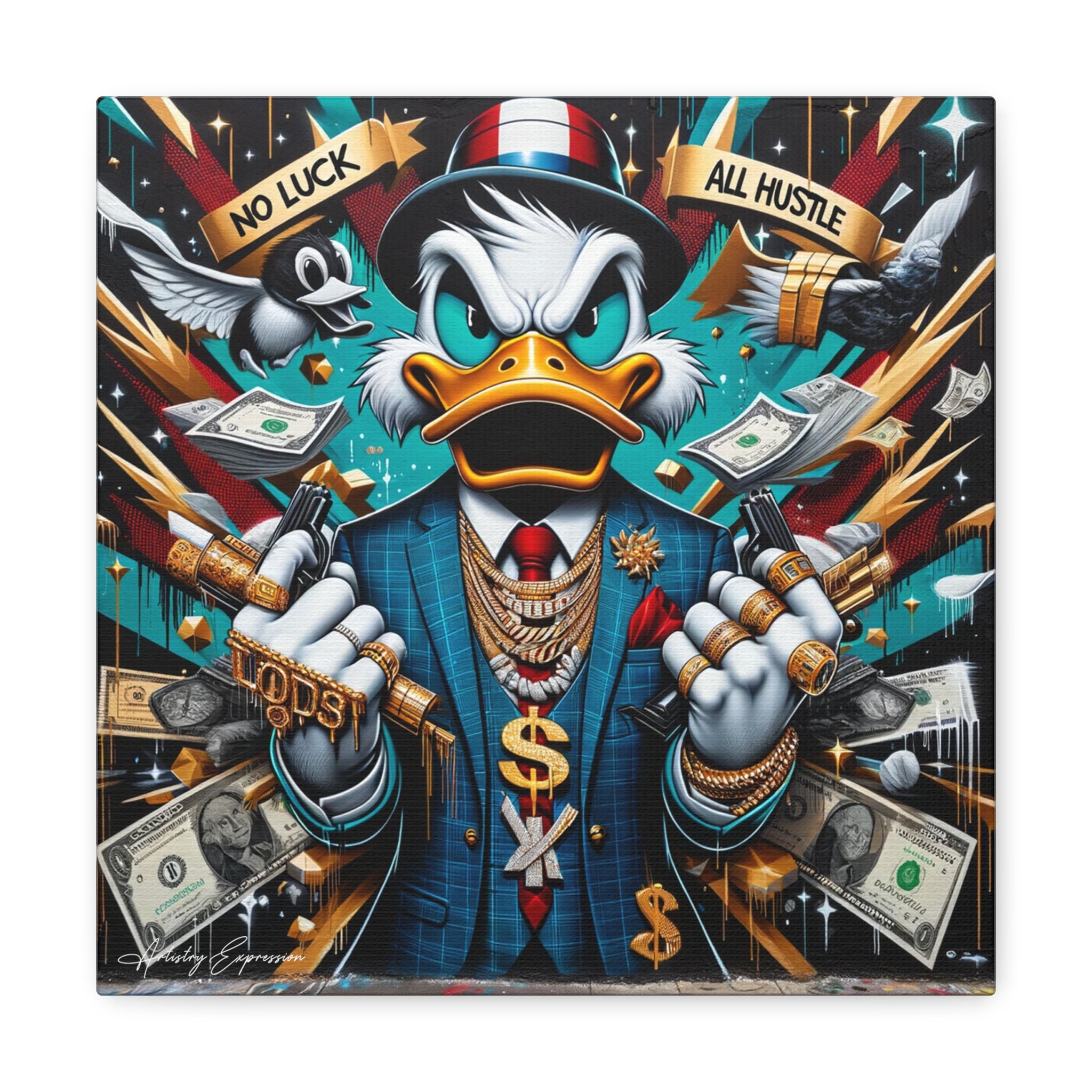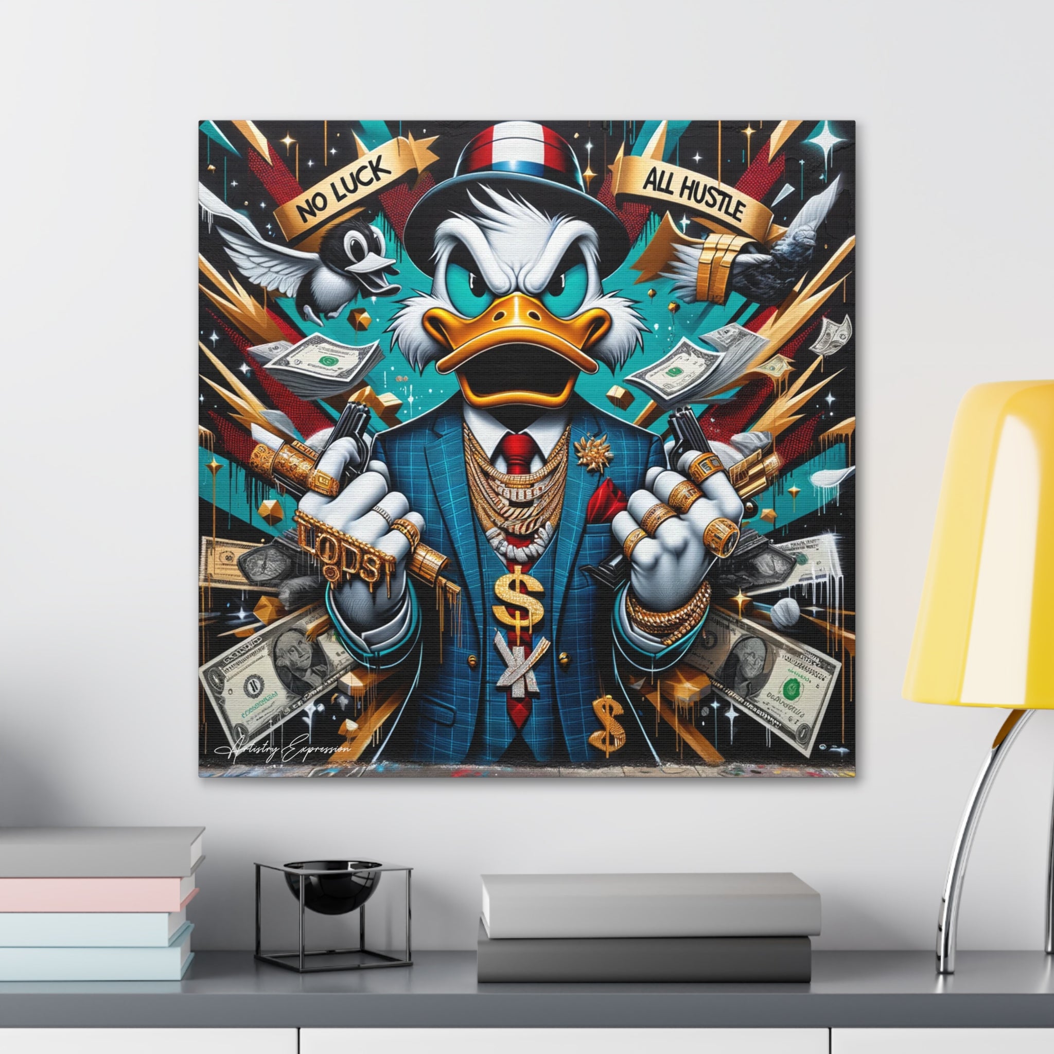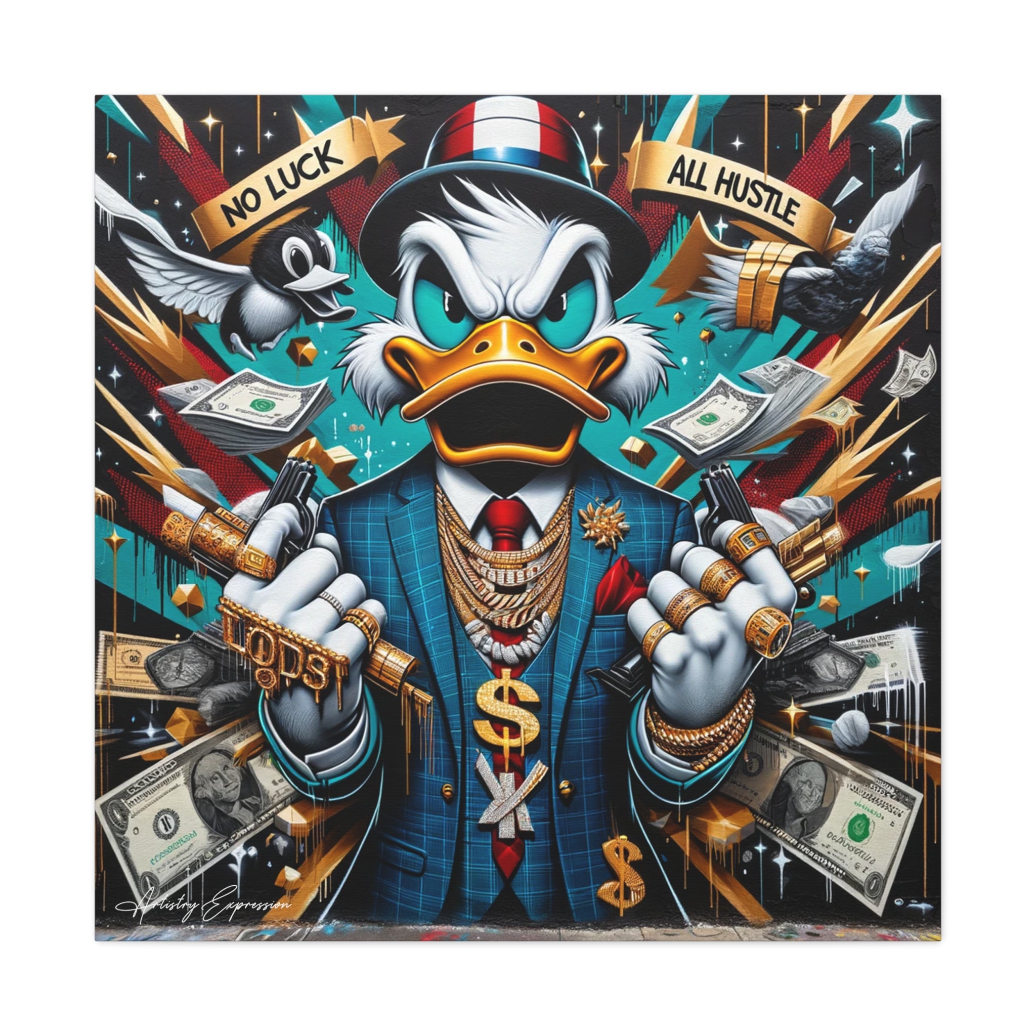 Gangsta-style graffiti featuring Donald Duck in a rebellious urban setting. Bold colors, gold accents, and dollar symbols convey determination and ambition amidst a graffiti-covered backdrop.