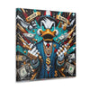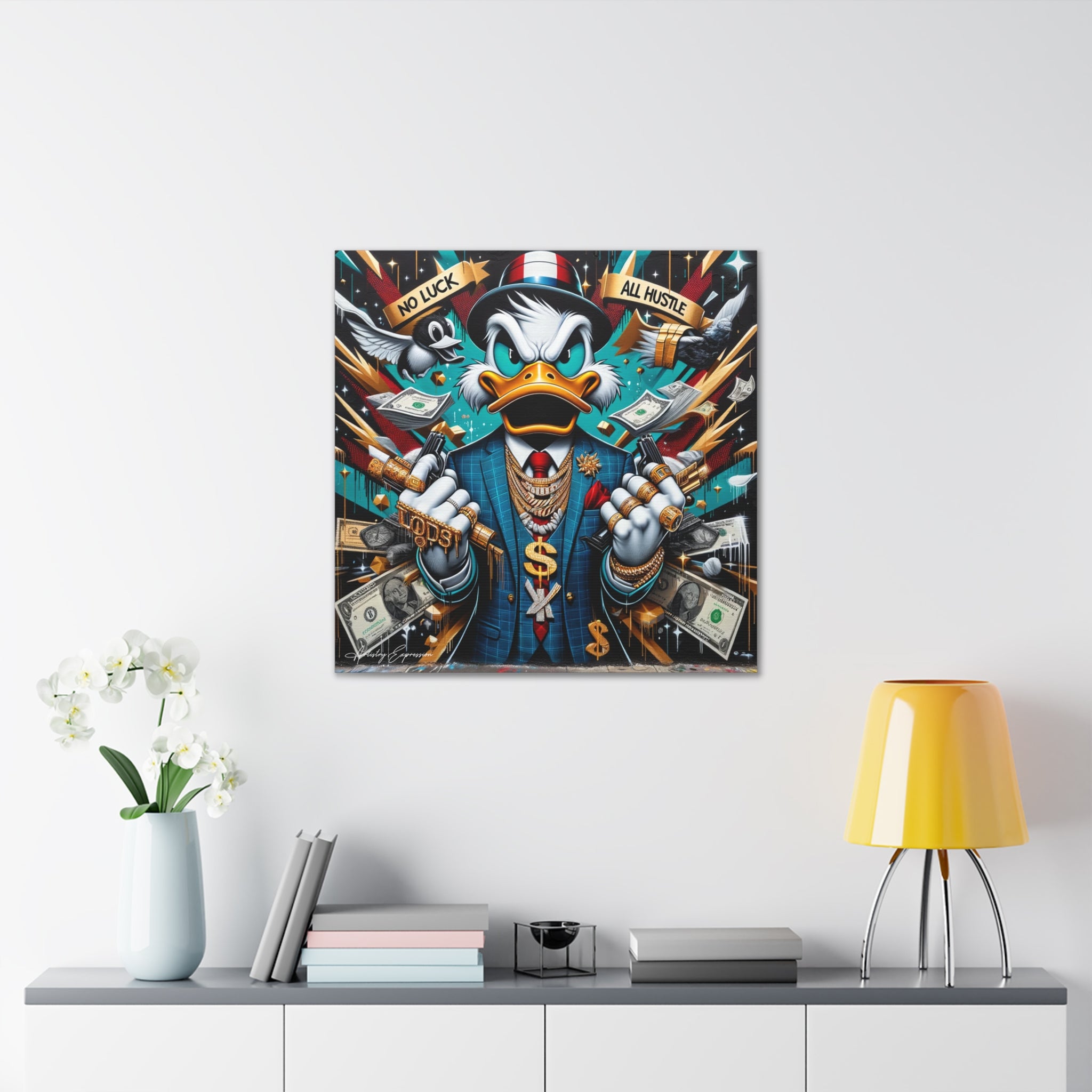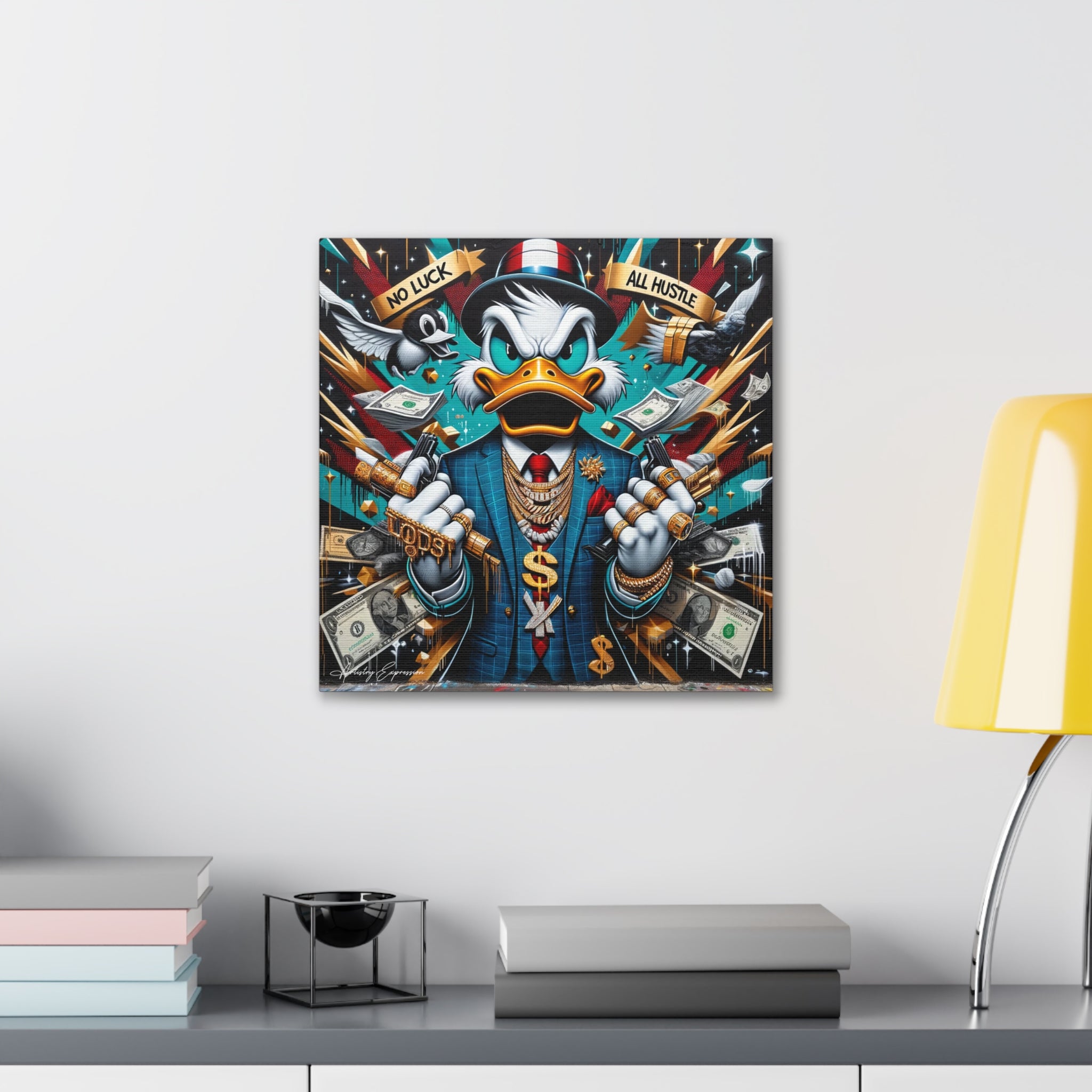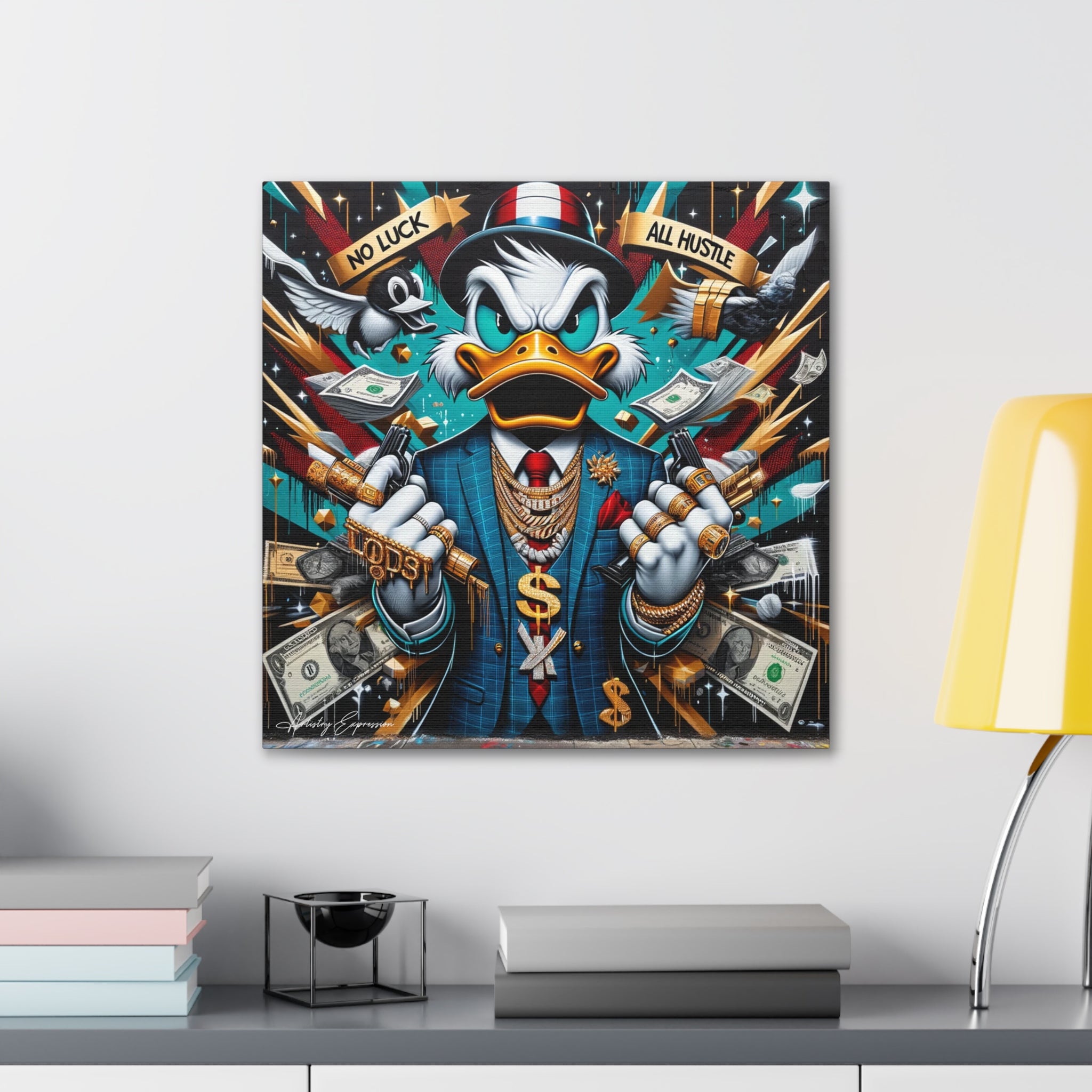 Gangsta-style graffiti featuring Donald Duck in a rebellious urban setting. Bold colors, gold accents, and dollar symbols convey determination and ambition amidst a graffiti-covered backdrop.