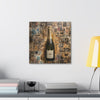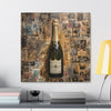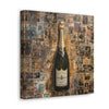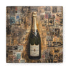 A dense and intricate artistic montage evoking opulence and excess. Centered around a label of Dom Pérignon Champagne 2008, surrounded by words and images celebrating wealth and luxurious lifestyle. The background collage features banknotes, lion imagery, partying silhouettes, and cinematic references, reminiscent of "The Wolf of Wall Street".