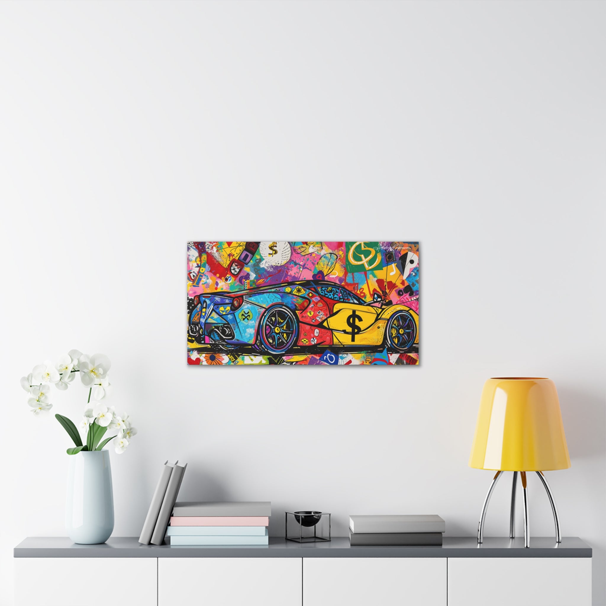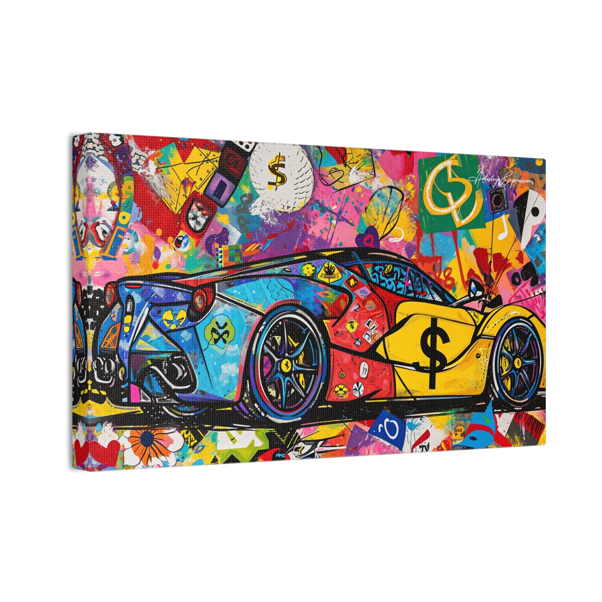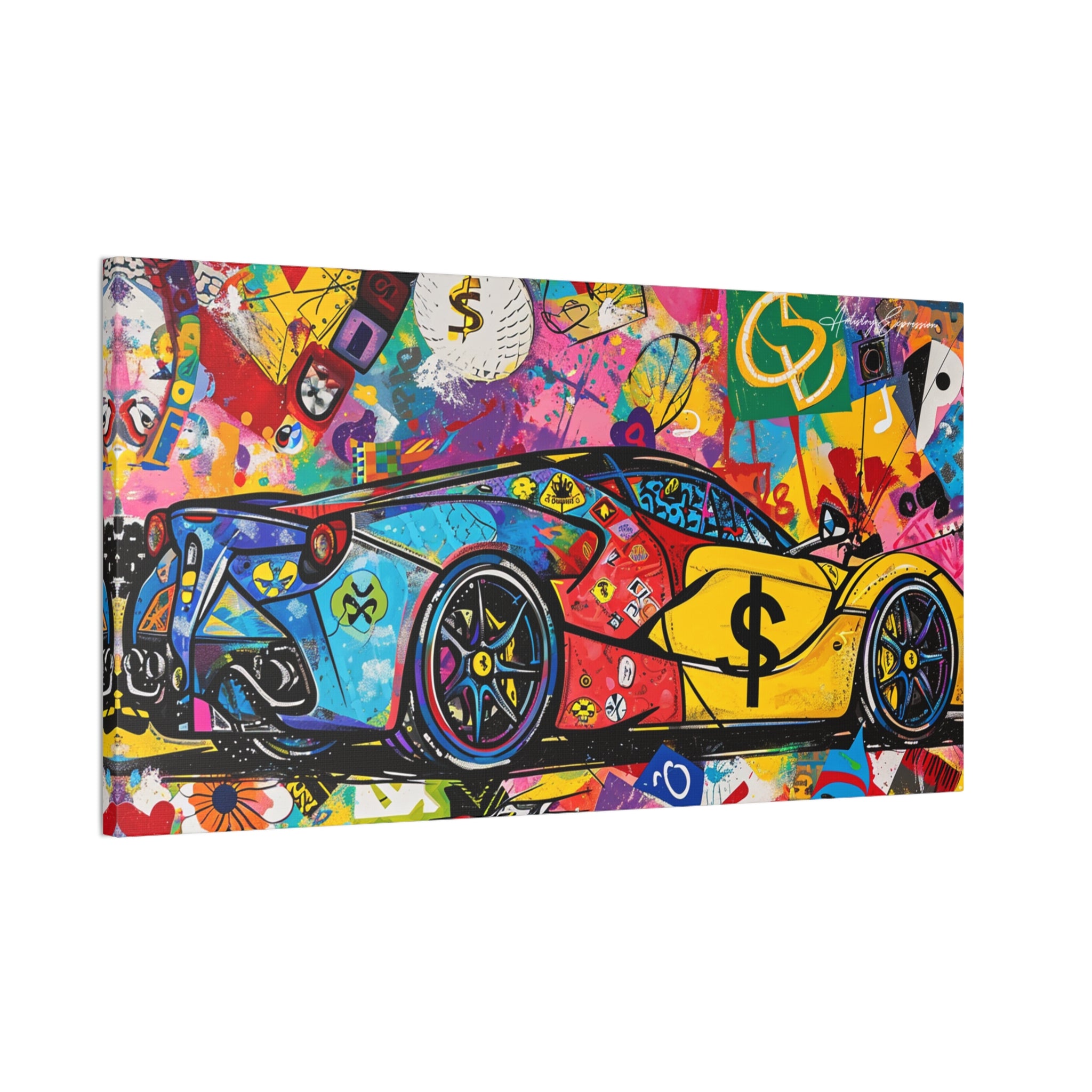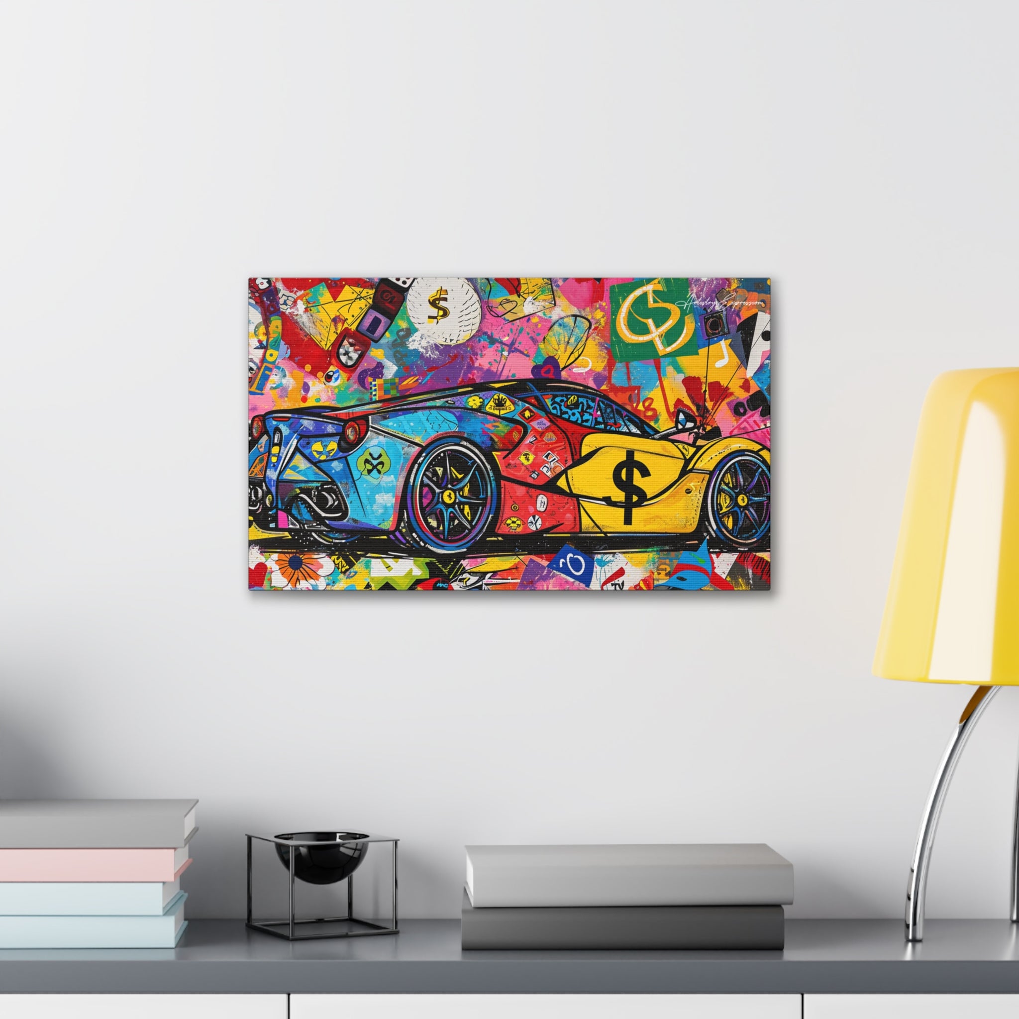 This vibrant artwork captures the fusion of speed, opulence, and financial prosperity in a colorful urban setting.