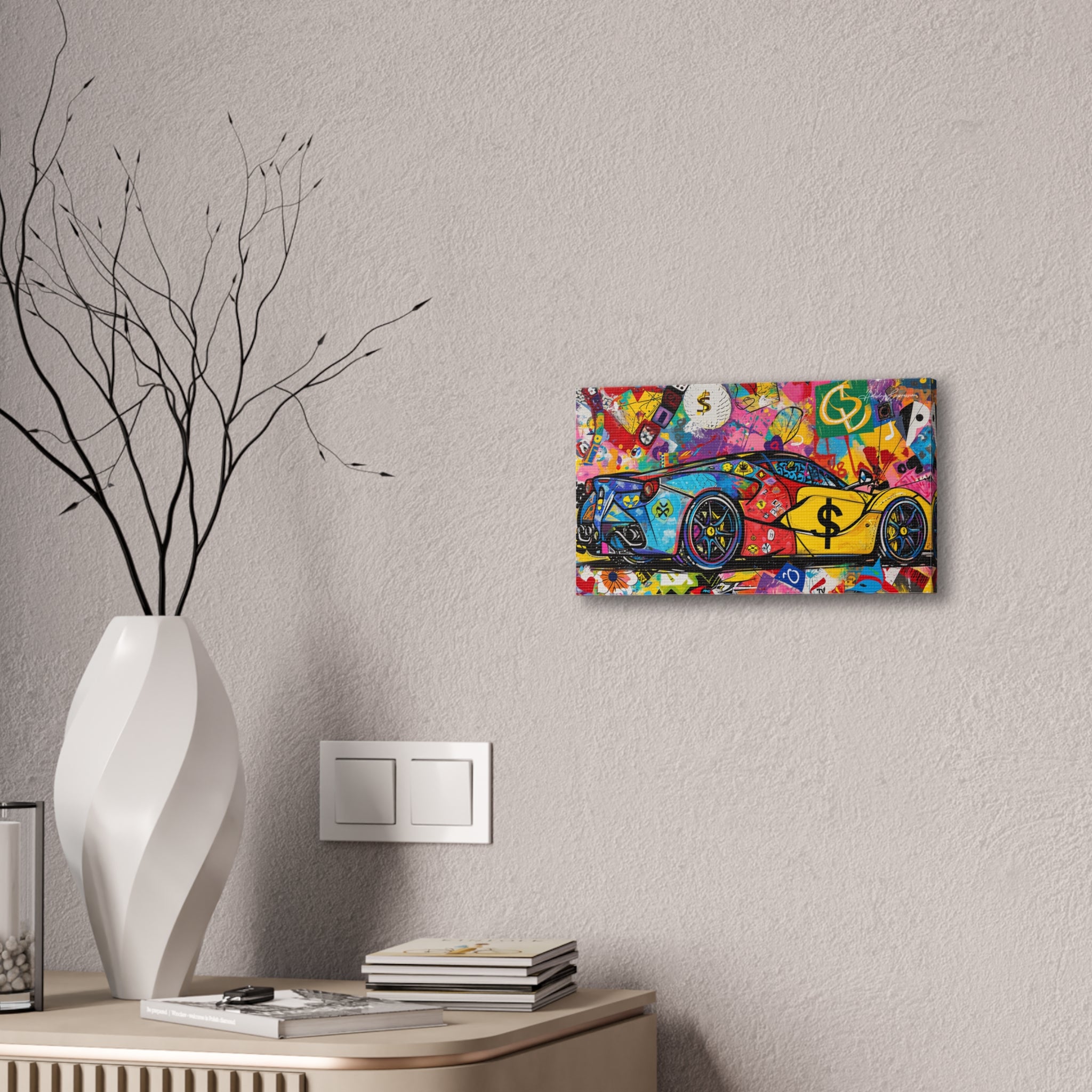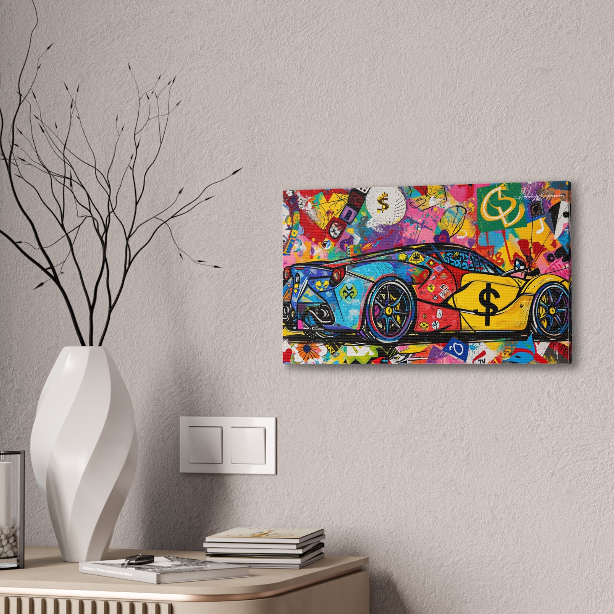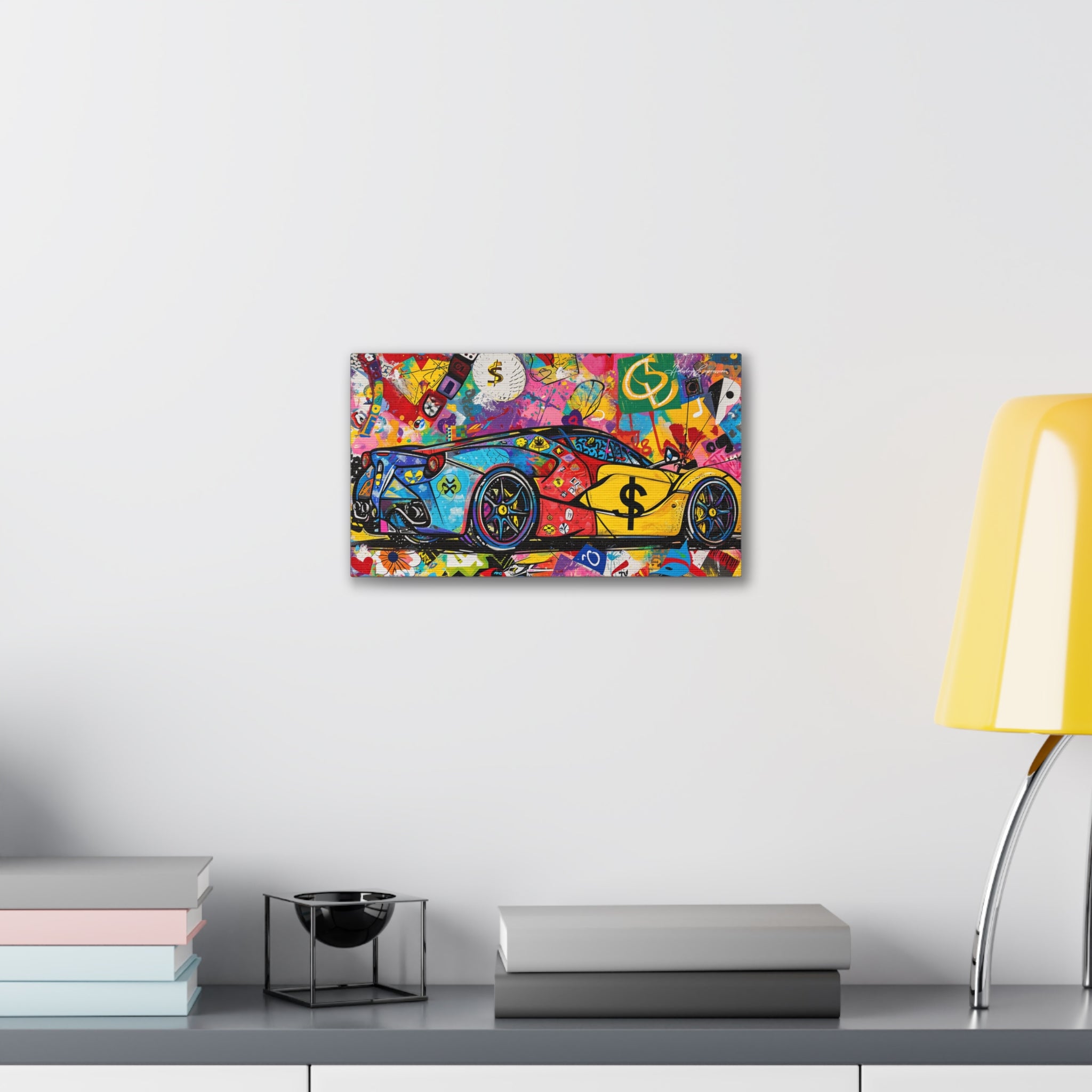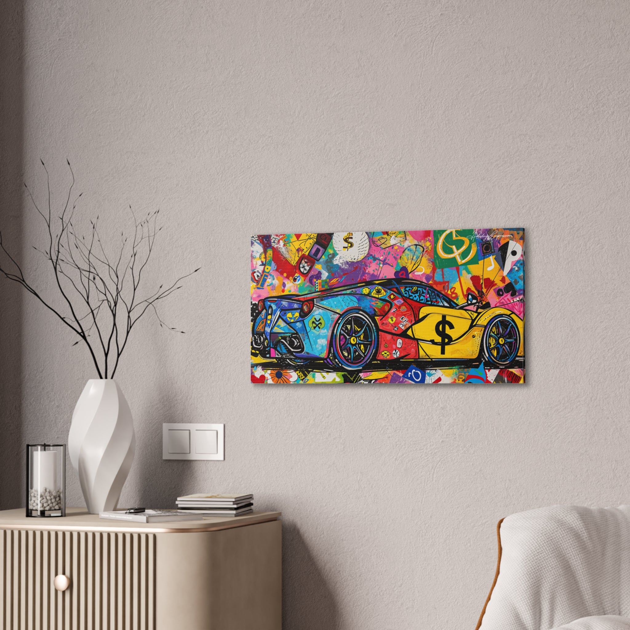 This vibrant artwork captures the fusion of speed, opulence, and financial prosperity in a colorful urban setting.