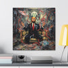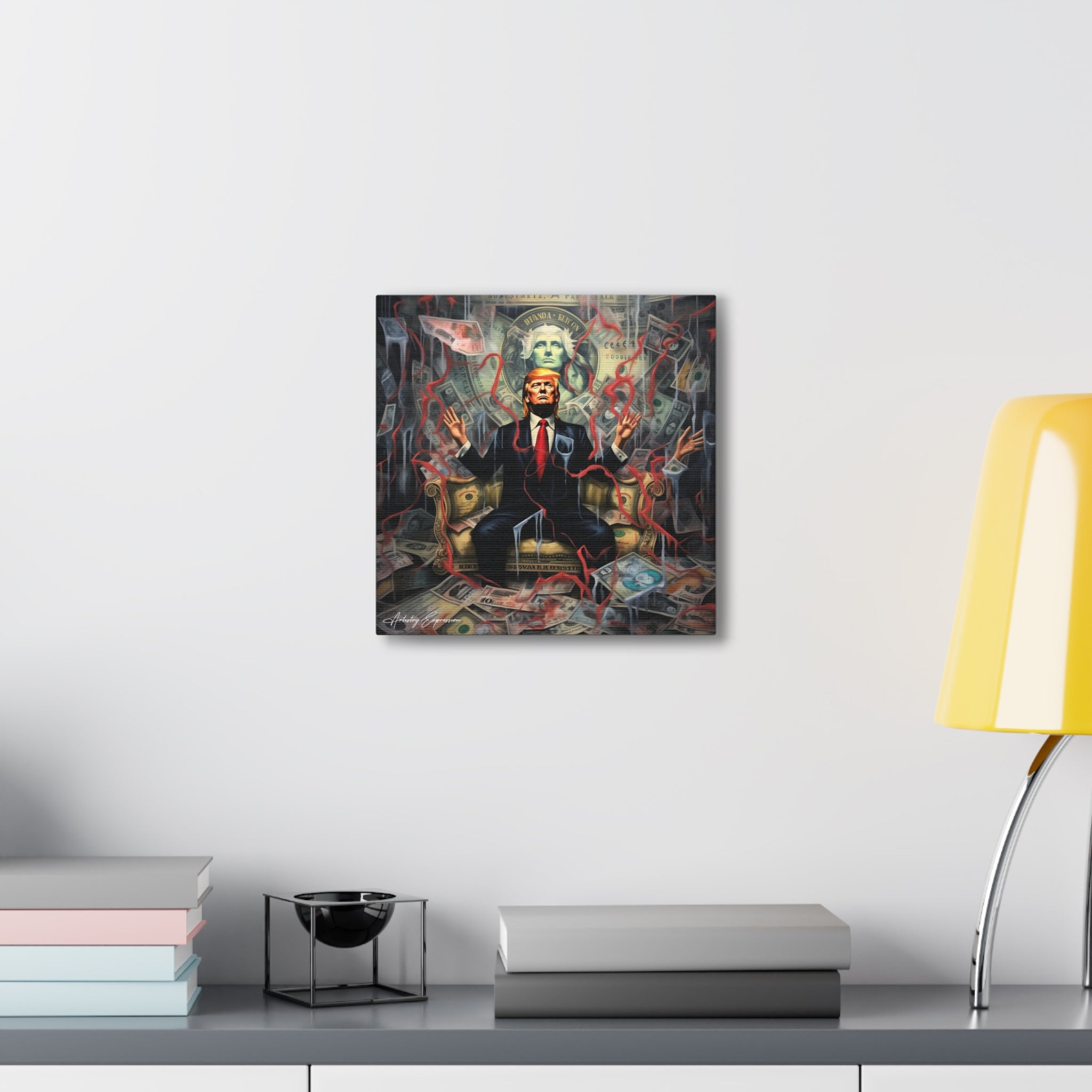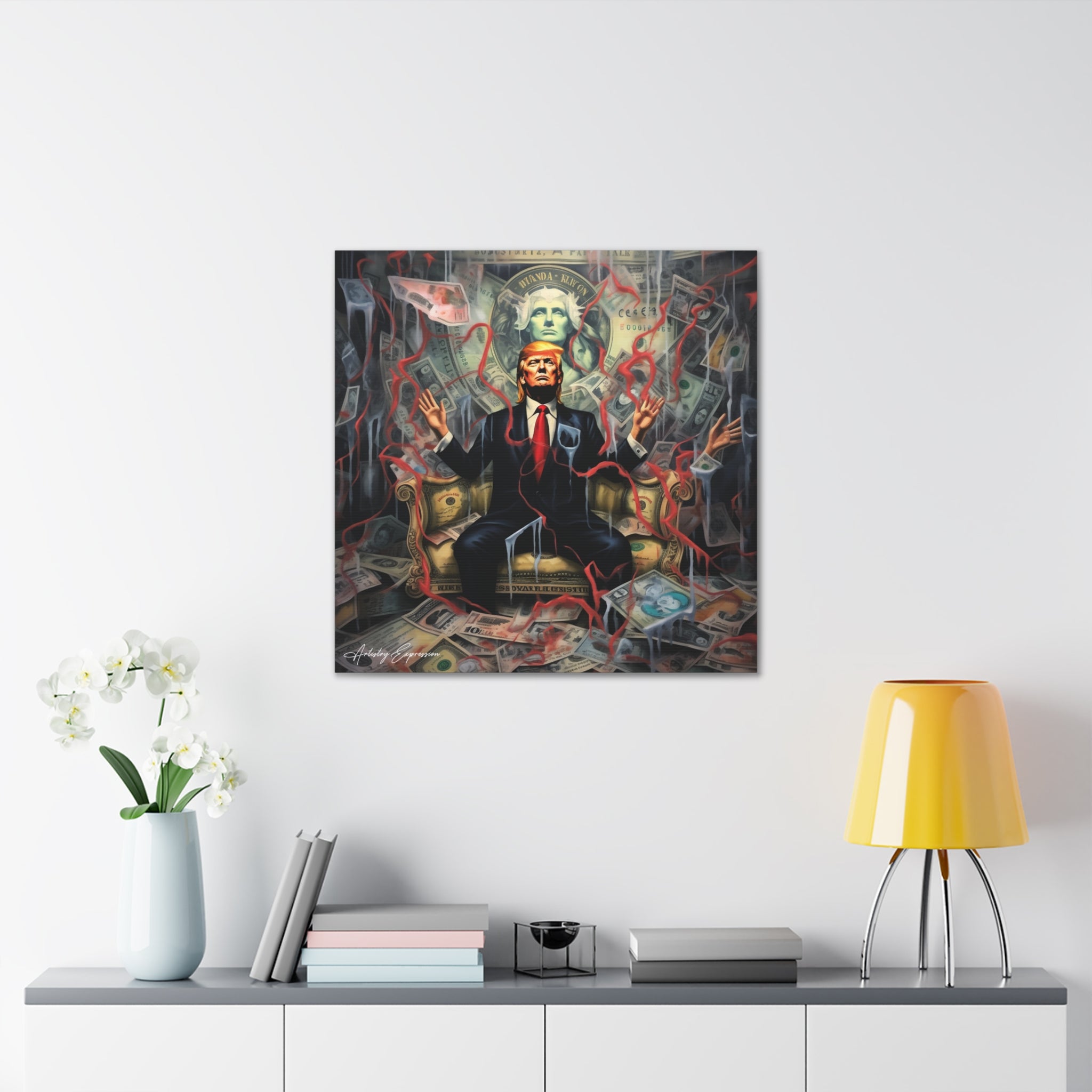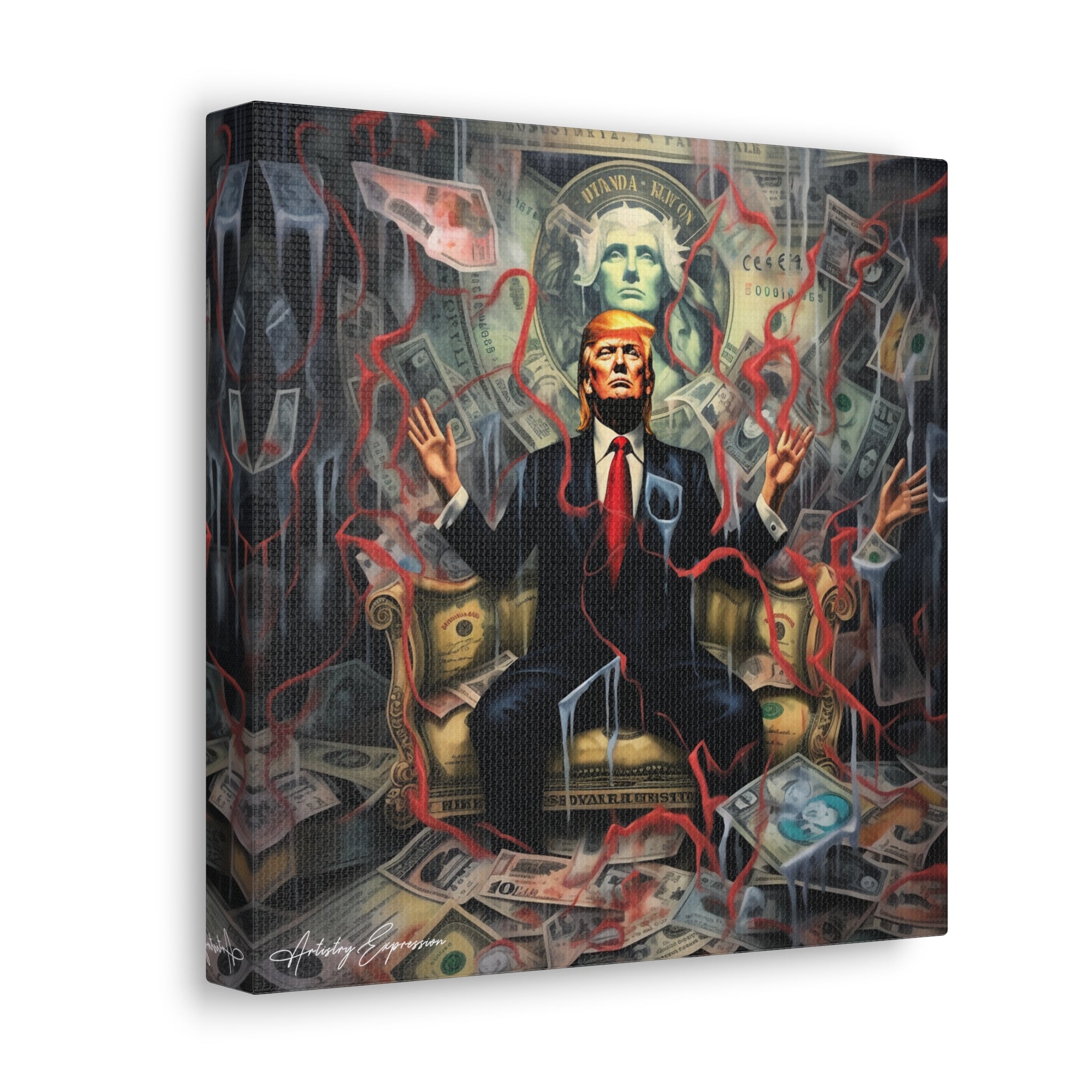 A bold graffiti artwork featuring a portrait of Donald Trump adorned with dollar money papers in the background.
