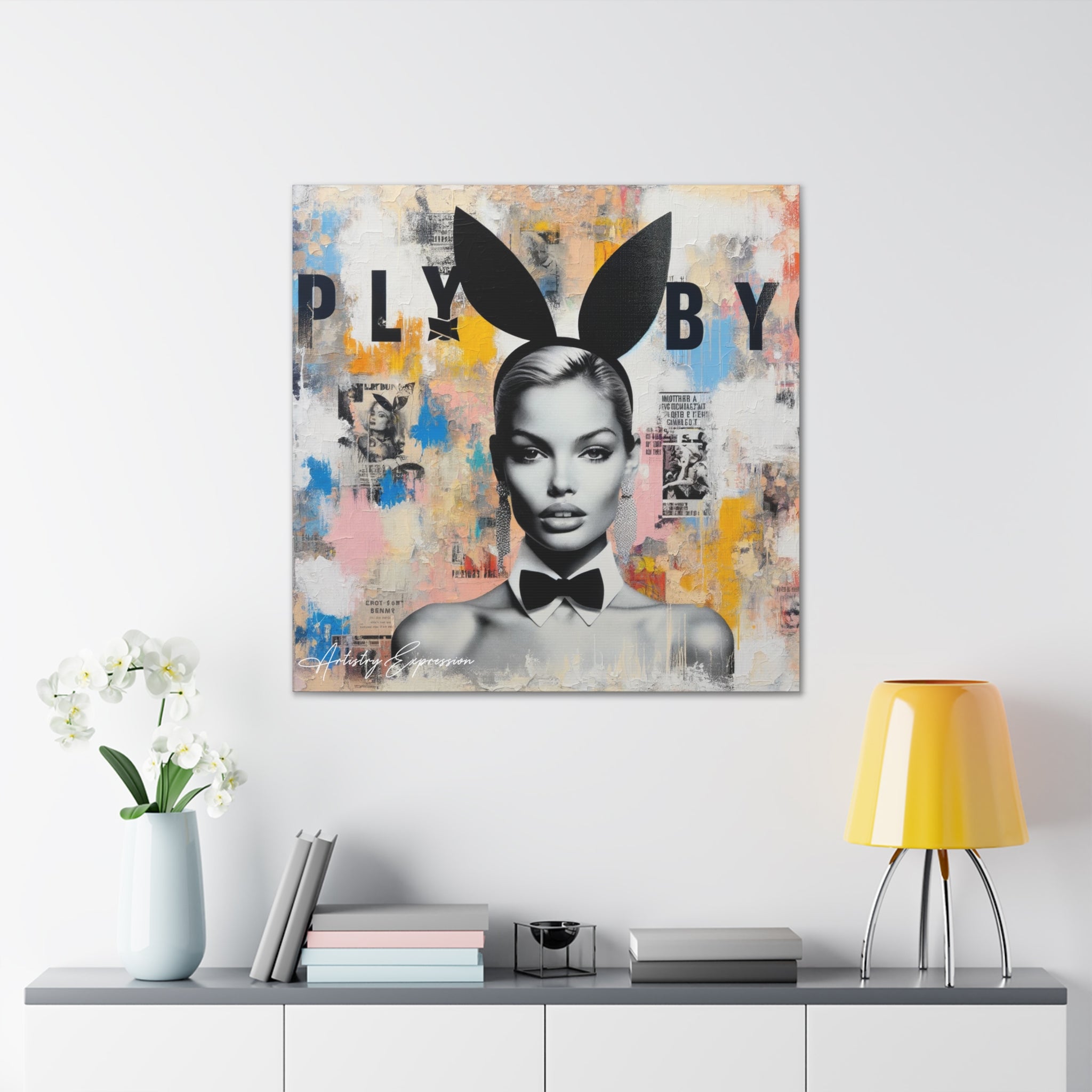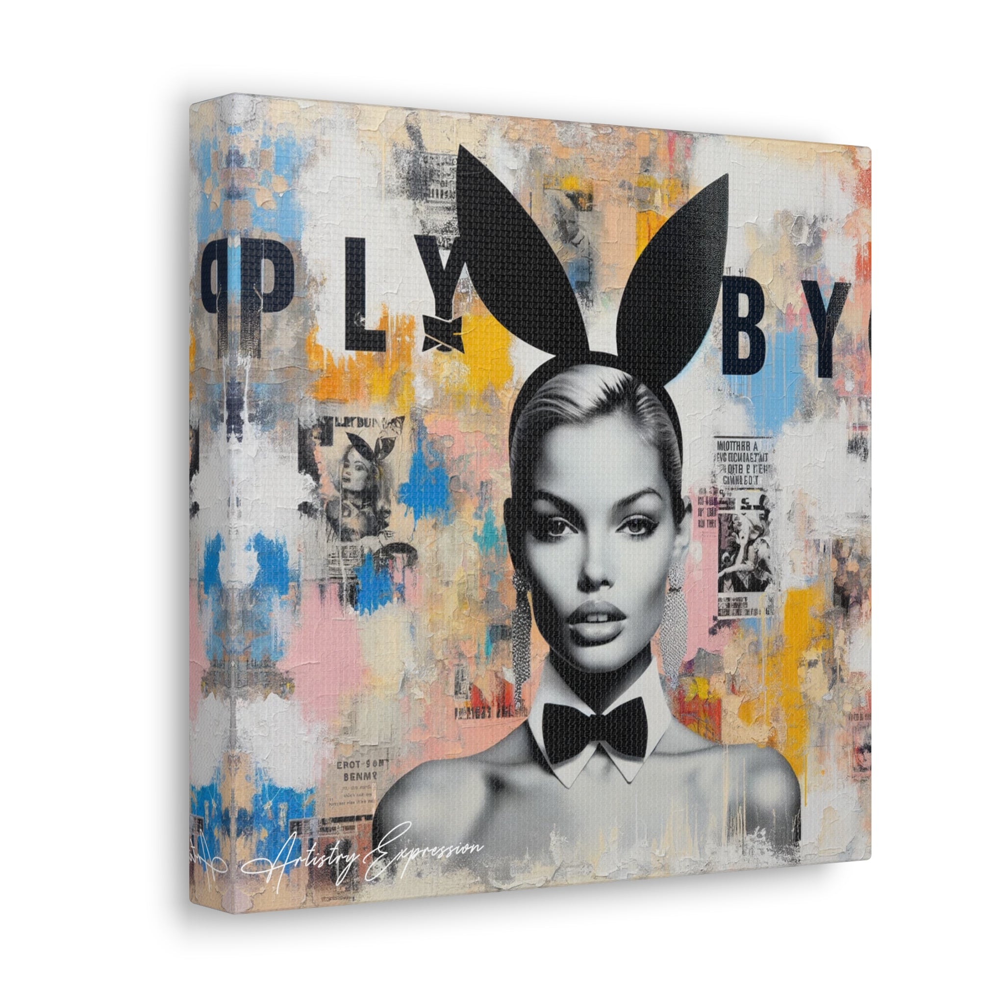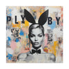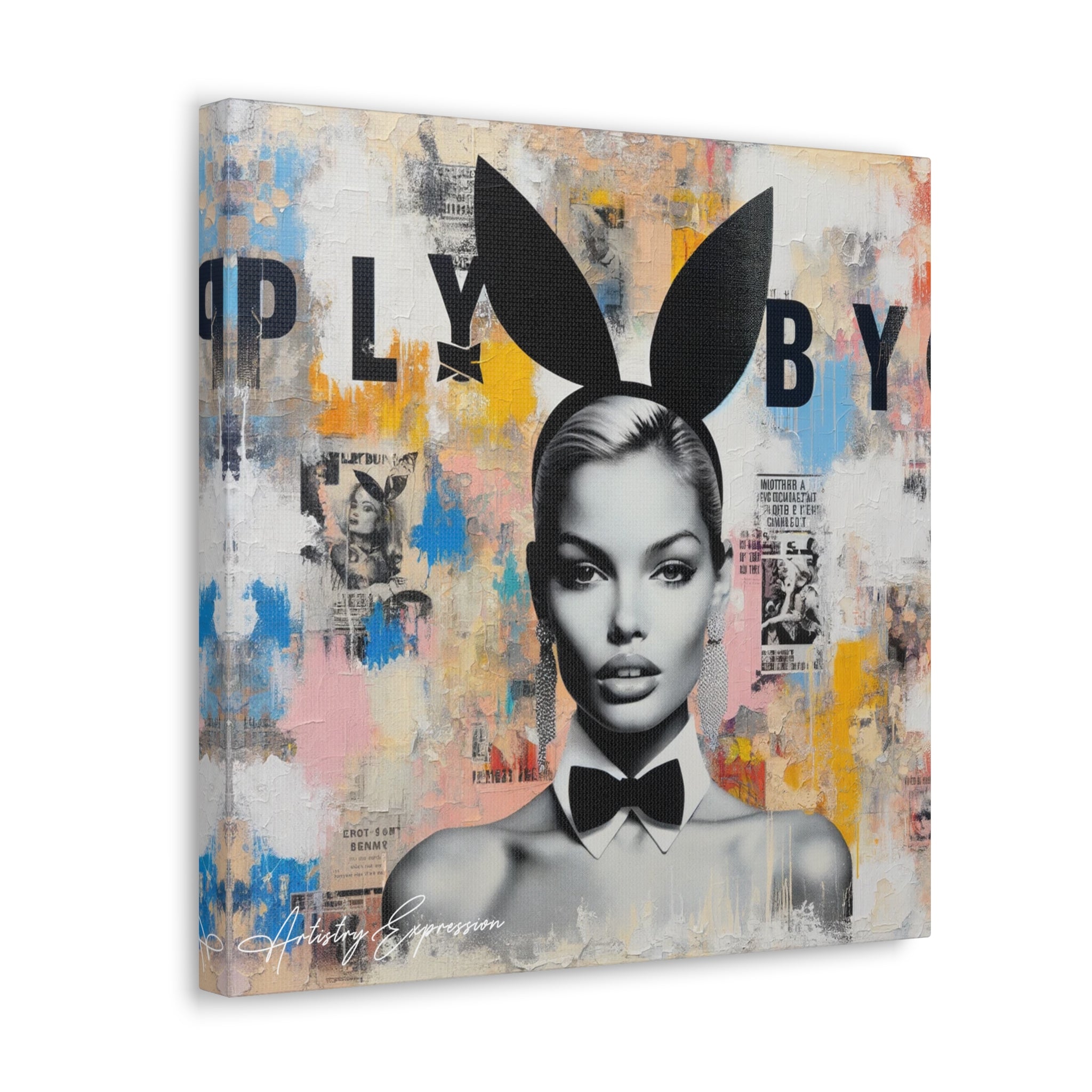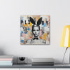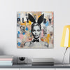 This artwork combines high fashion allure with gritty street art. A fashion model stands out against a vibrant backdrop of colors and textures. It symbolizes the interplay between public personas and private realities, reflecting on the complexities of fame and fashion.