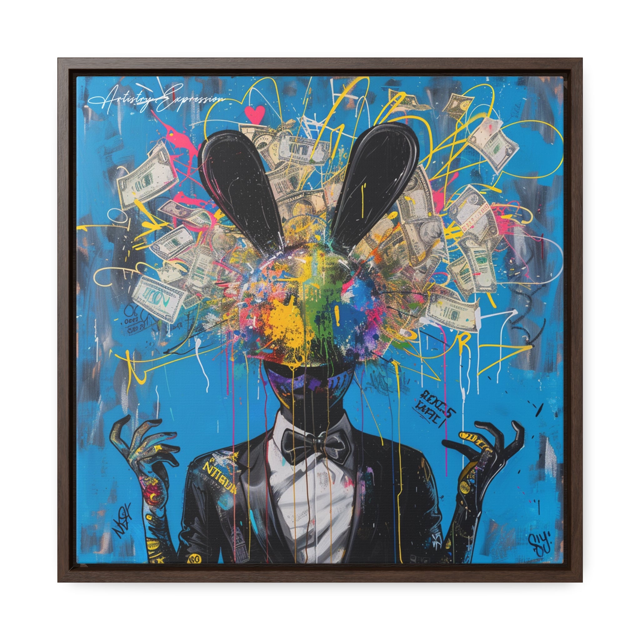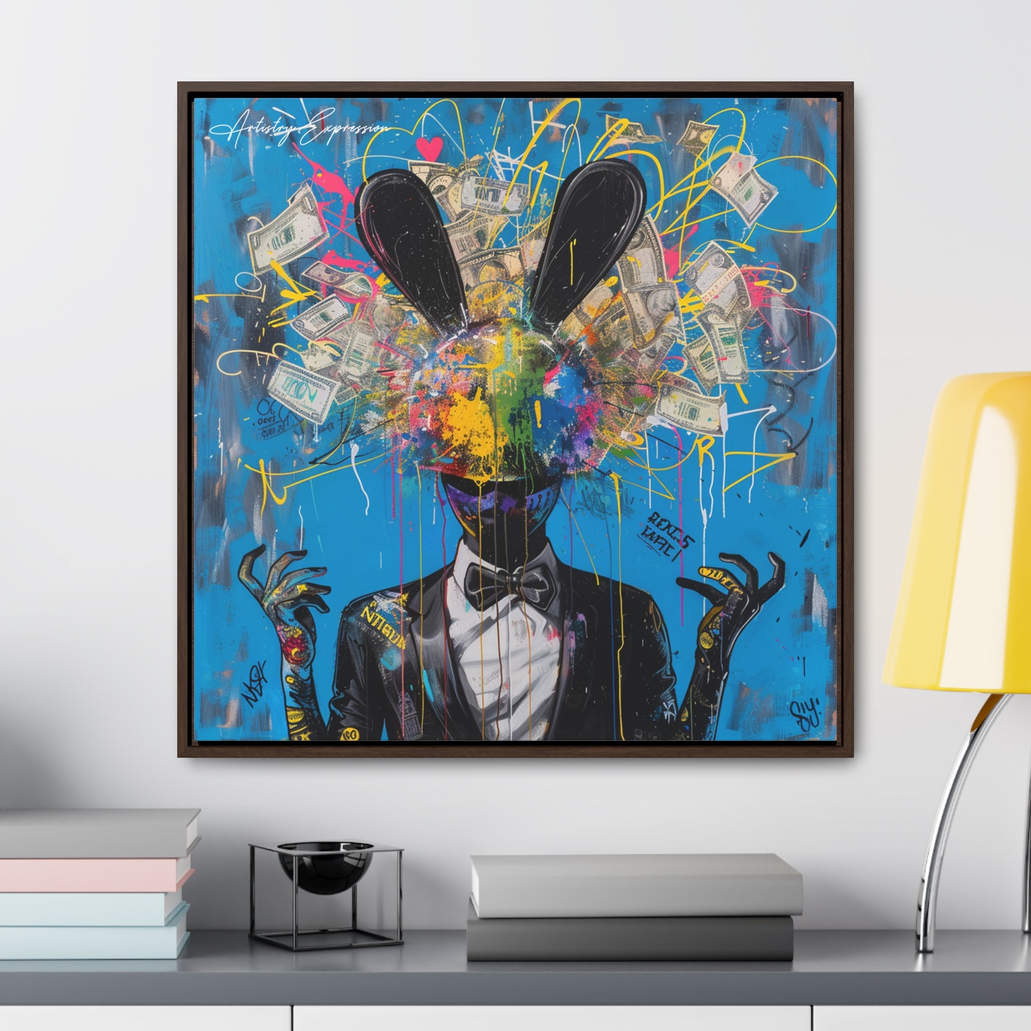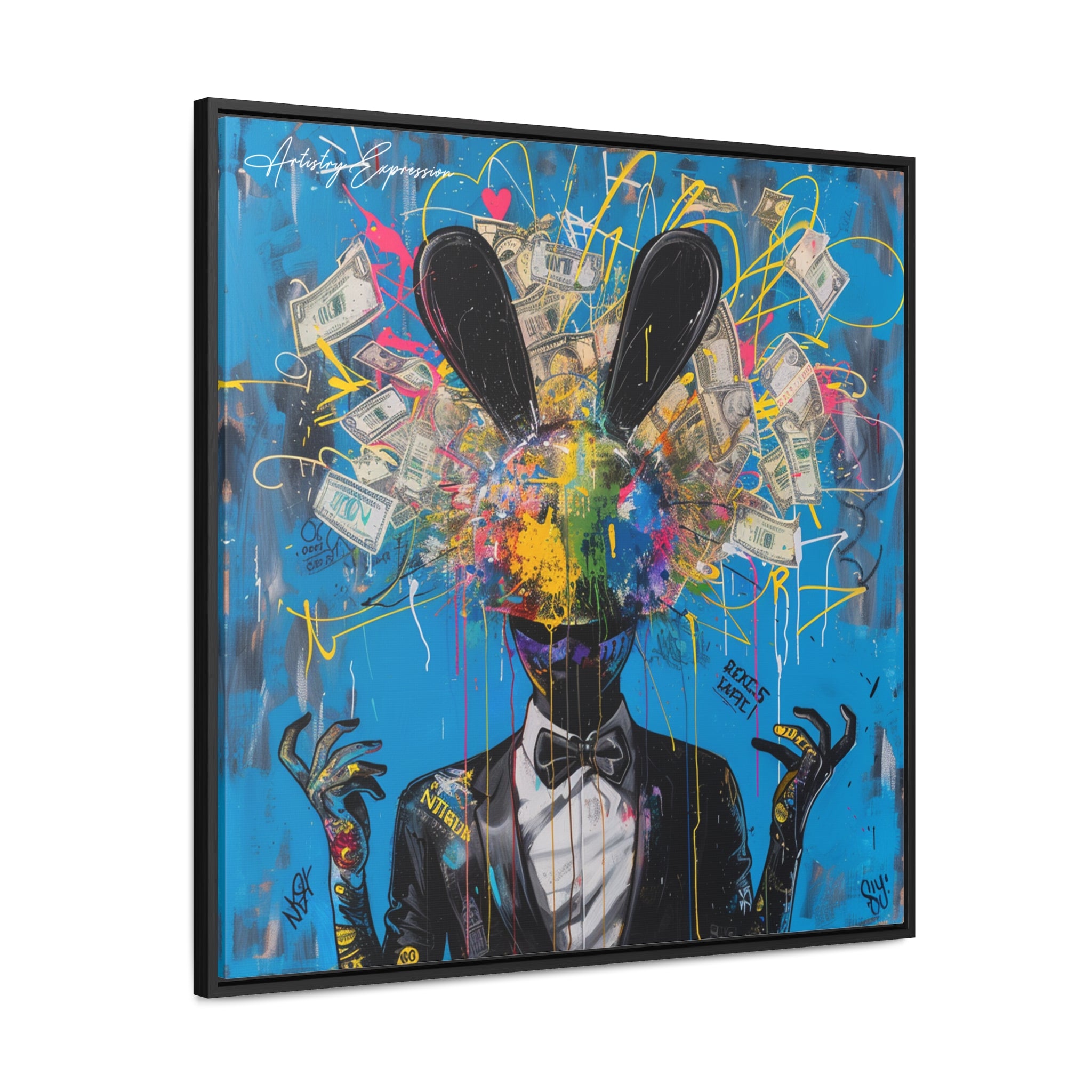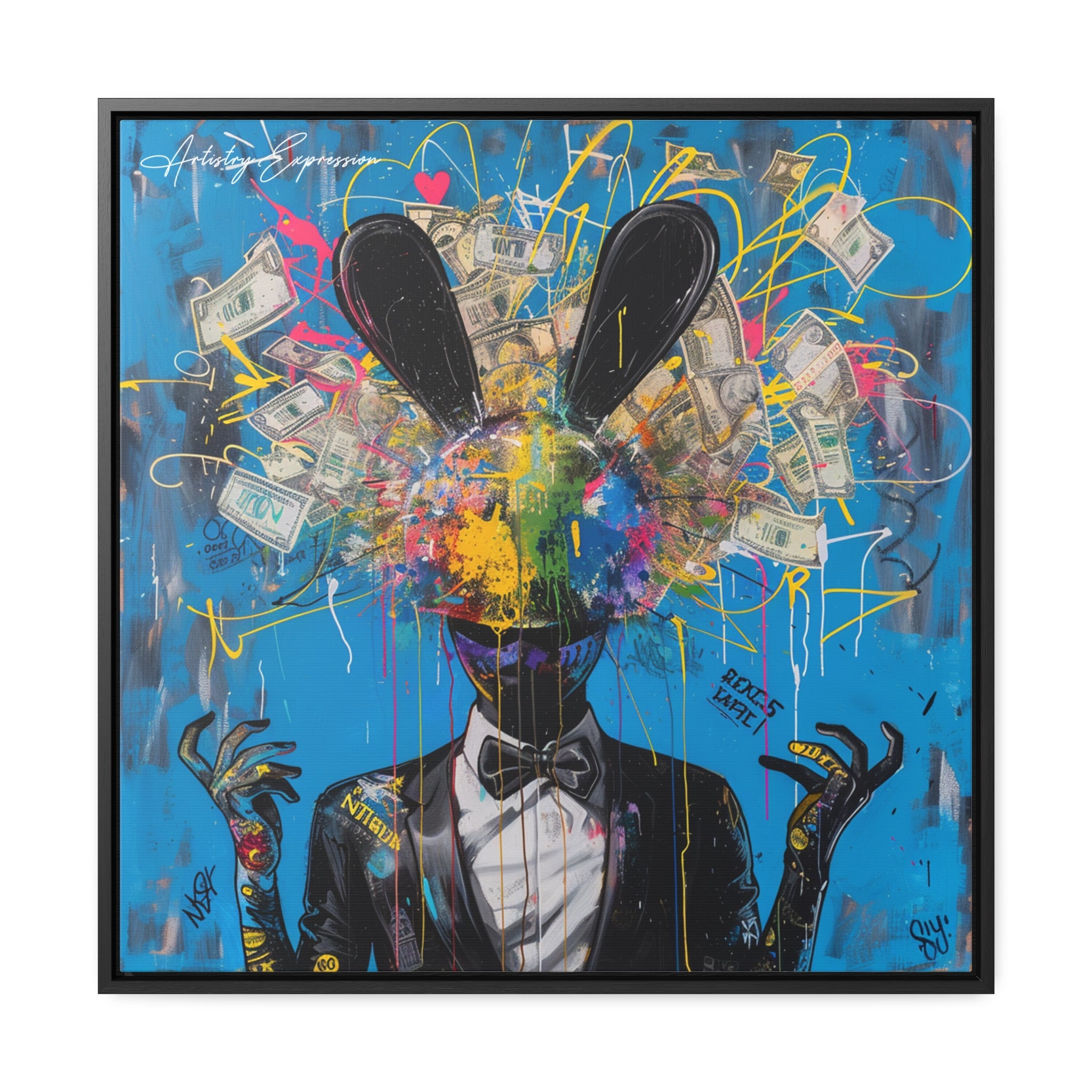 This vibrant artwork captures the spirit of street art with its dynamic composition and bold use of color. Featuring a mysterious figure adorned in rainbow hues against a backdrop of urban graffiti, the piece invites viewers to explore the intersection of art, identity, and commerce. With mischievous rabbit ears and hovering dollar signs, it offers a playful yet satirical commentary on contemporary culture.