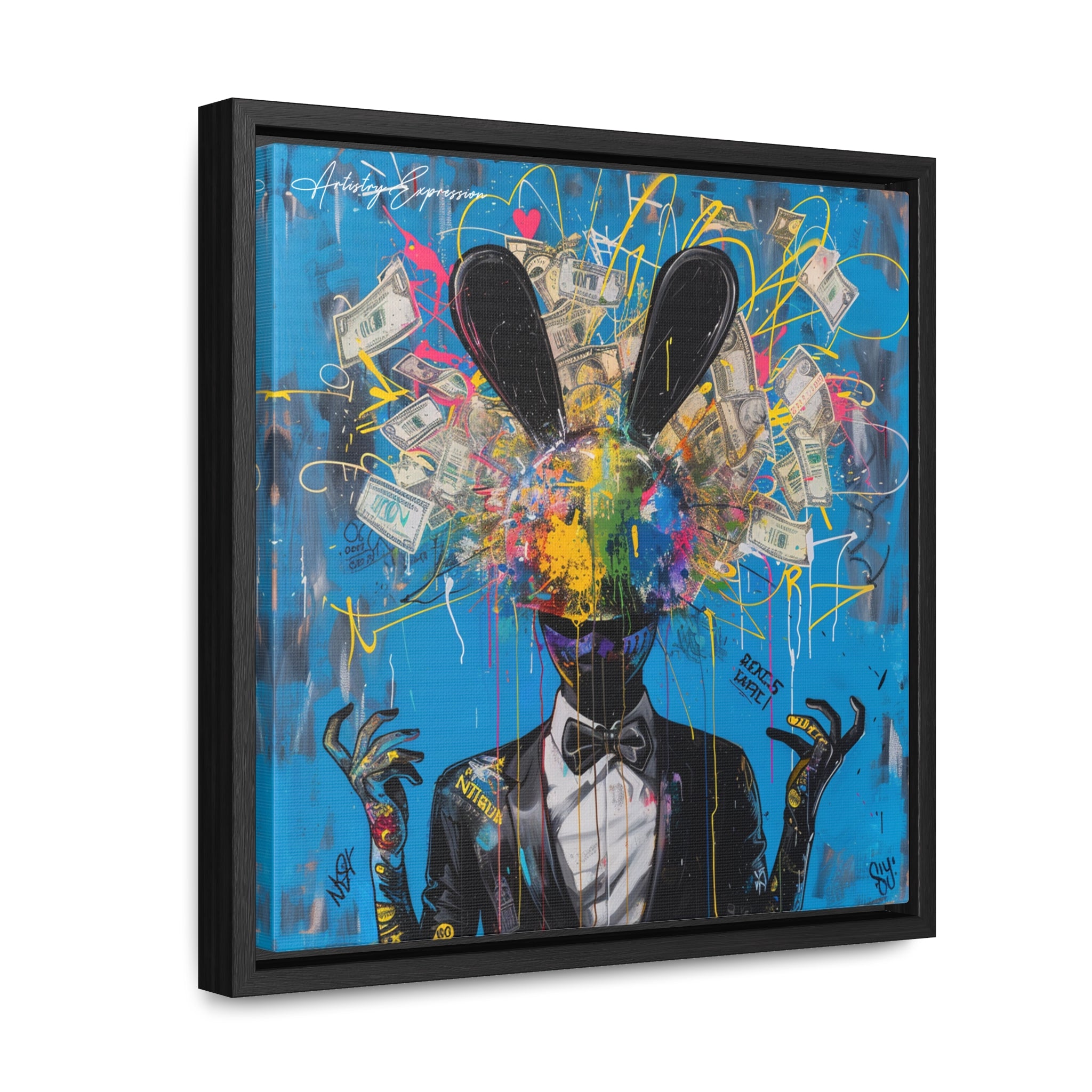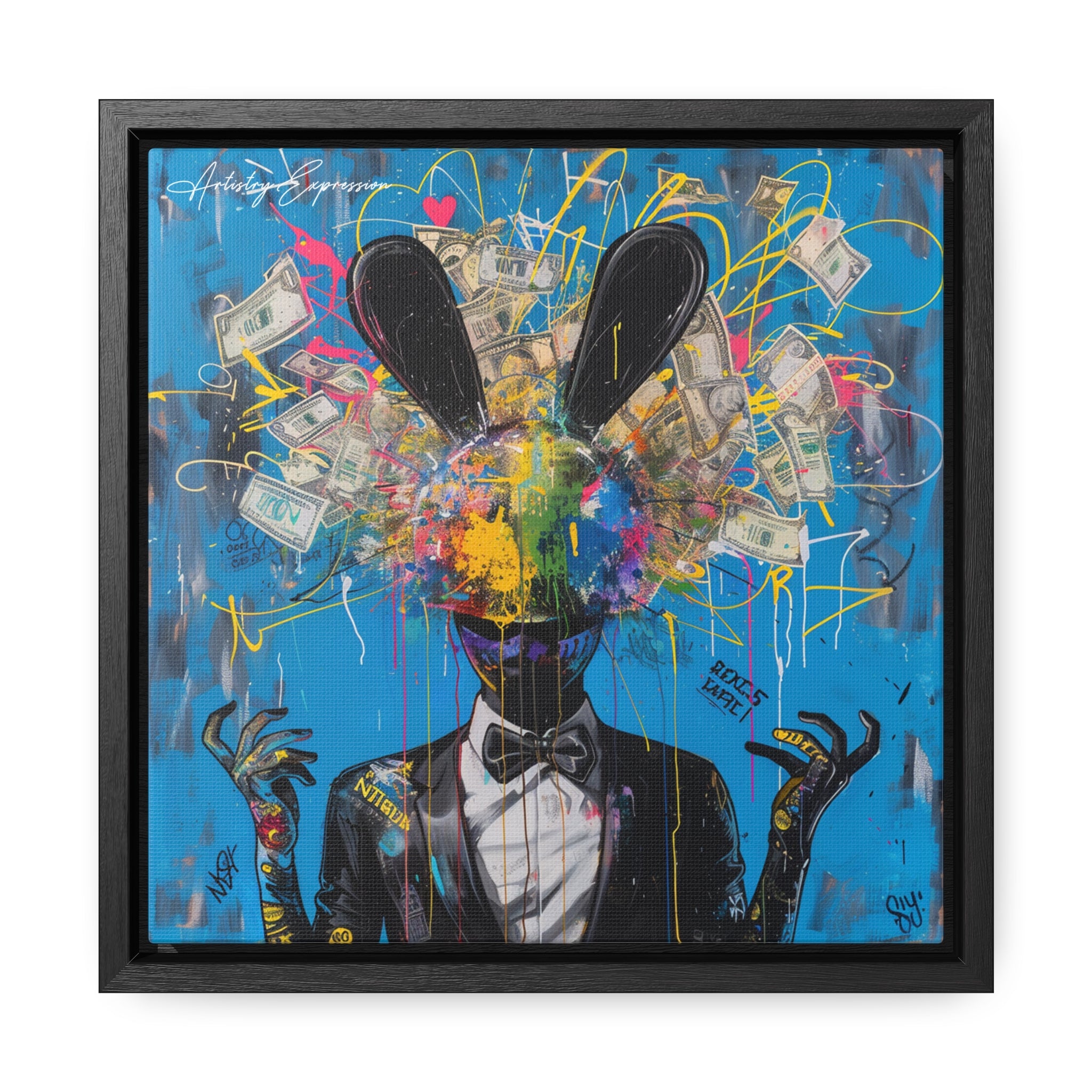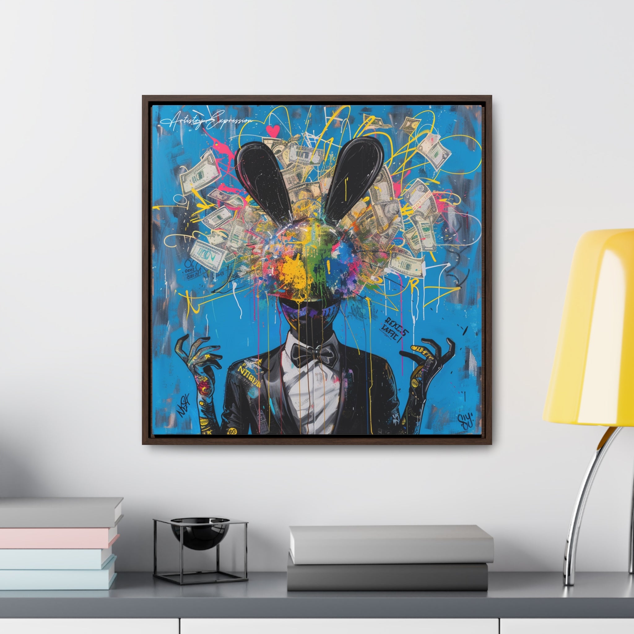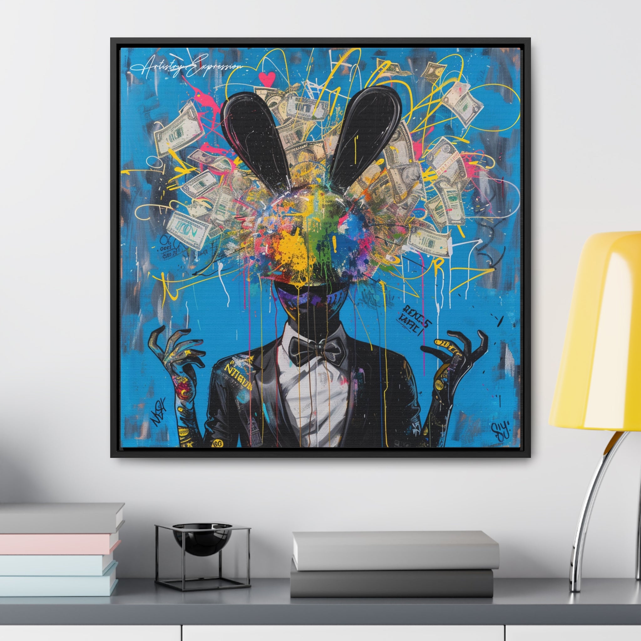 This vibrant artwork captures the spirit of street art with its dynamic composition and bold use of color. Featuring a mysterious figure adorned in rainbow hues against a backdrop of urban graffiti, the piece invites viewers to explore the intersection of art, identity, and commerce. With mischievous rabbit ears and hovering dollar signs, it offers a playful yet satirical commentary on contemporary culture.