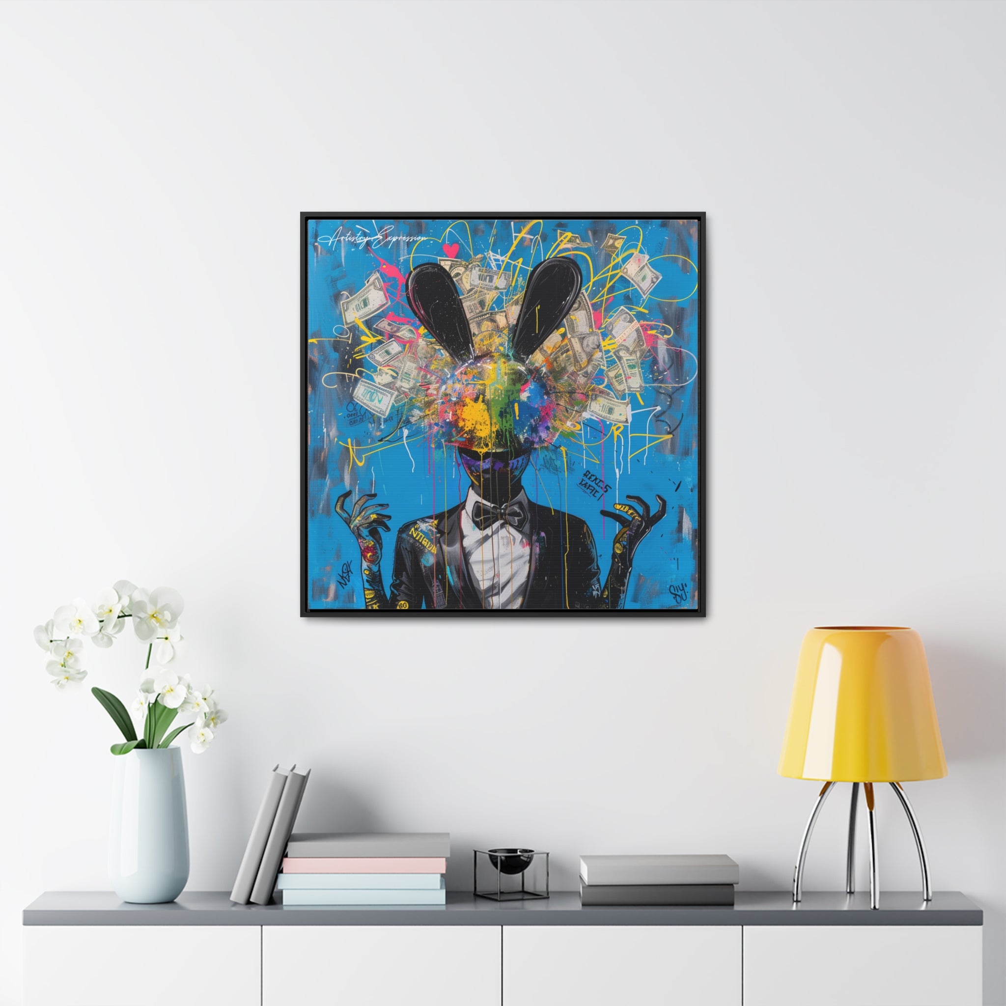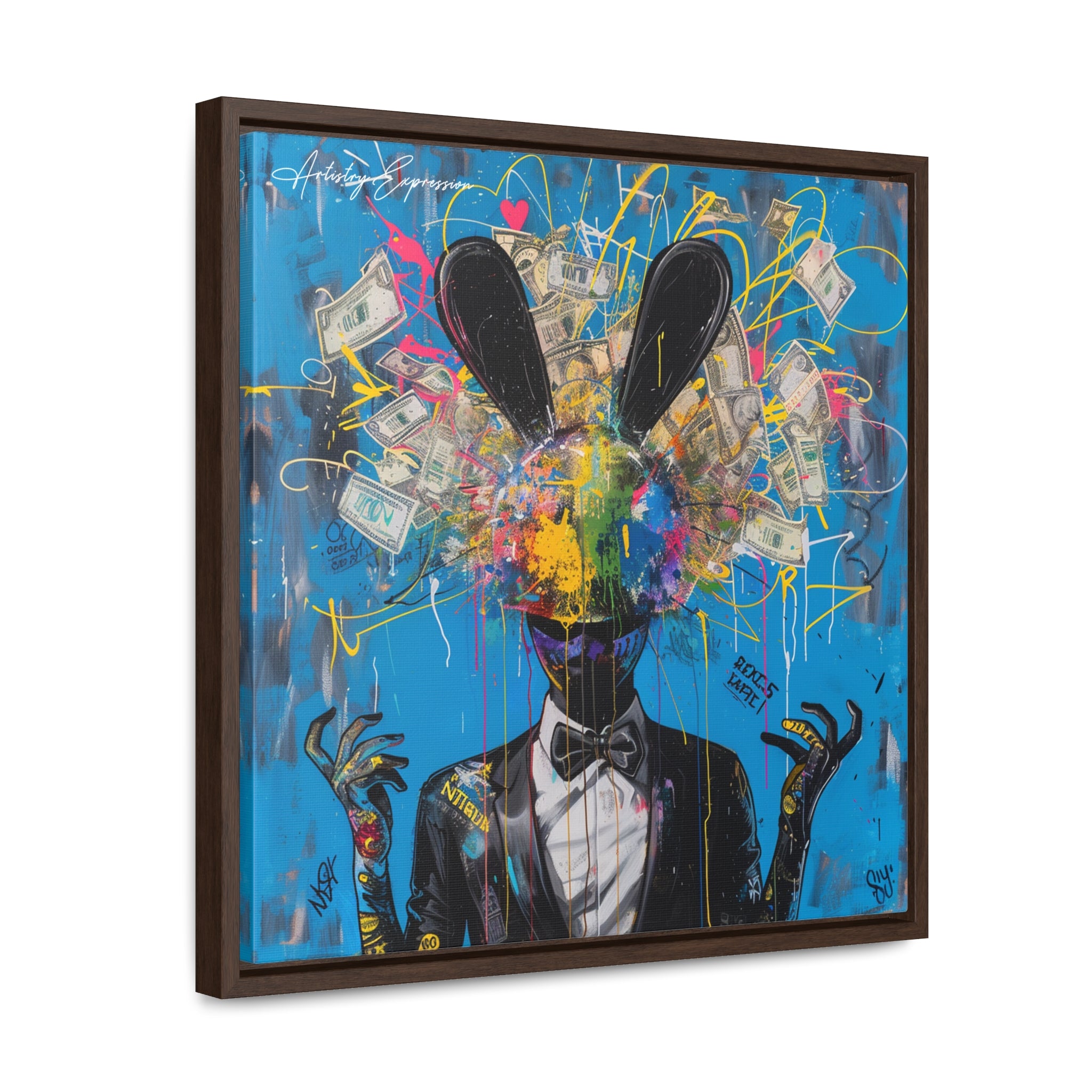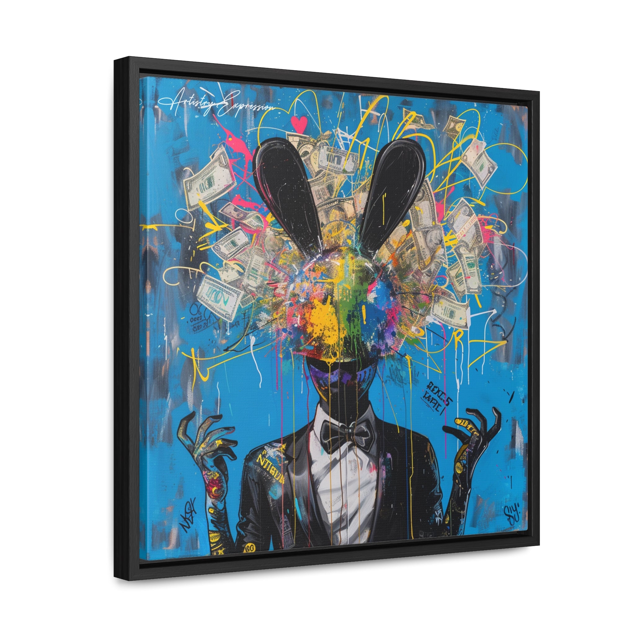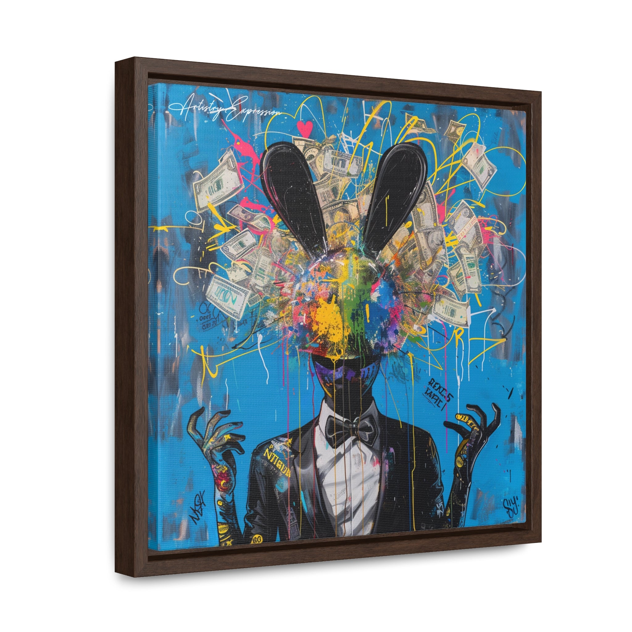 This vibrant artwork captures the spirit of street art with its dynamic composition and bold use of color. Featuring a mysterious figure adorned in rainbow hues against a backdrop of urban graffiti, the piece invites viewers to explore the intersection of art, identity, and commerce. With mischievous rabbit ears and hovering dollar signs, it offers a playful yet satirical commentary on contemporary culture.