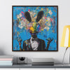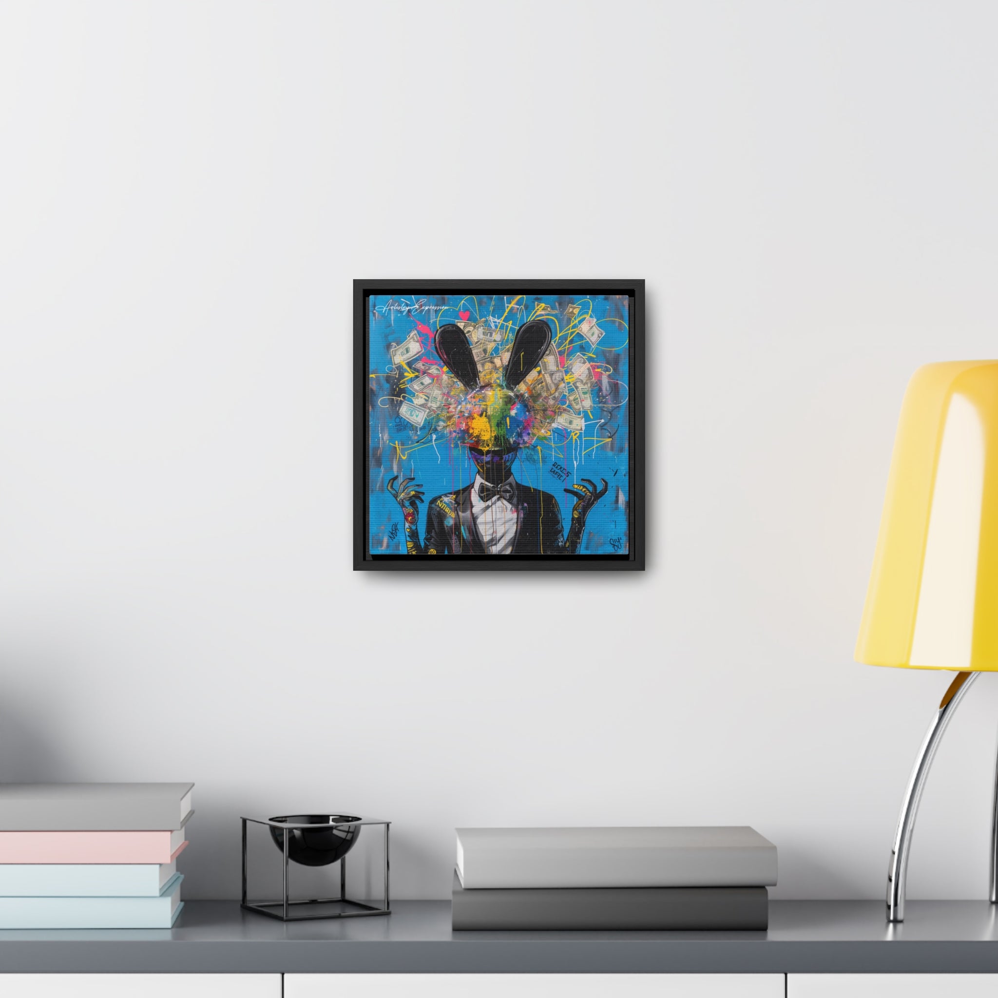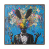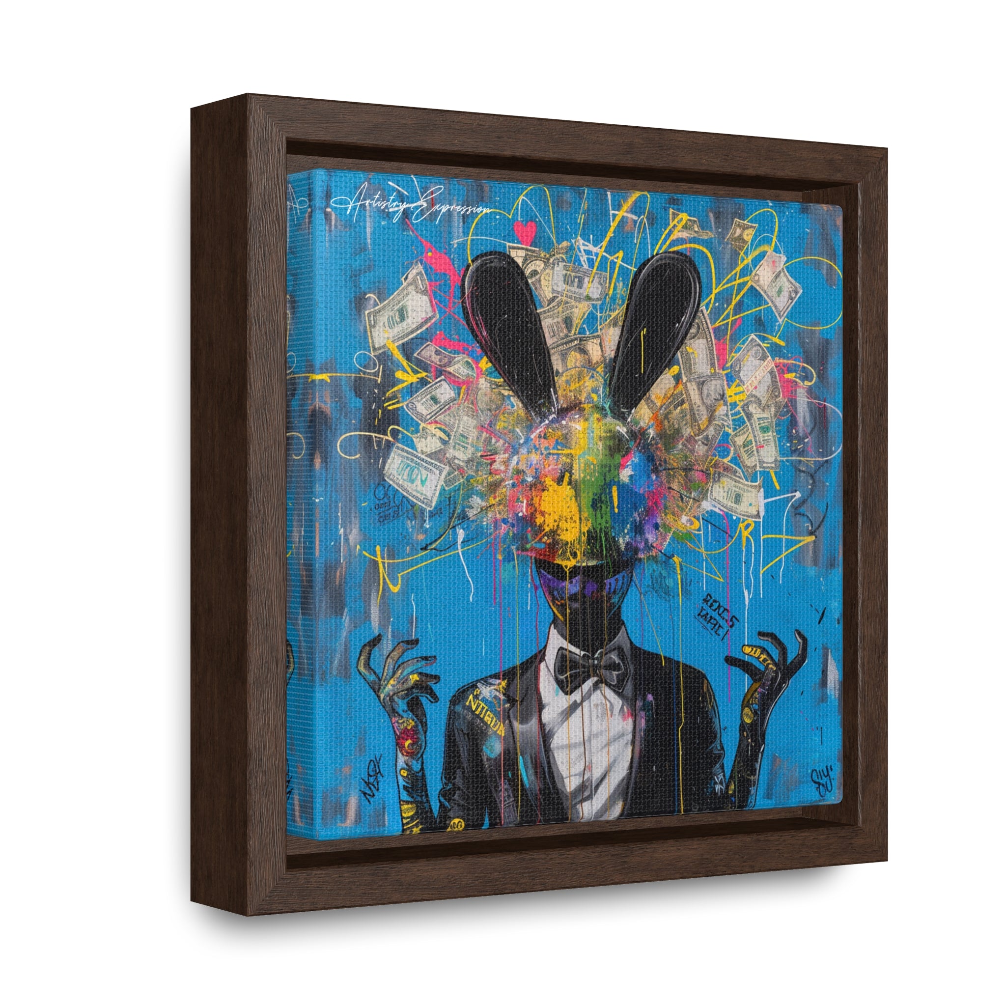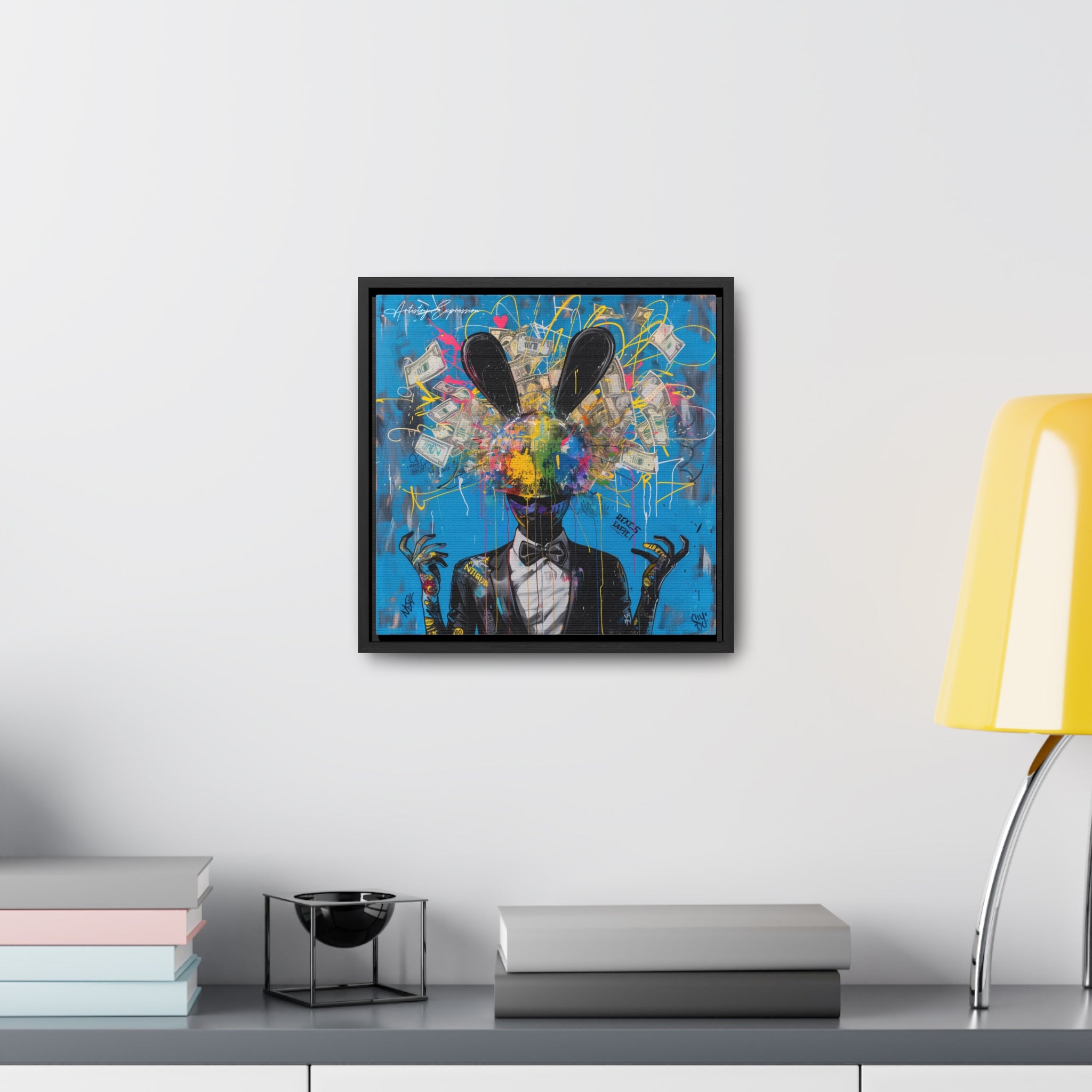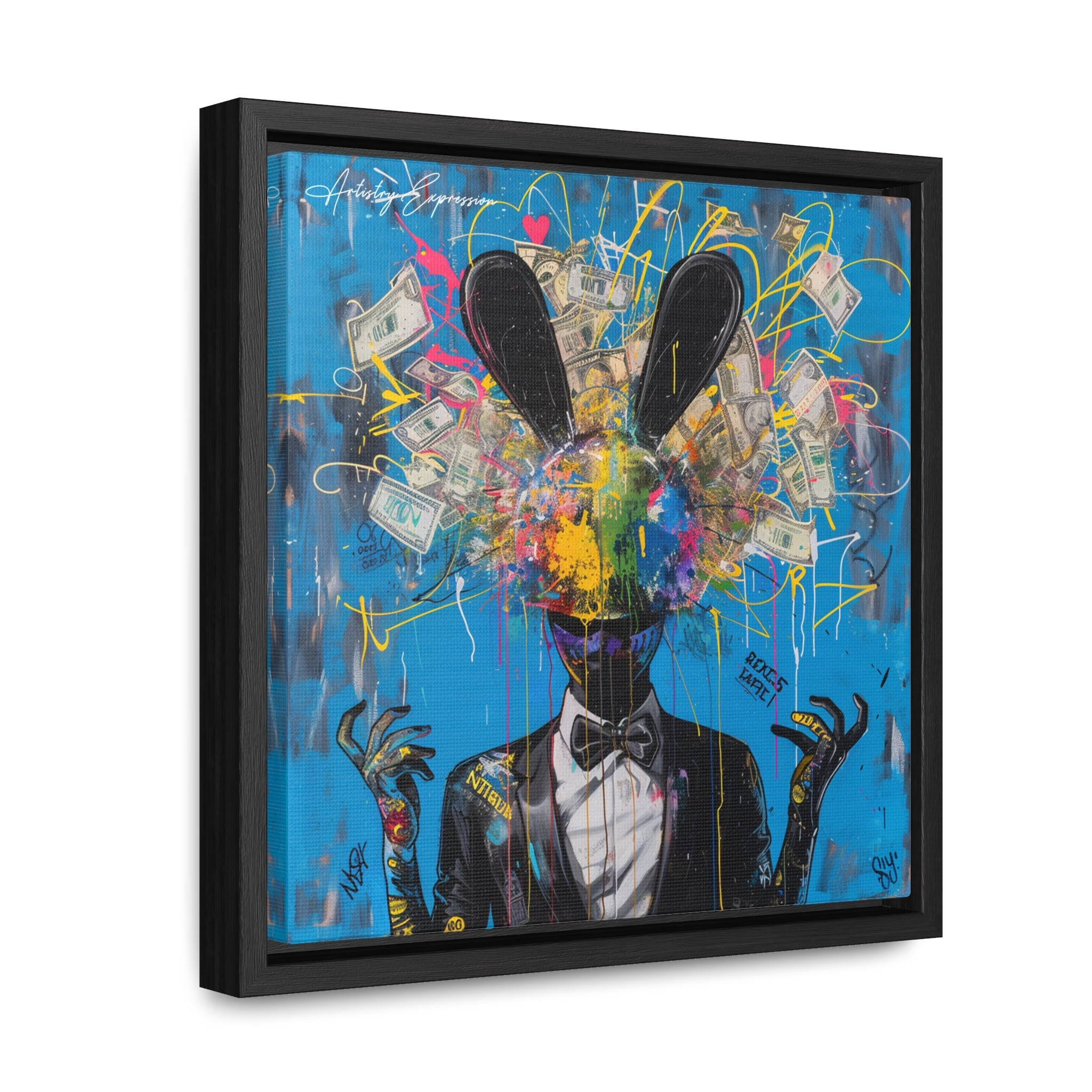 This vibrant artwork captures the spirit of street art with its dynamic composition and bold use of color. Featuring a mysterious figure adorned in rainbow hues against a backdrop of urban graffiti, the piece invites viewers to explore the intersection of art, identity, and commerce. With mischievous rabbit ears and hovering dollar signs, it offers a playful yet satirical commentary on contemporary culture.