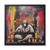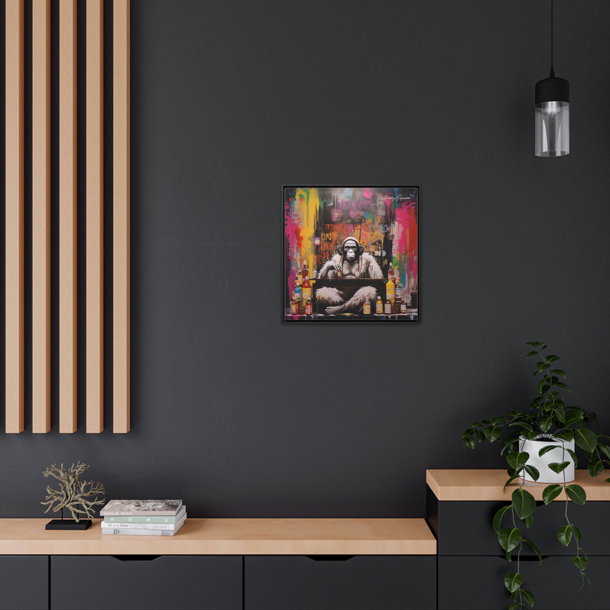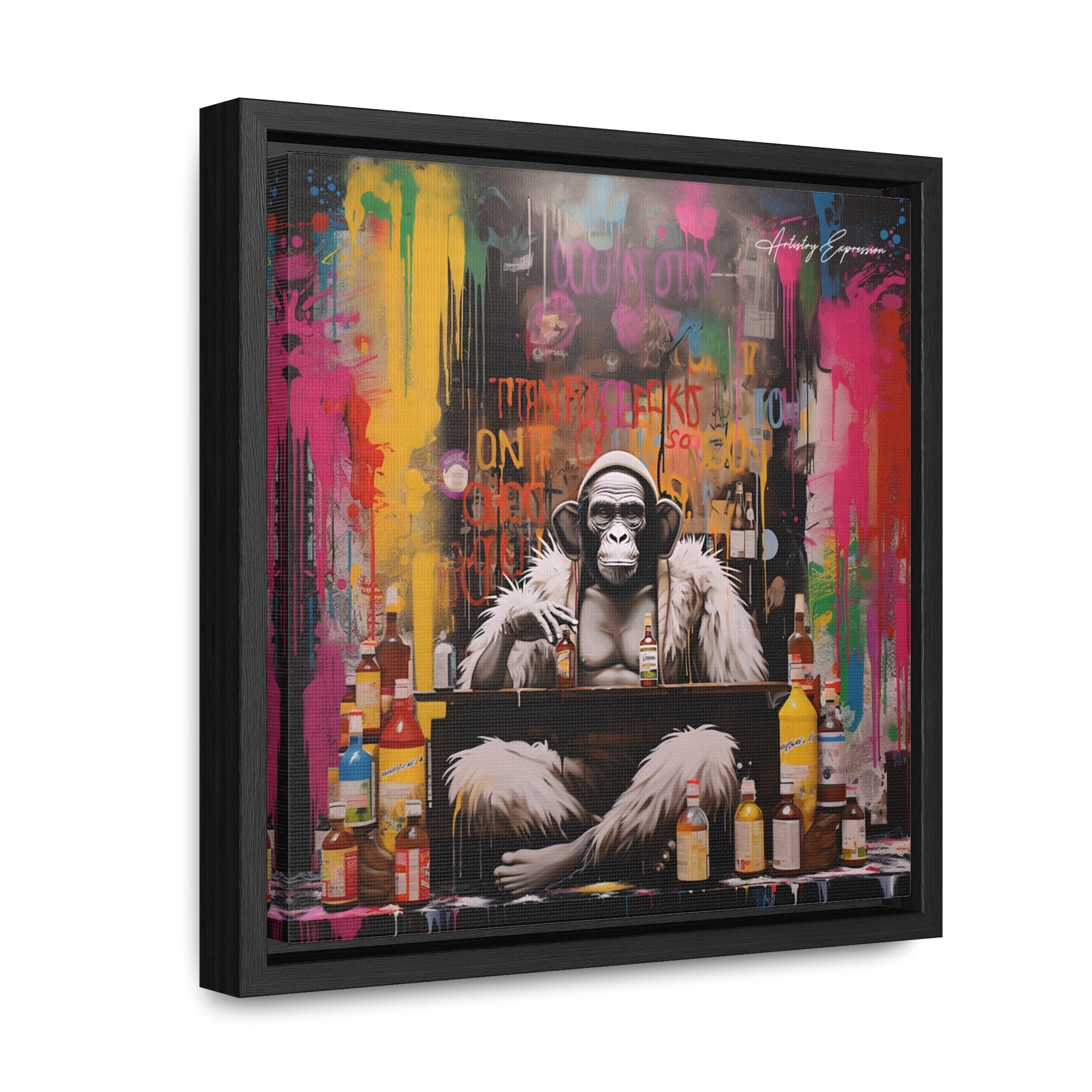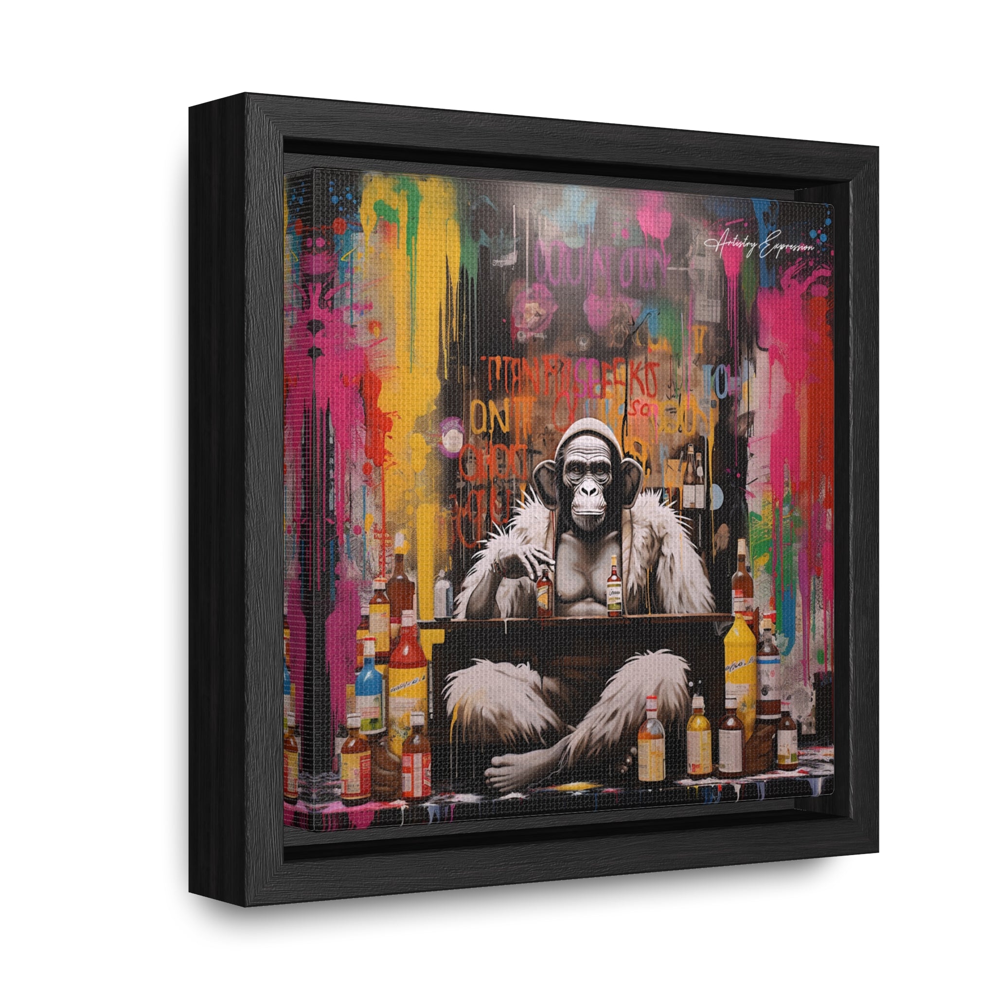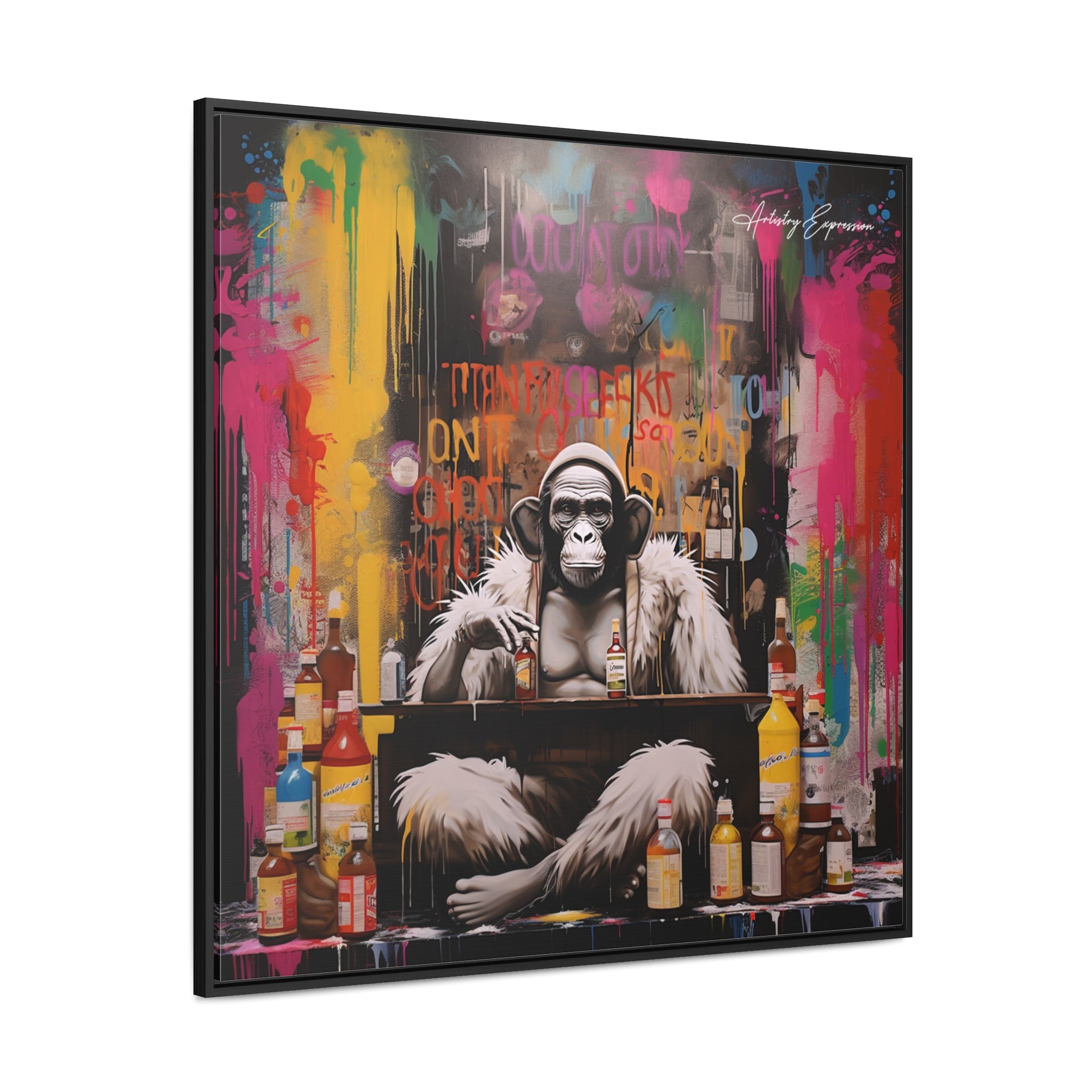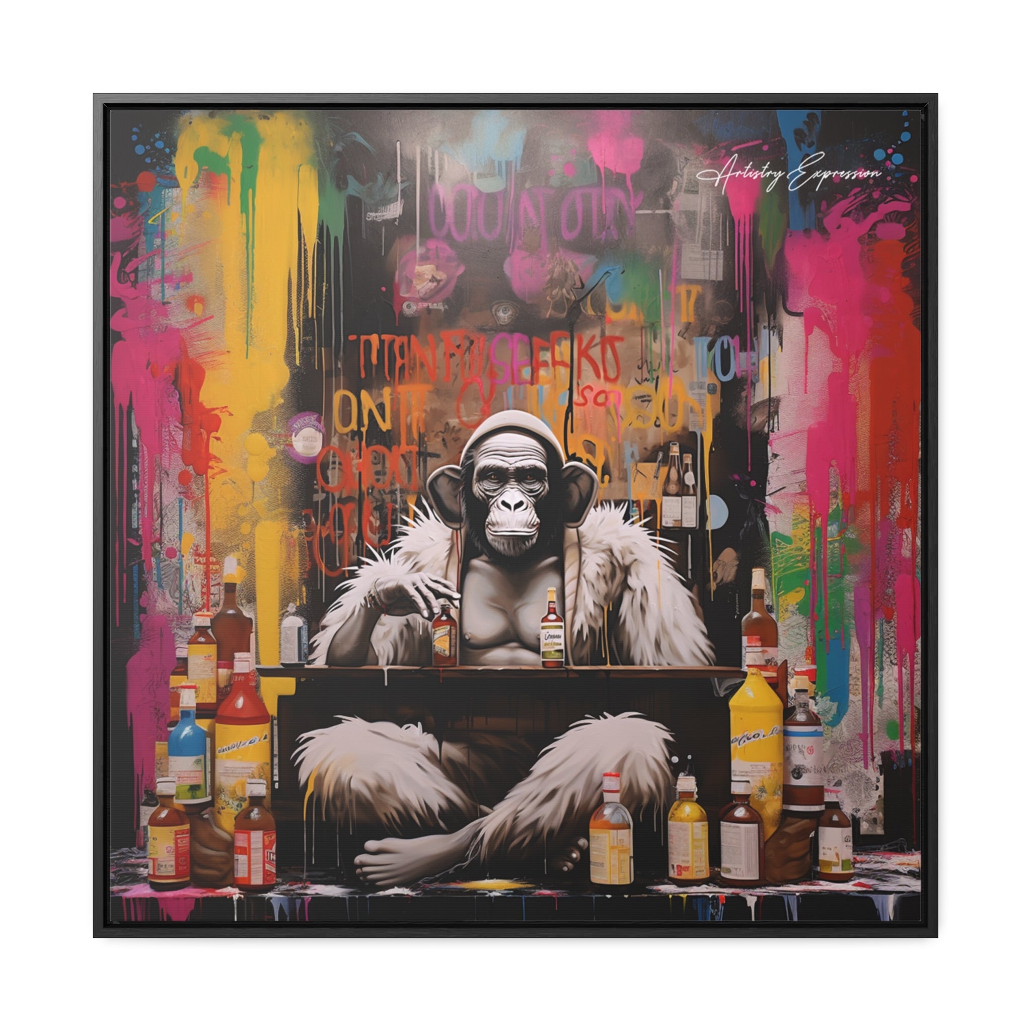 In this lively graffiti canvas, a gorilla sits amidst a colorful urban landscape, surrounded by a table filled with drinks. The scene captures a unique blend of urban nightlife and jungle aesthetics, offering a playful and vibrant portrayal of the gorilla's presence in the city.