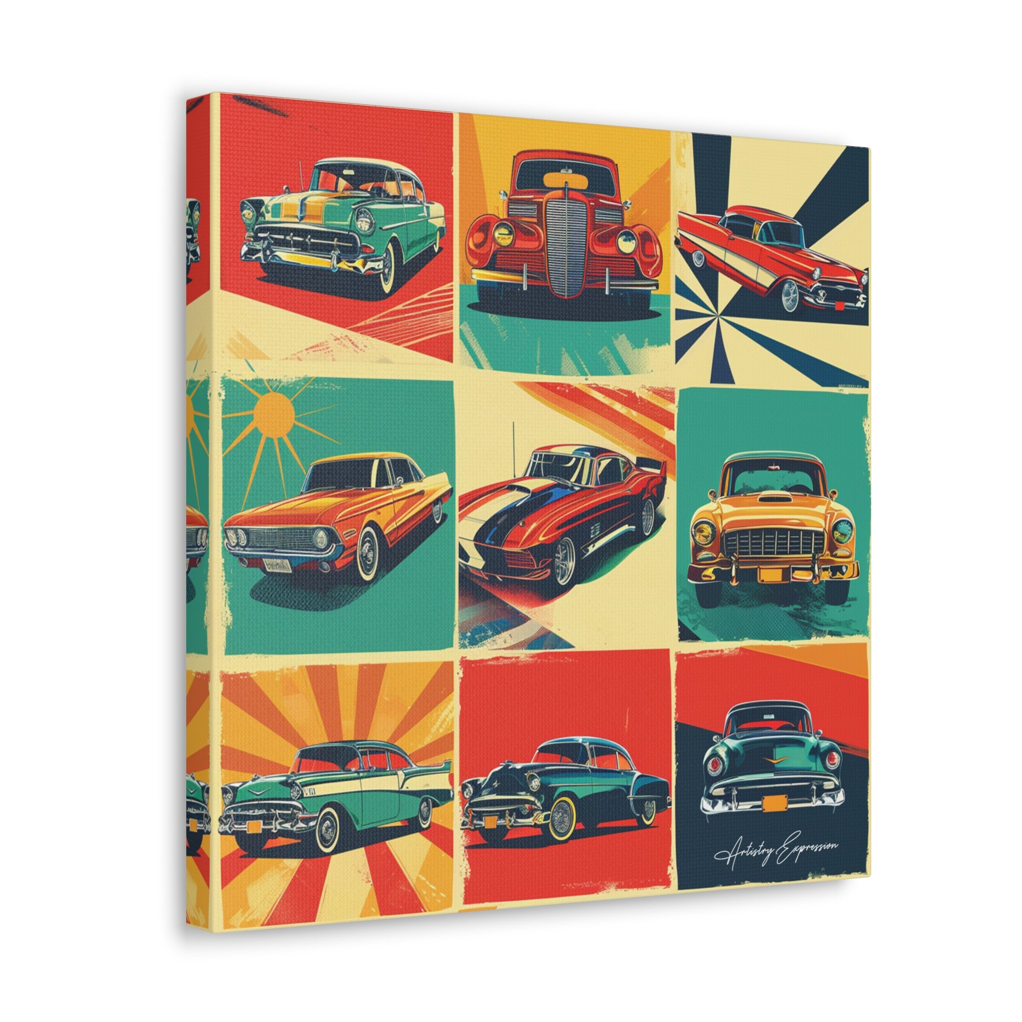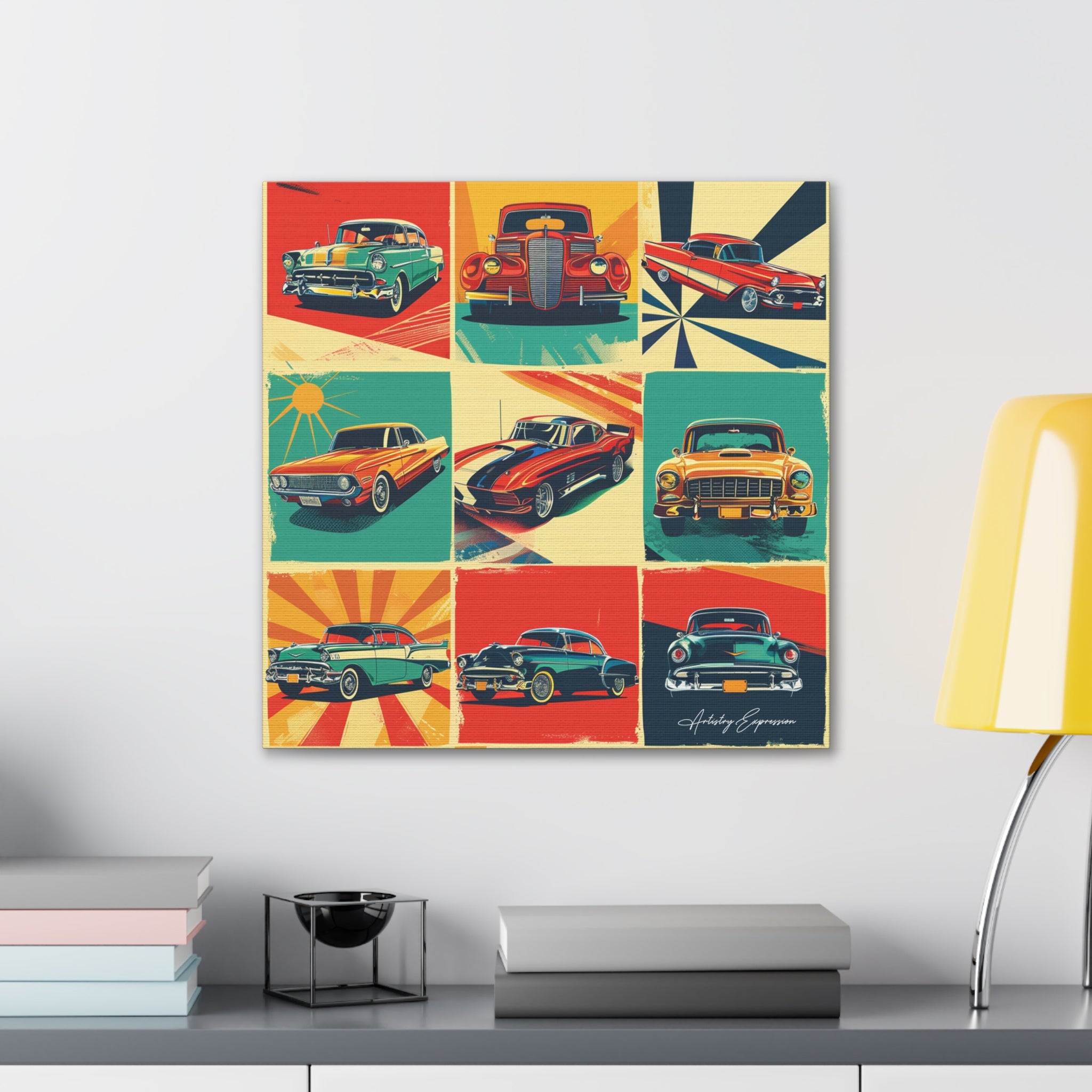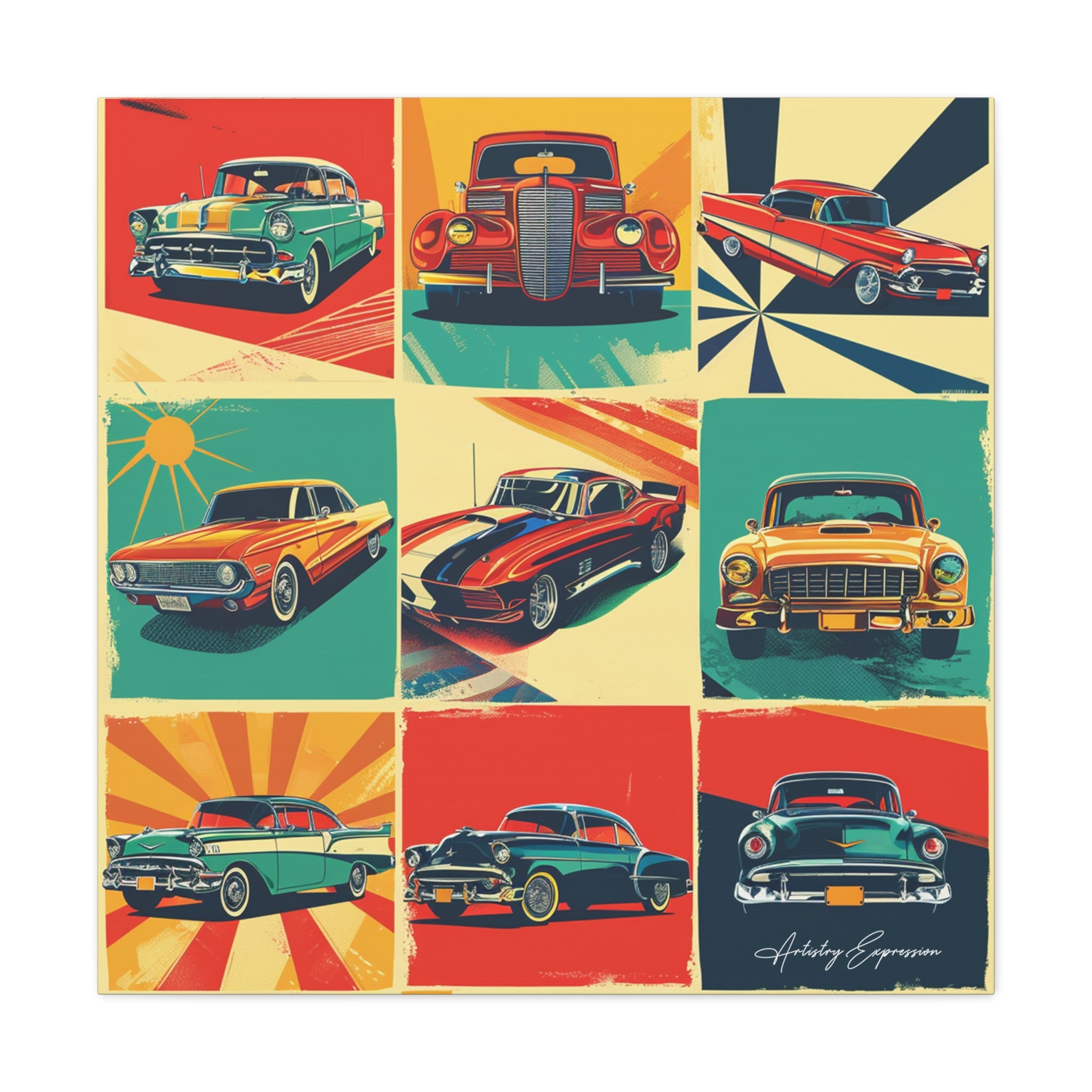 "Retro Drive" captures the vibrant collage of retro signs and posters celebrating classic cars and vintage automobile culture. Saturated hues of red, blue, yellow, and green pop against cream and gray backgrounds, reminiscent of the 1950s and 1960s aesthetic.