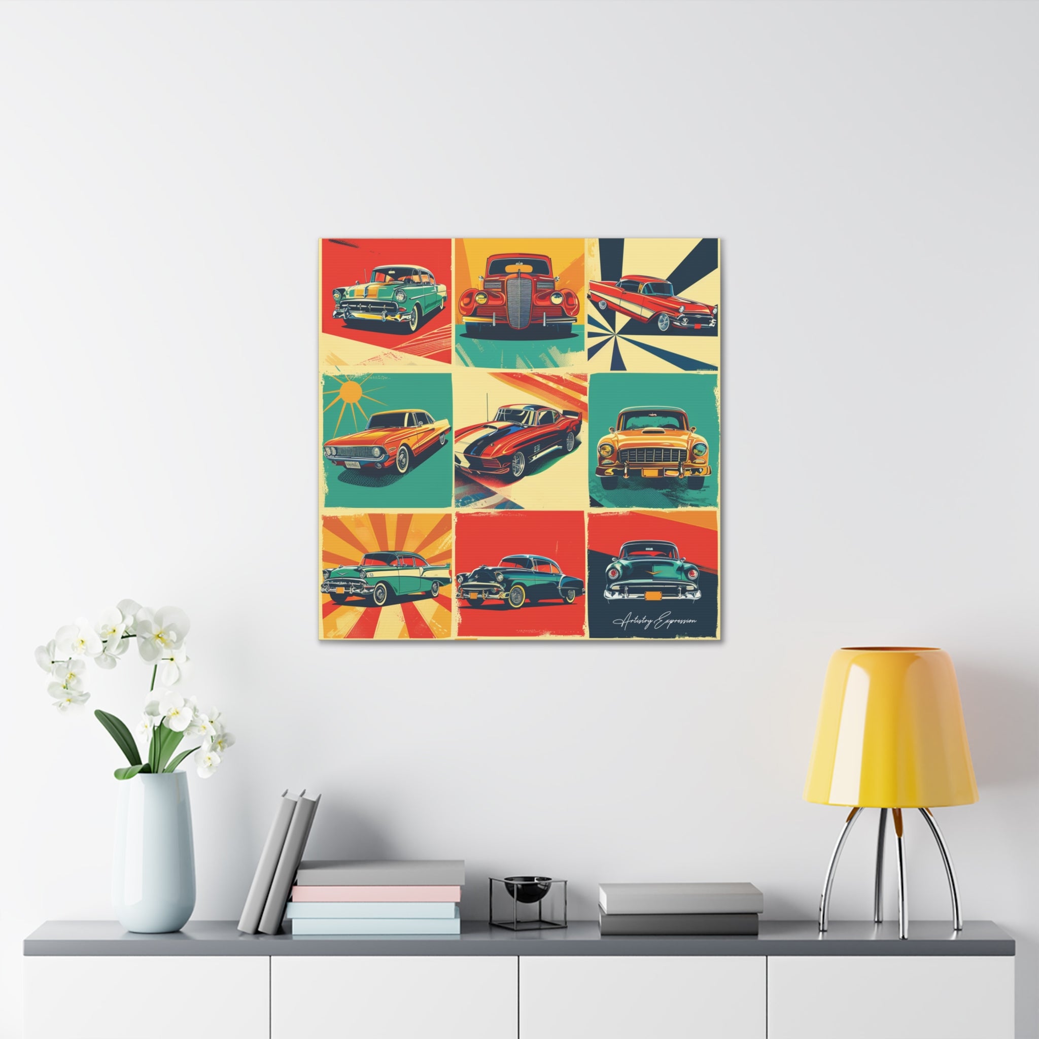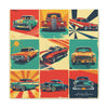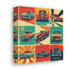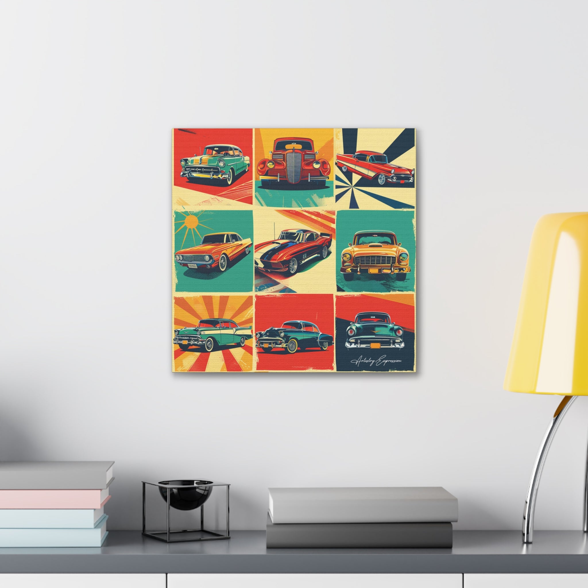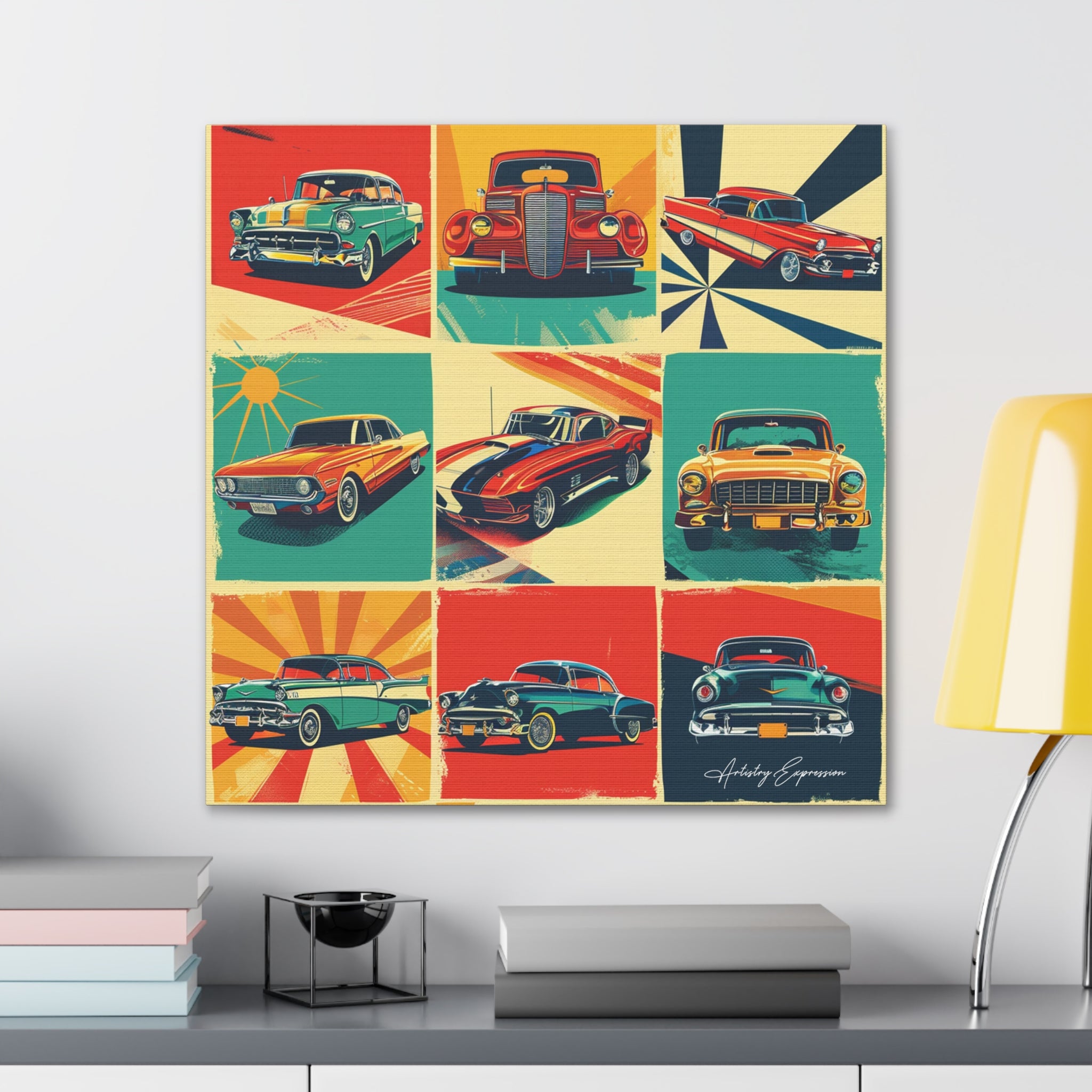 "Retro Drive" captures the vibrant collage of retro signs and posters celebrating classic cars and vintage automobile culture. Saturated hues of red, blue, yellow, and green pop against cream and gray backgrounds, reminiscent of the 1950s and 1960s aesthetic.