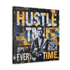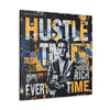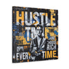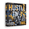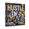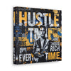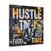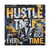 Un collage visuel dynamique et complexe centré sur la finance et la réussite entrepreneuriale. Présentant une figure d'homme d'affaires victorieux sur fond de citations inspirantes, de graphiques boursiers et de symboles comme Wall Street.