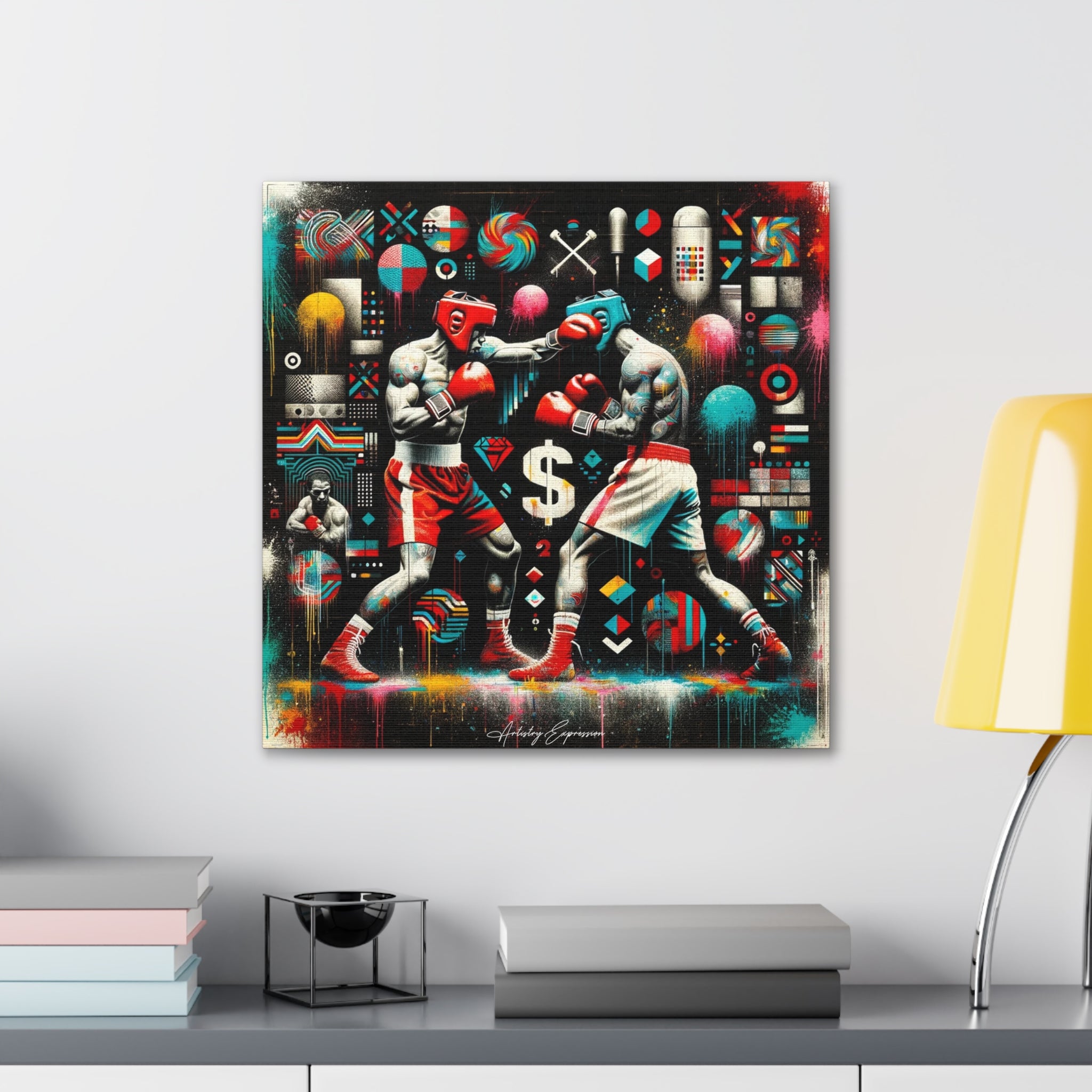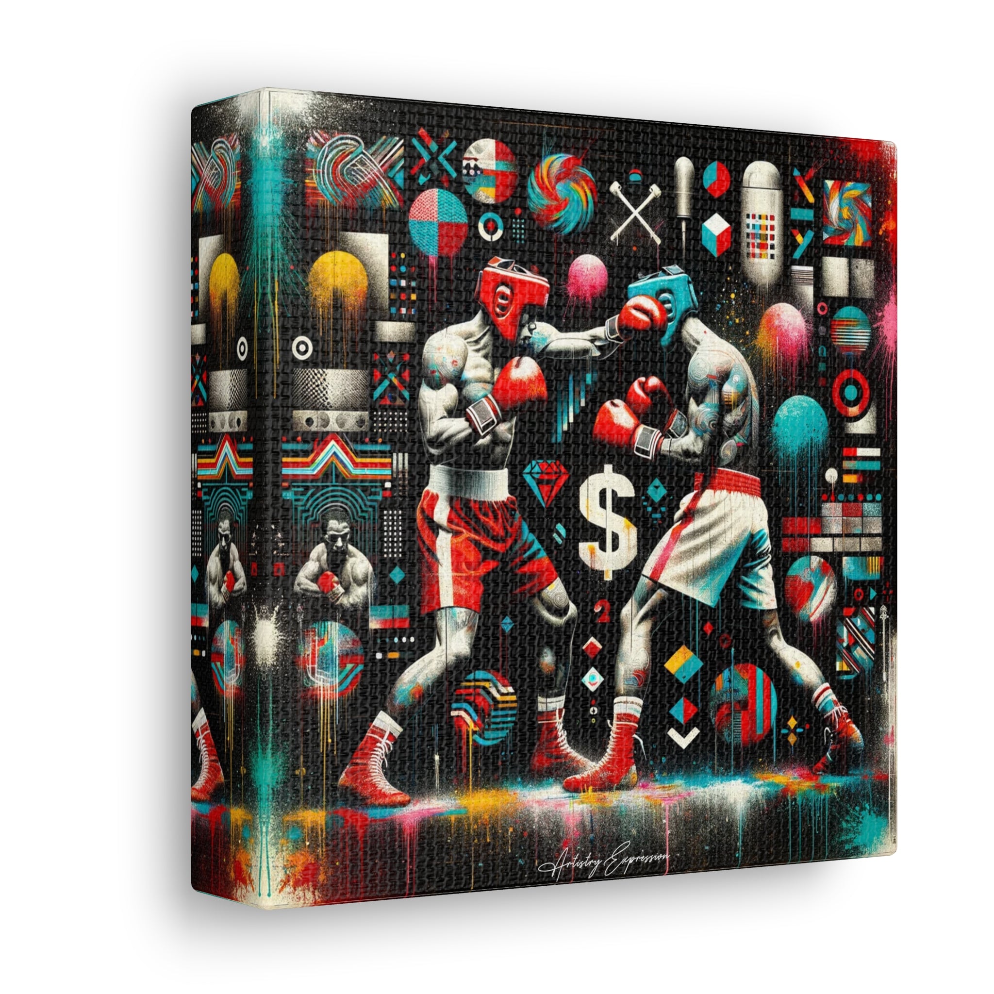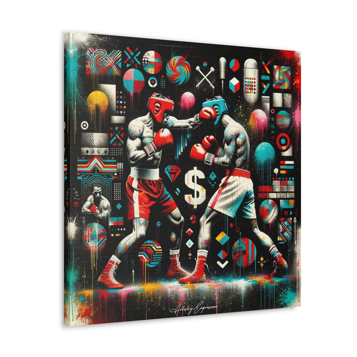 Graffiti ART canvas featuring Muhammad Ali engaged in a boxing match, capturing the essence of his legendary fighting spirit amidst vibrant street art.