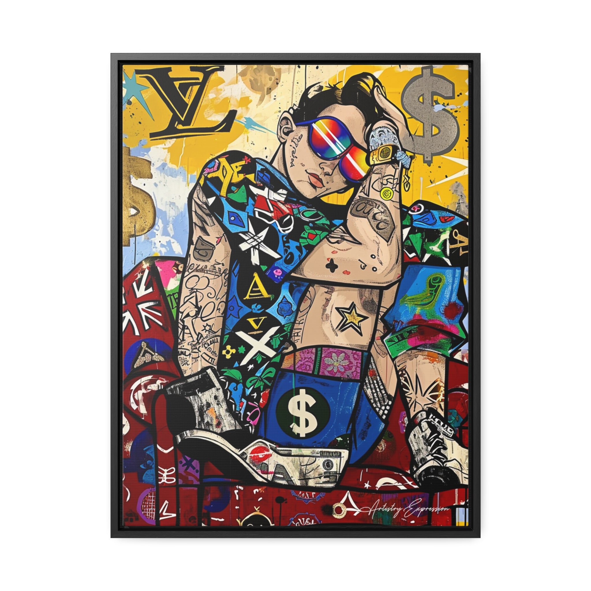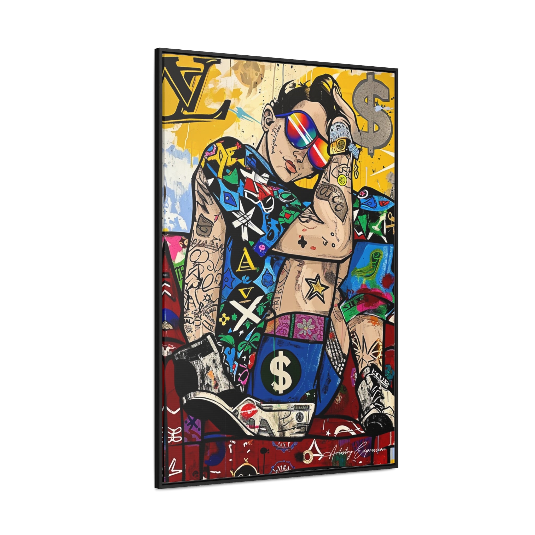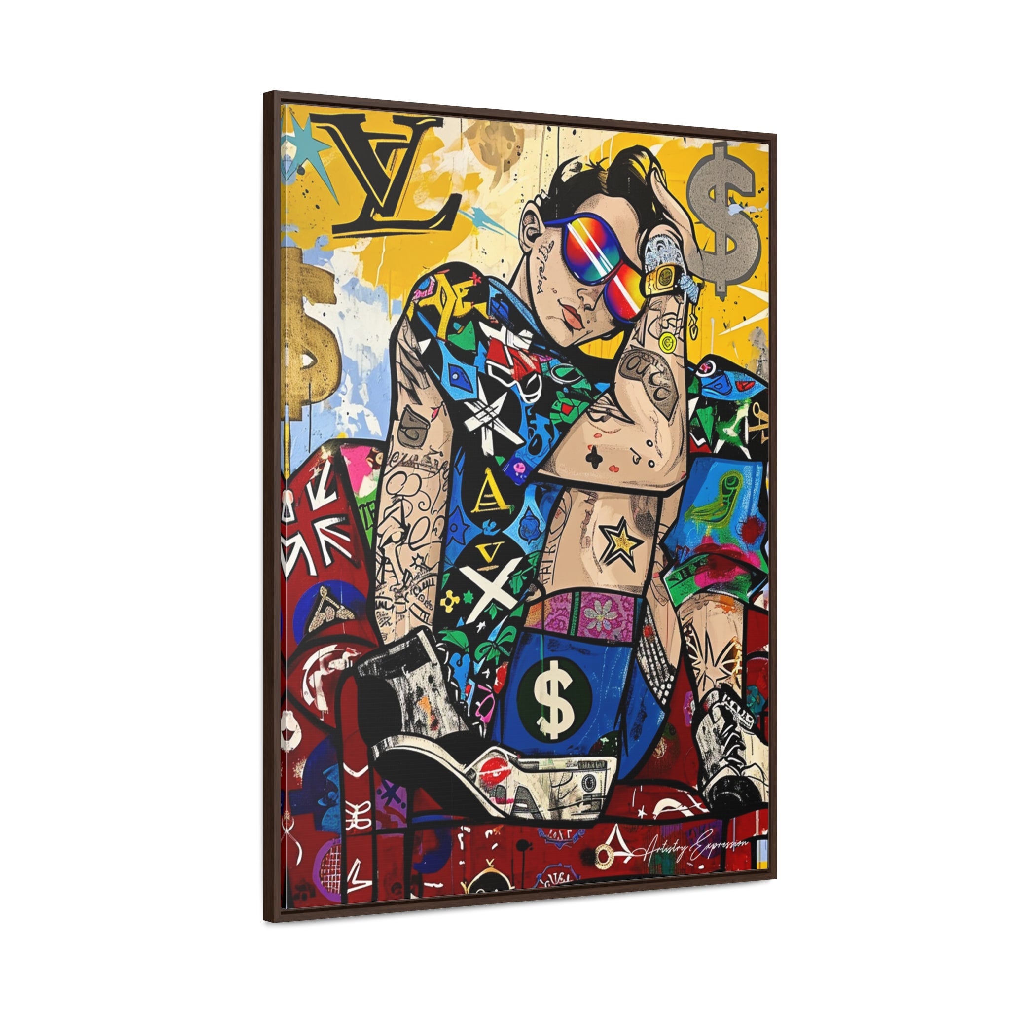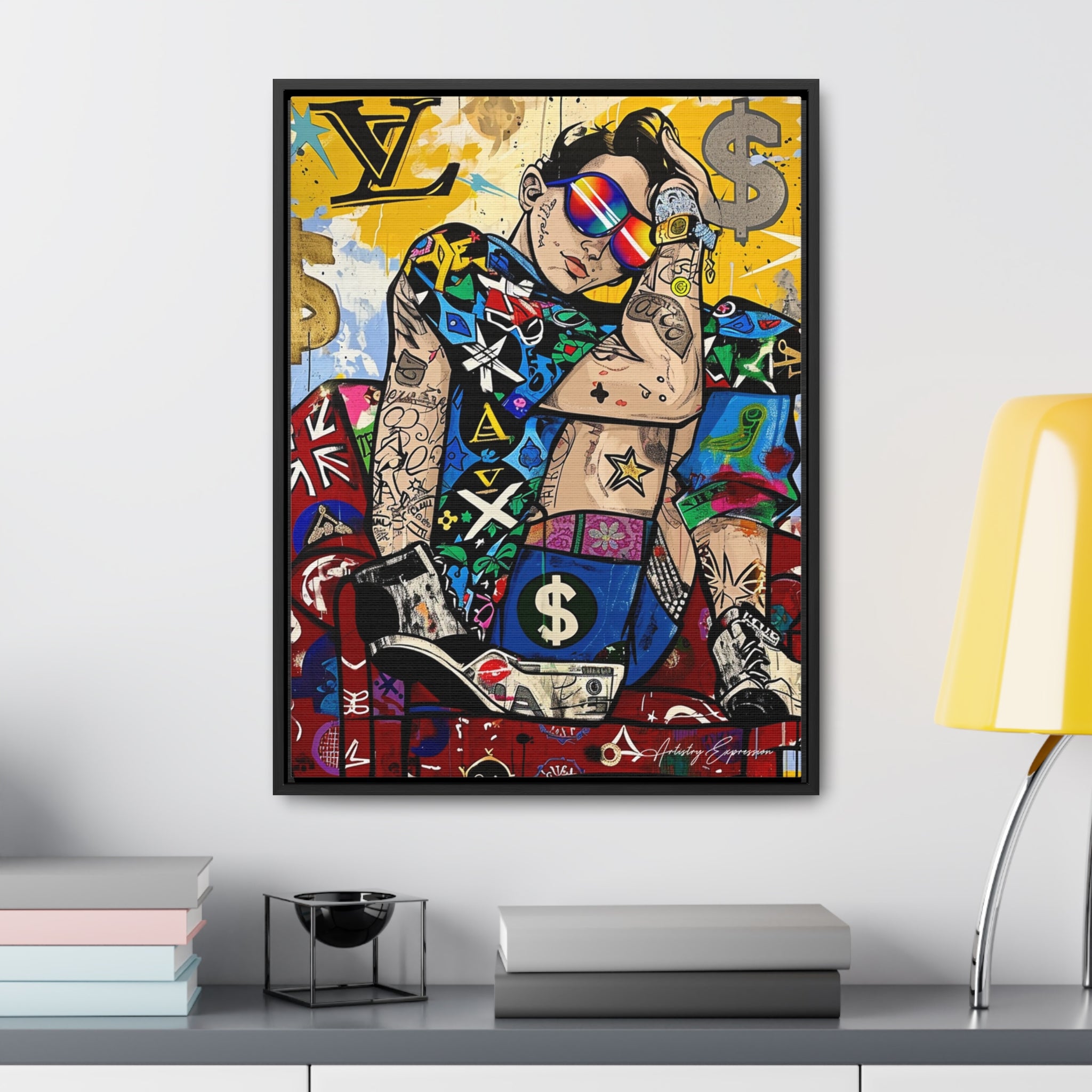 In this dynamic graffiti canvas, a stylish boy's artistry intertwines luxury brands and money symbols, creating a visually striking fusion of urban culture and wealth. Bold colors and expressive lines bring vibrancy to this representation of modern street art.