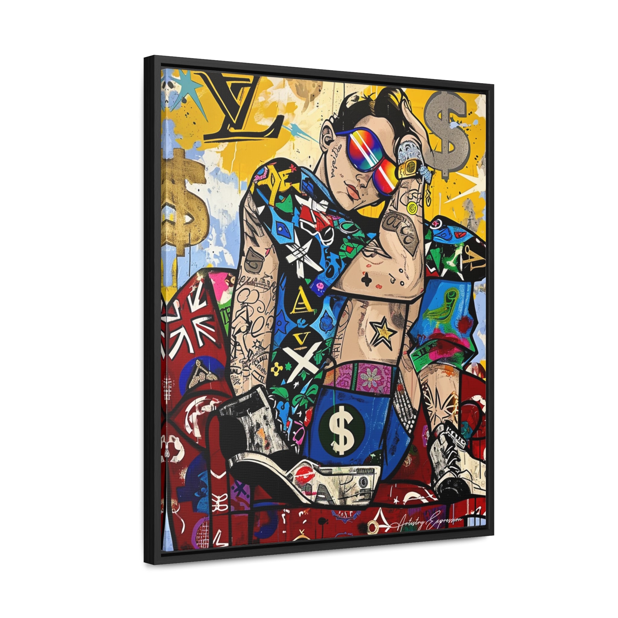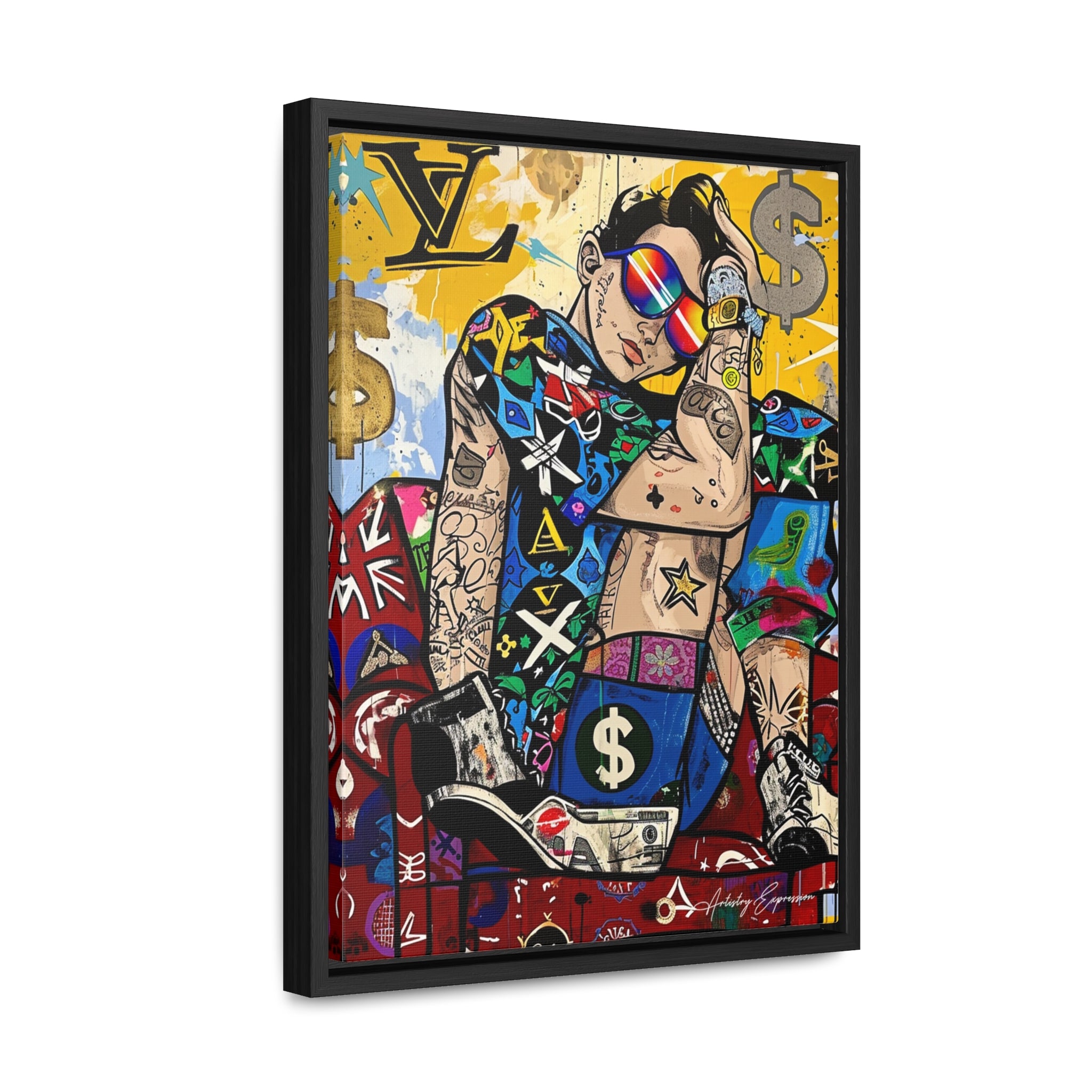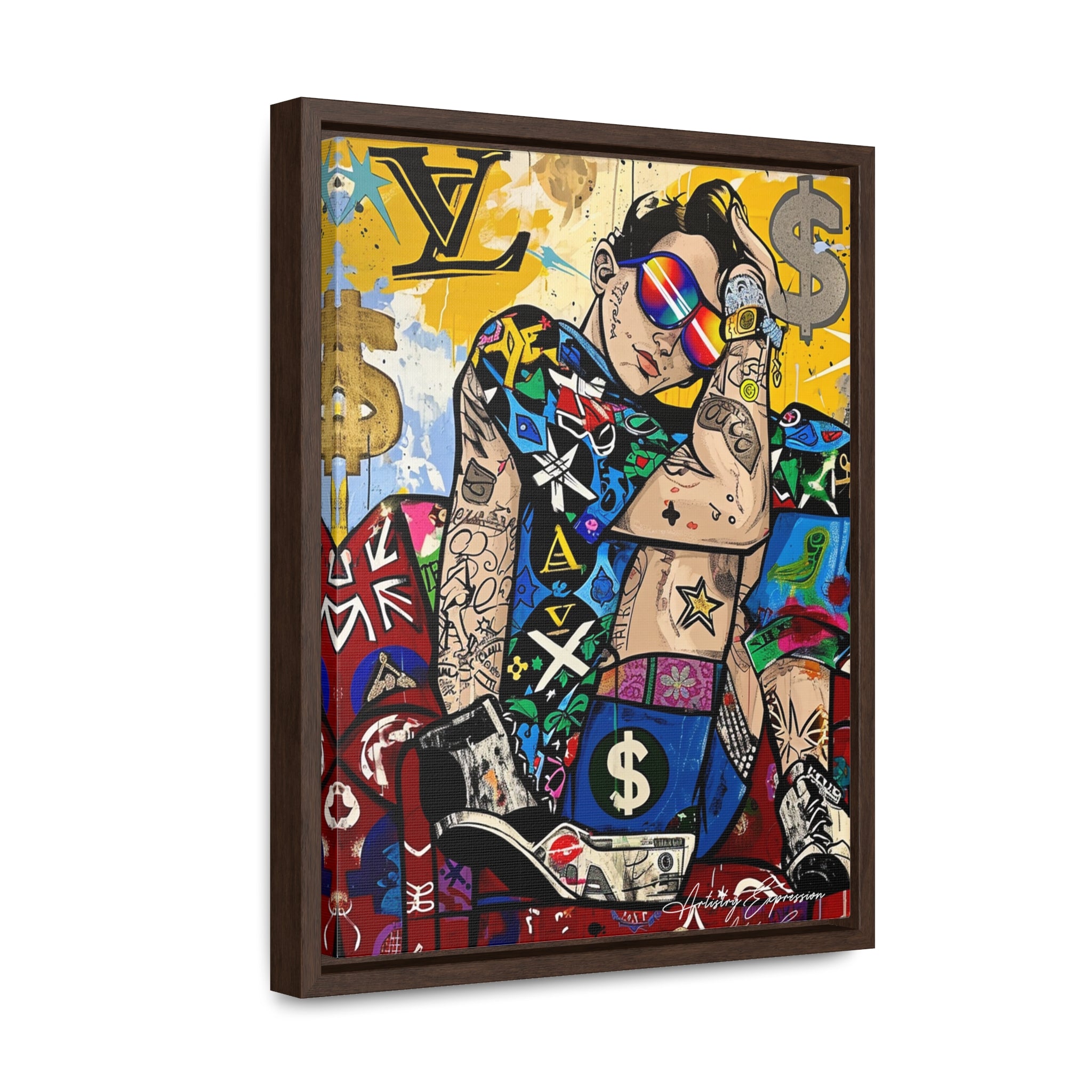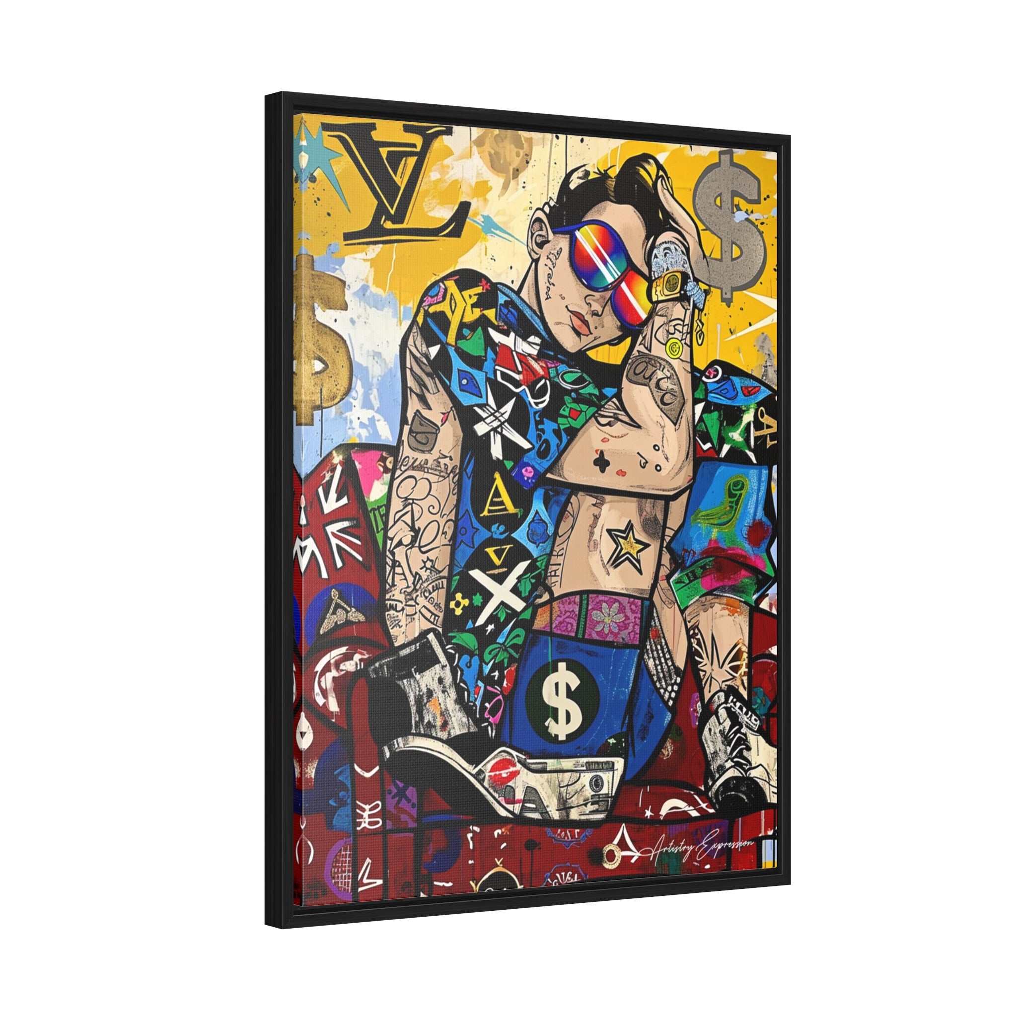 In this dynamic graffiti canvas, a stylish boy's artistry intertwines luxury brands and money symbols, creating a visually striking fusion of urban culture and wealth. Bold colors and expressive lines bring vibrancy to this representation of modern street art.