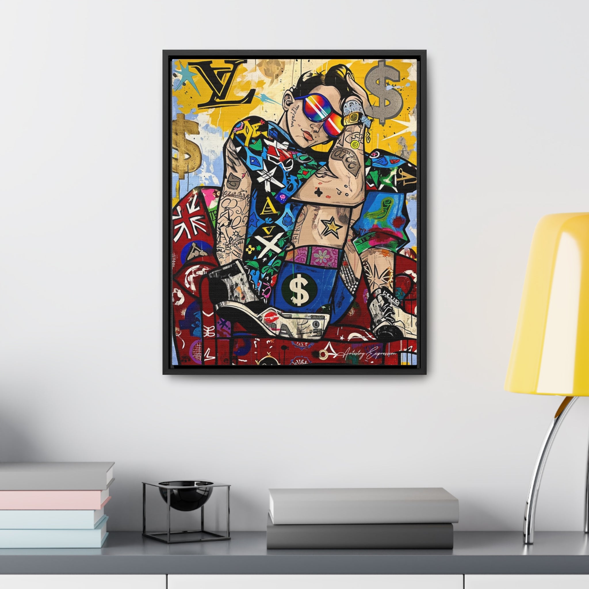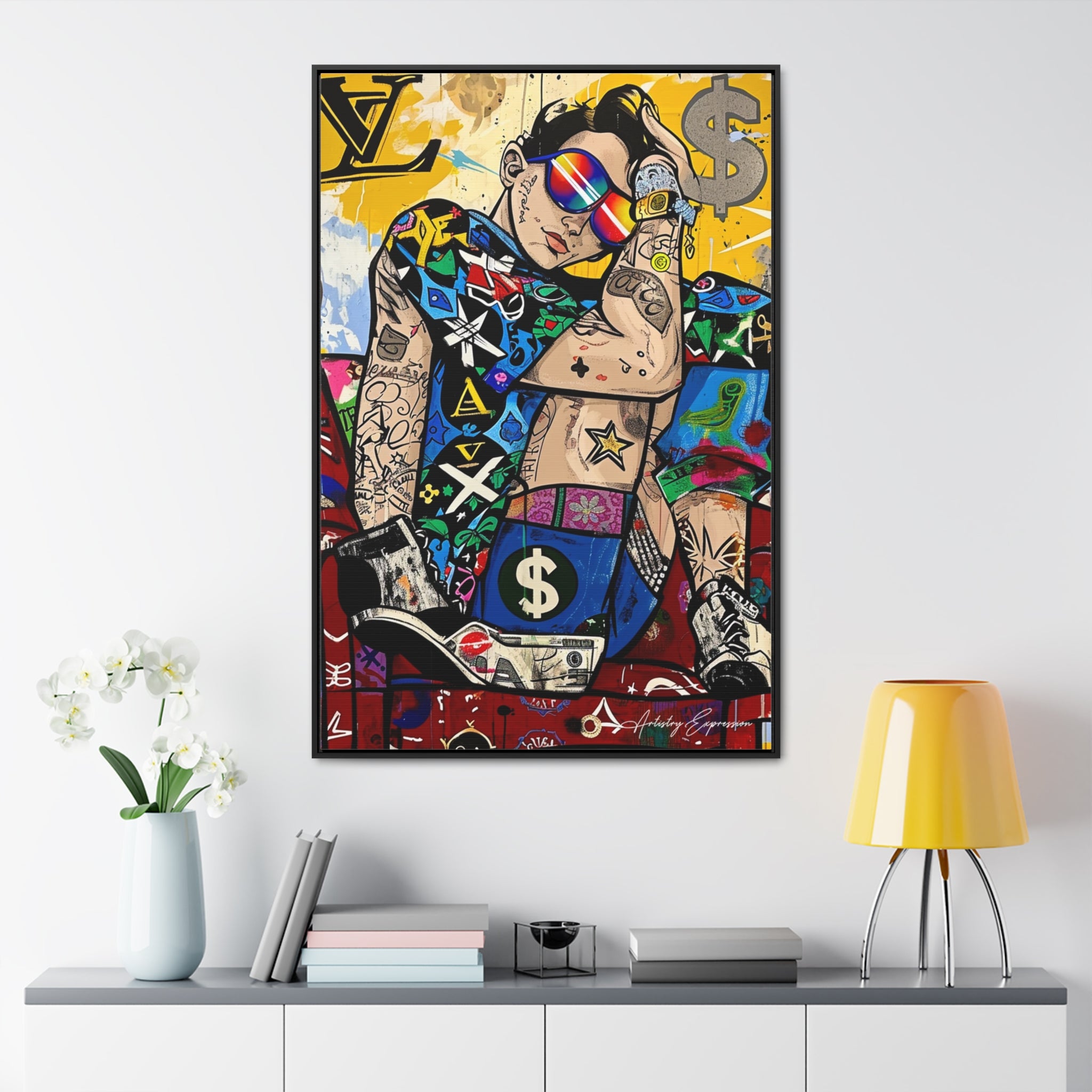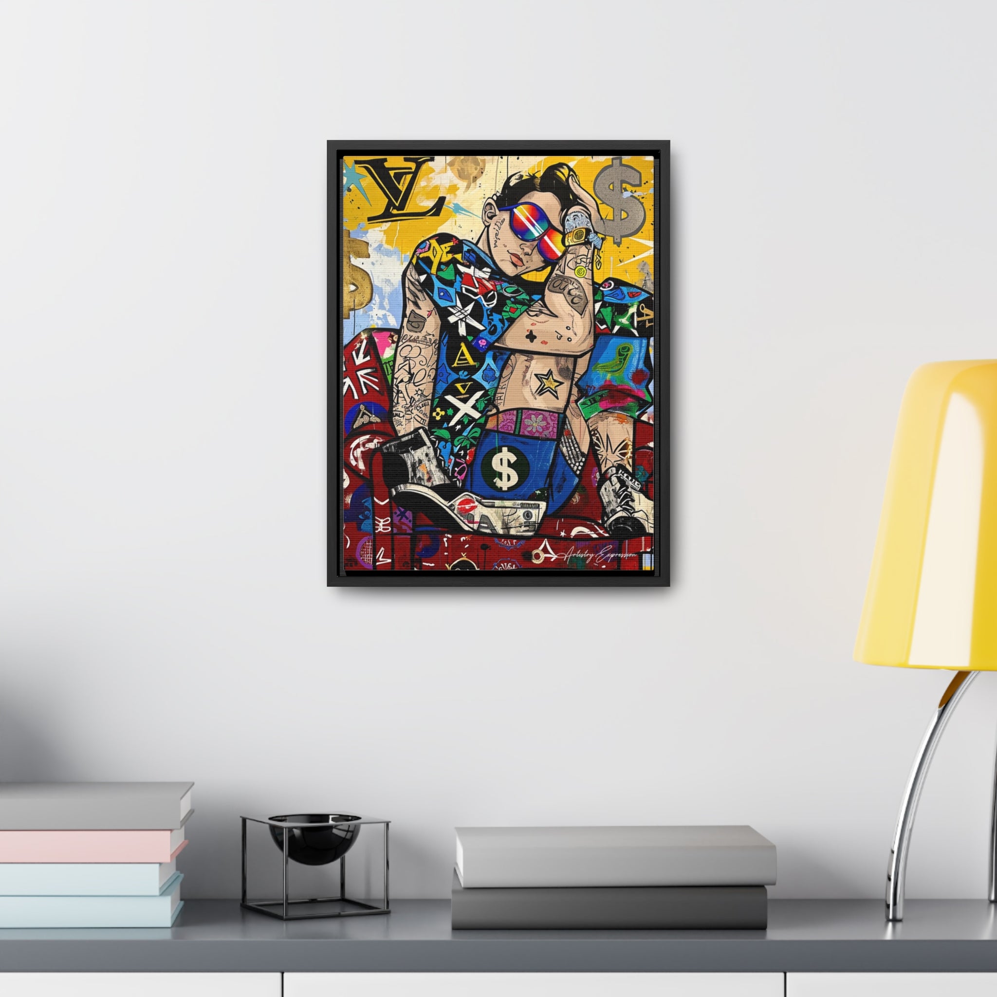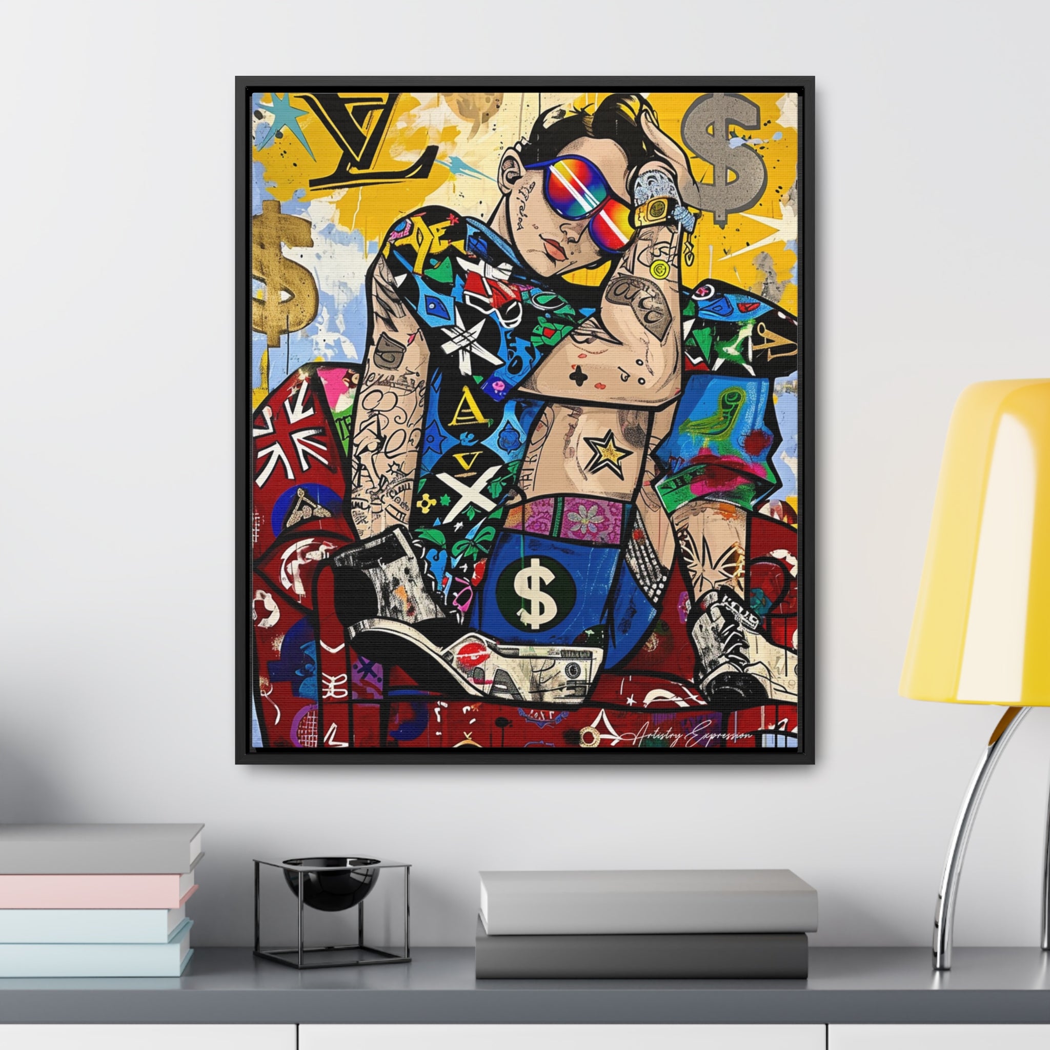 In this dynamic graffiti canvas, a stylish boy's artistry intertwines luxury brands and money symbols, creating a visually striking fusion of urban culture and wealth. Bold colors and expressive lines bring vibrancy to this representation of modern street art.