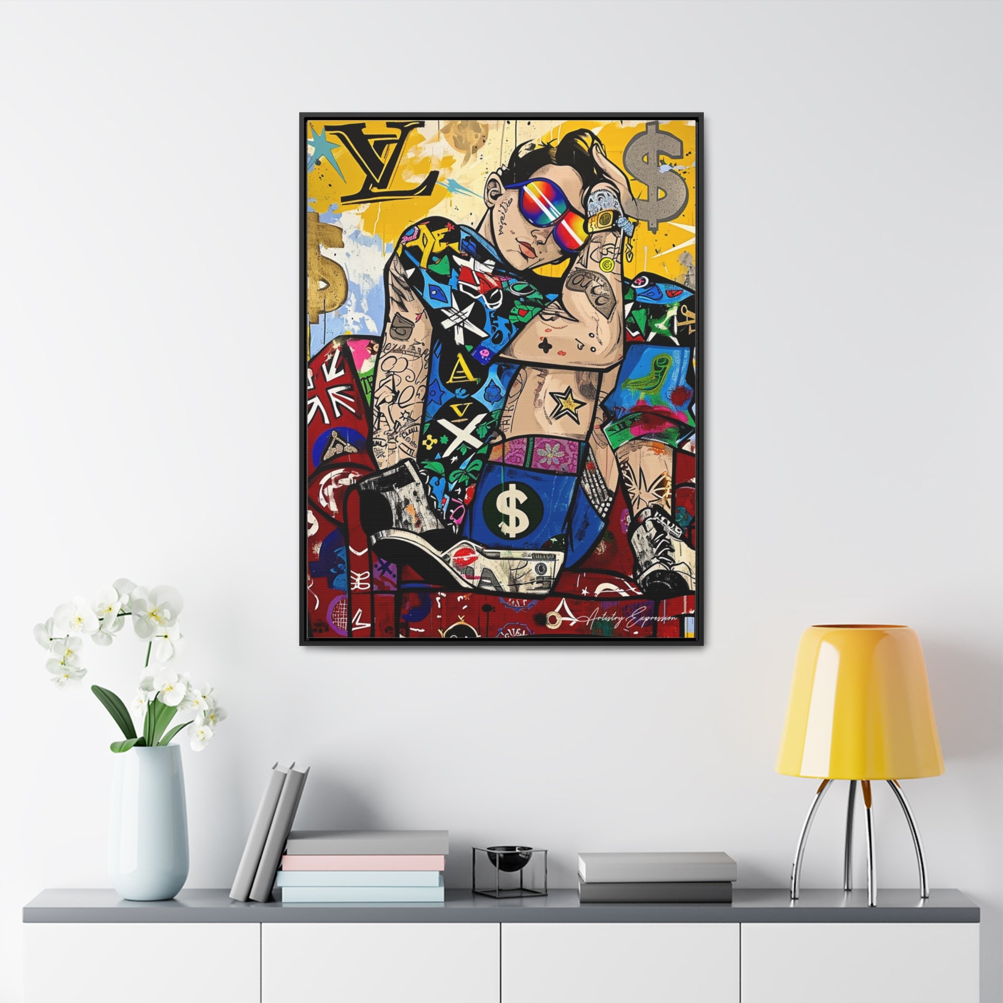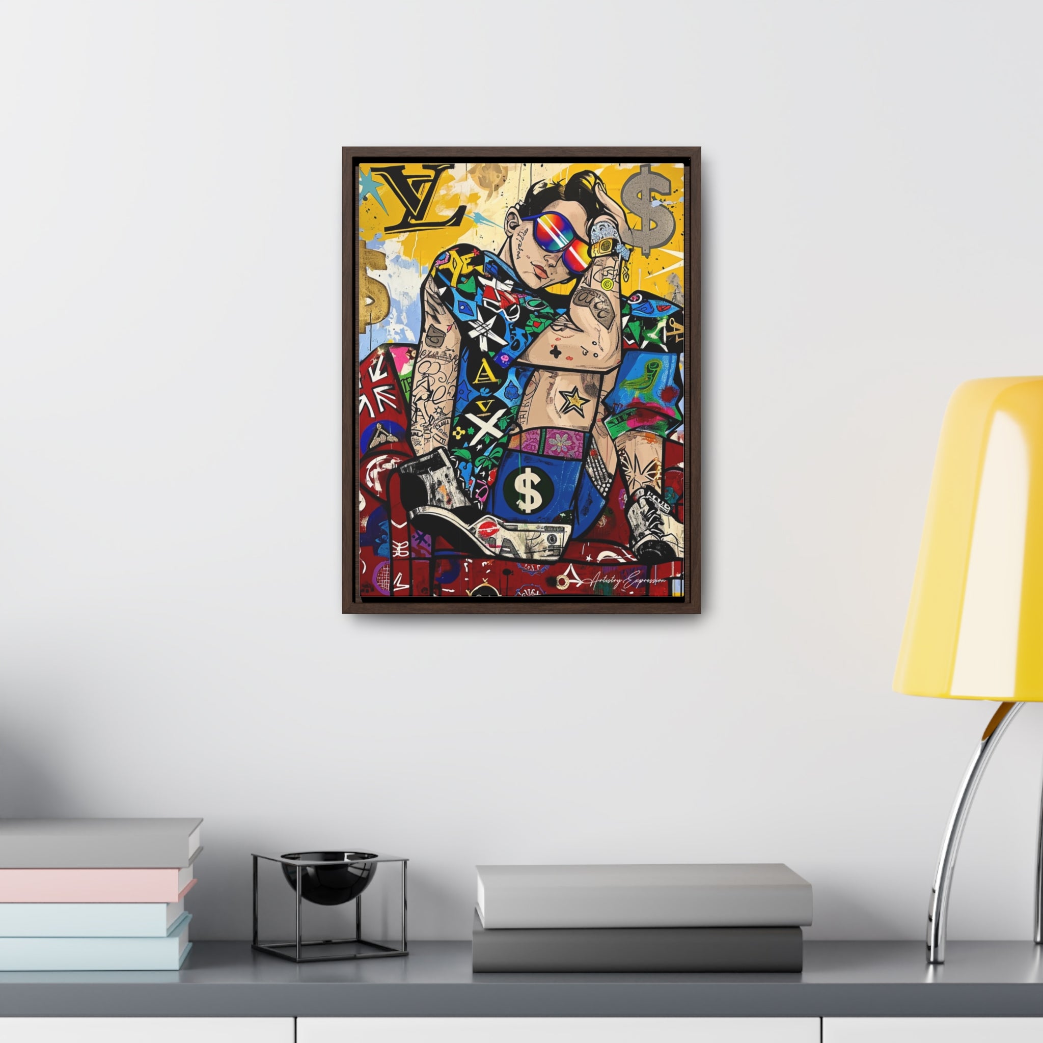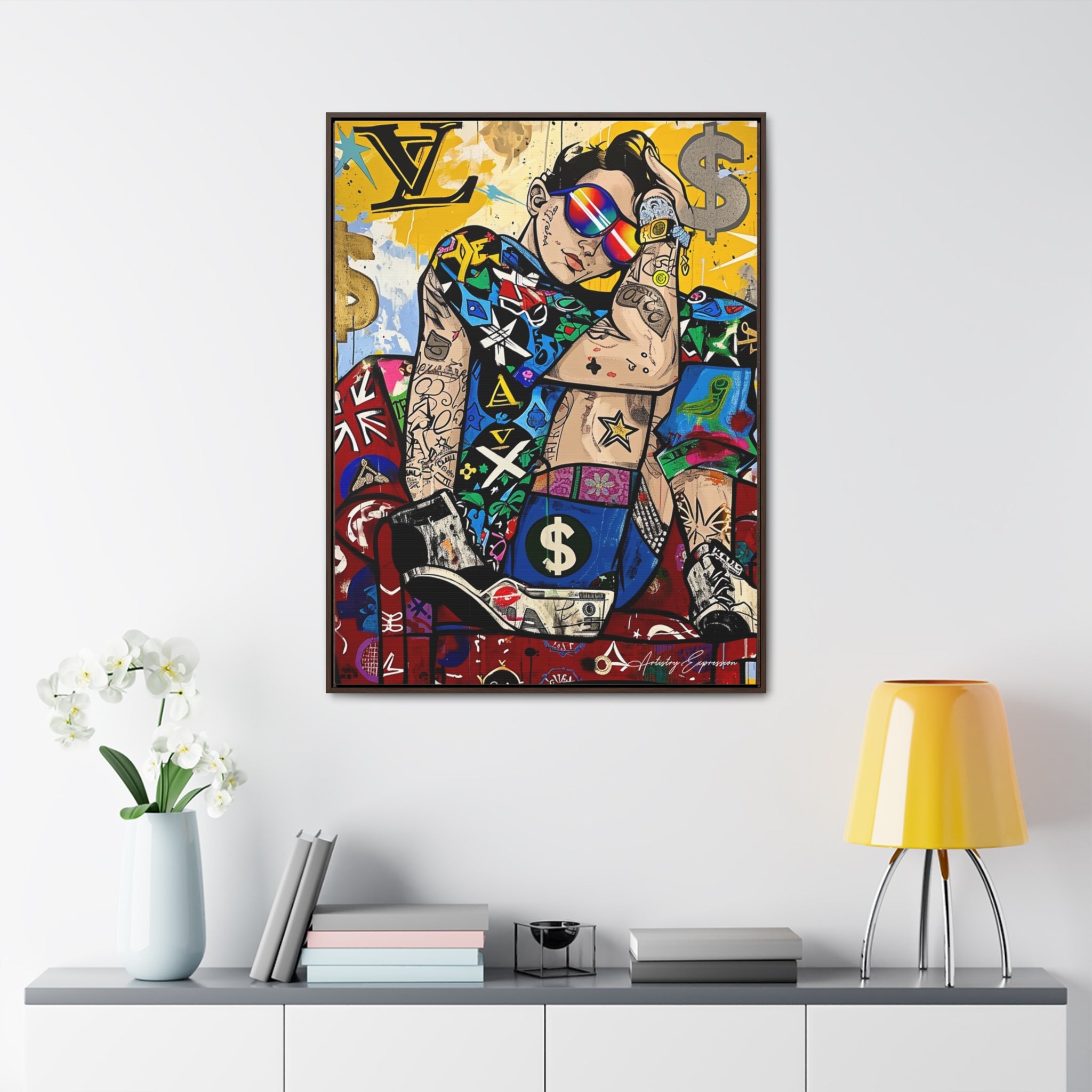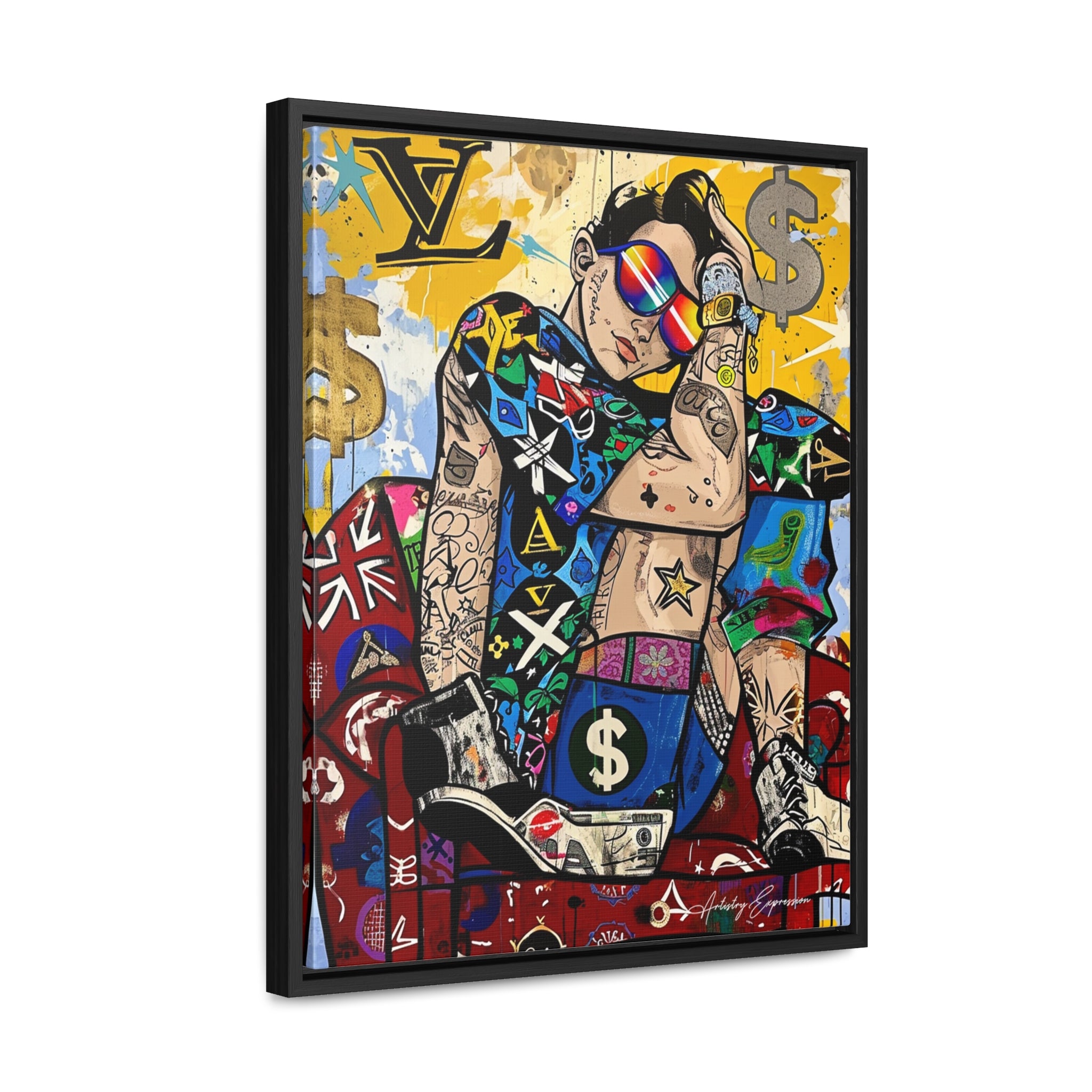 In this dynamic graffiti canvas, a stylish boy's artistry intertwines luxury brands and money symbols, creating a visually striking fusion of urban culture and wealth. Bold colors and expressive lines bring vibrancy to this representation of modern street art.