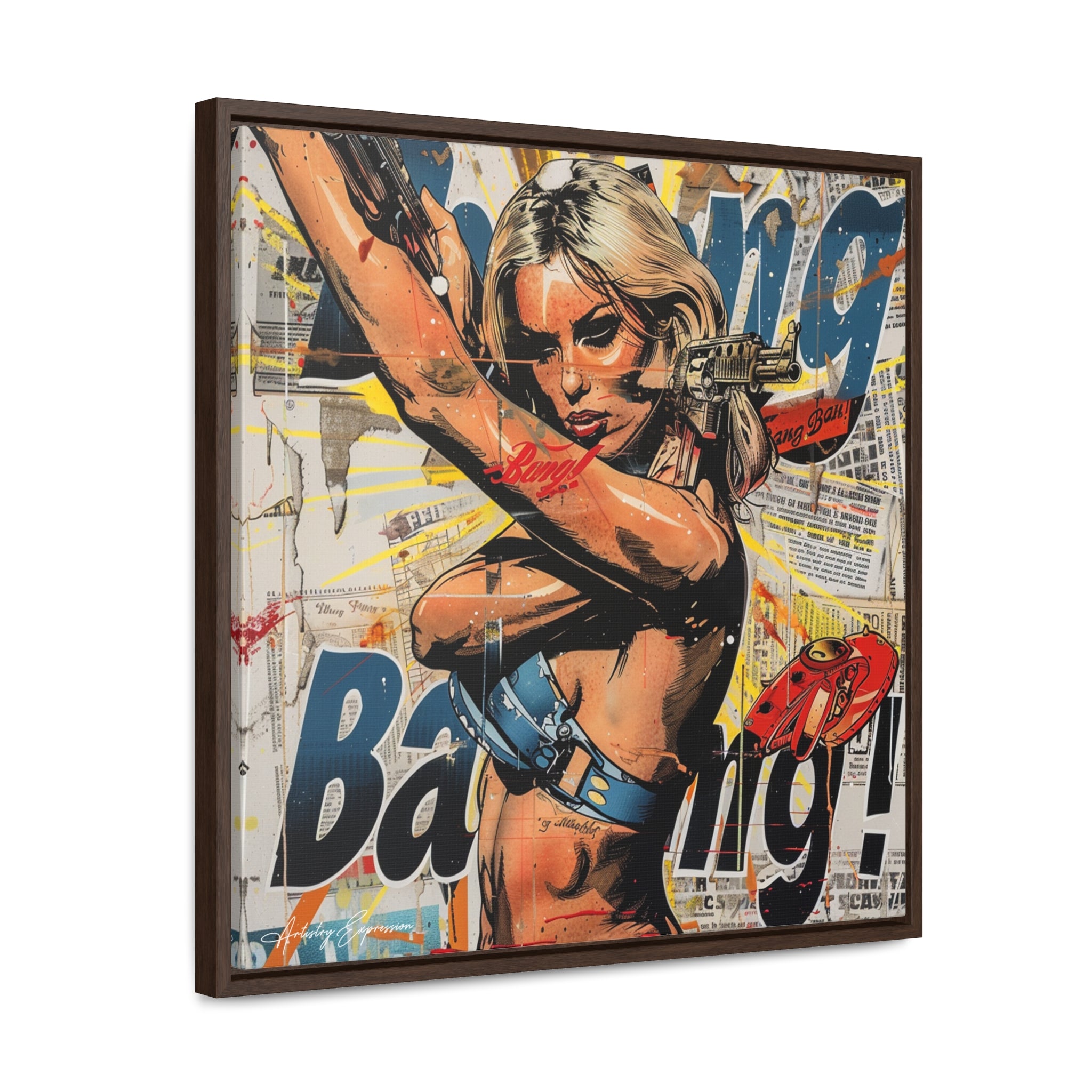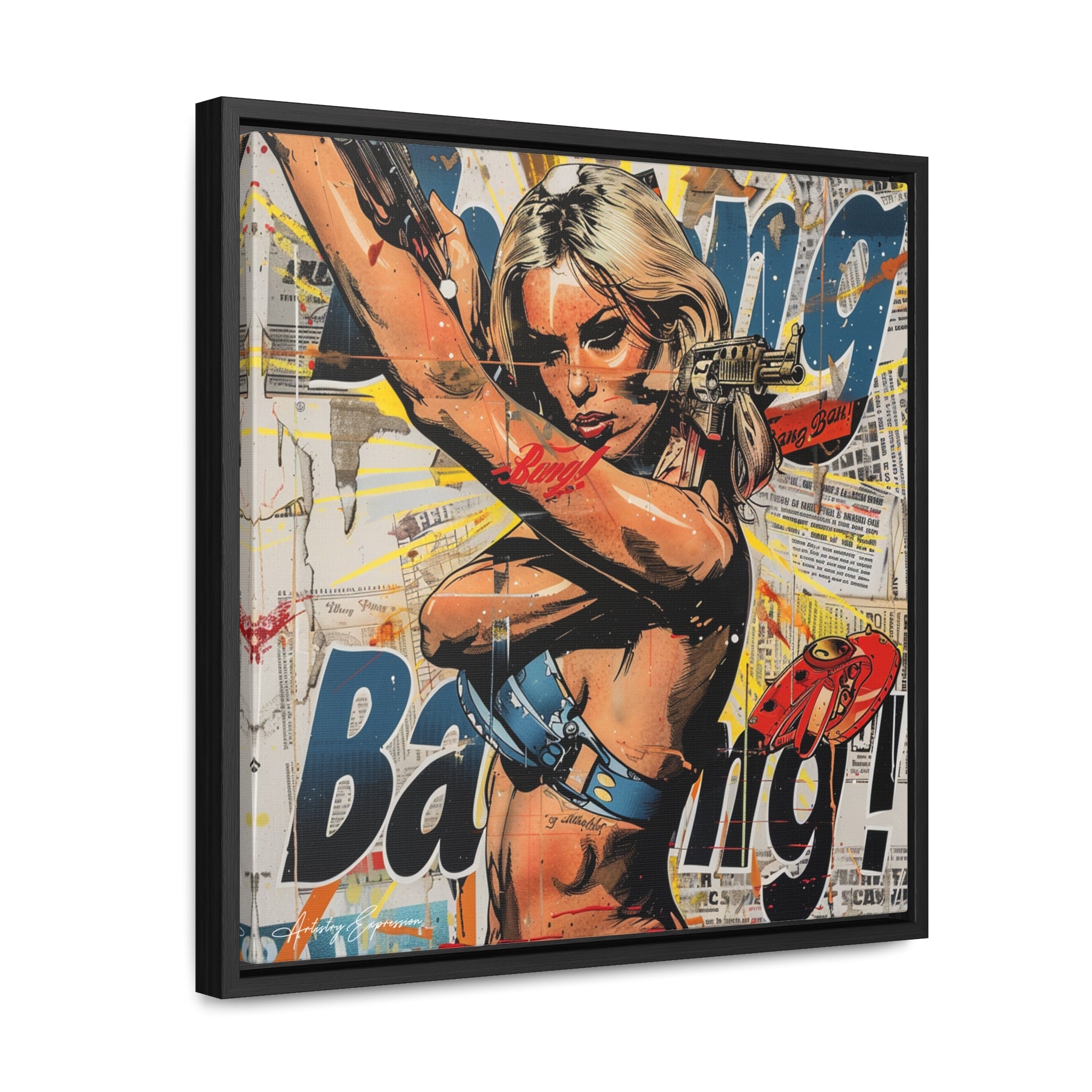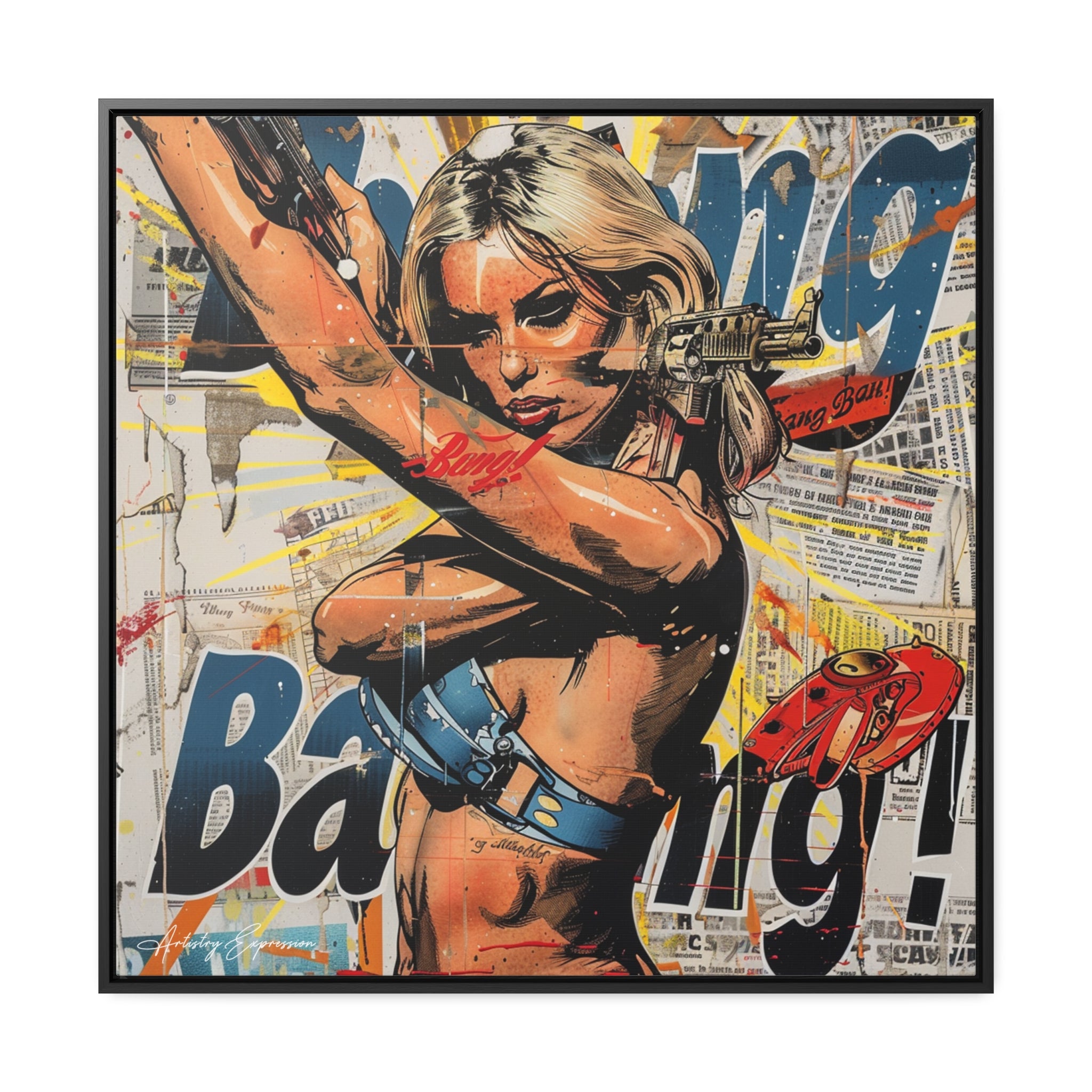 The artwork is a striking visual collage that merges pop culture with elements of firearms and feminine sensuality. At the center of the composition are a pair of crossed hands, along with the silhouette of a woman in lingerie, firmly grasping an automatic weapon.