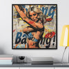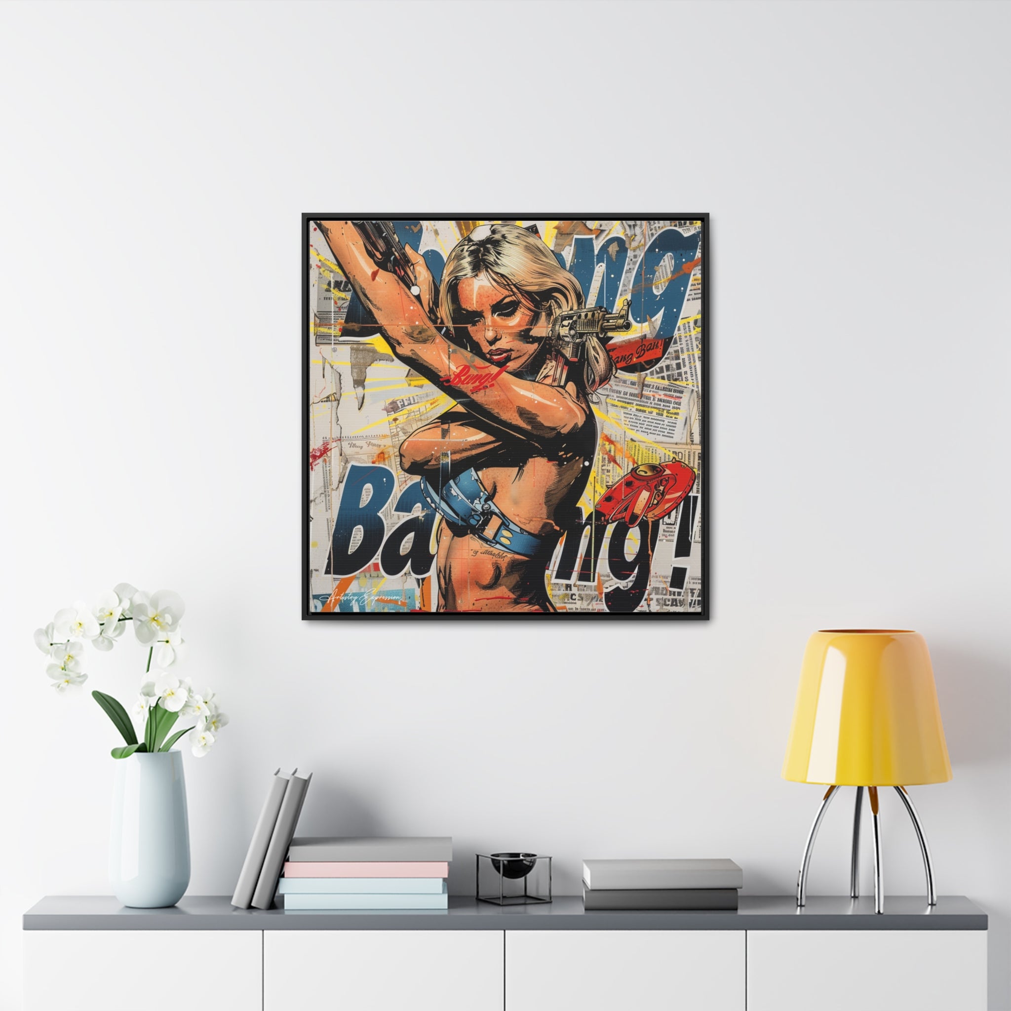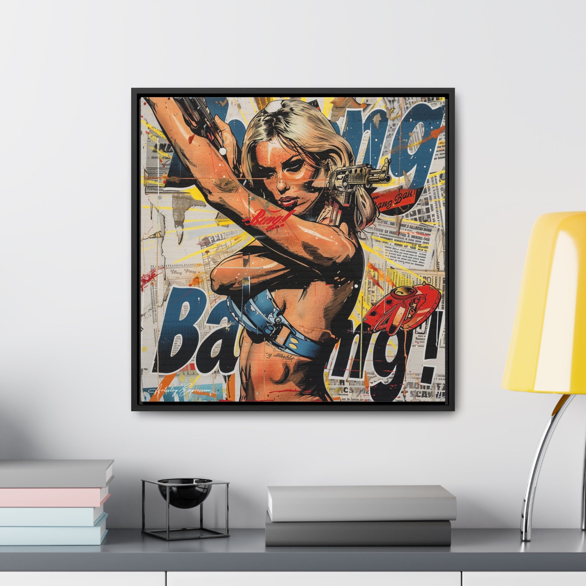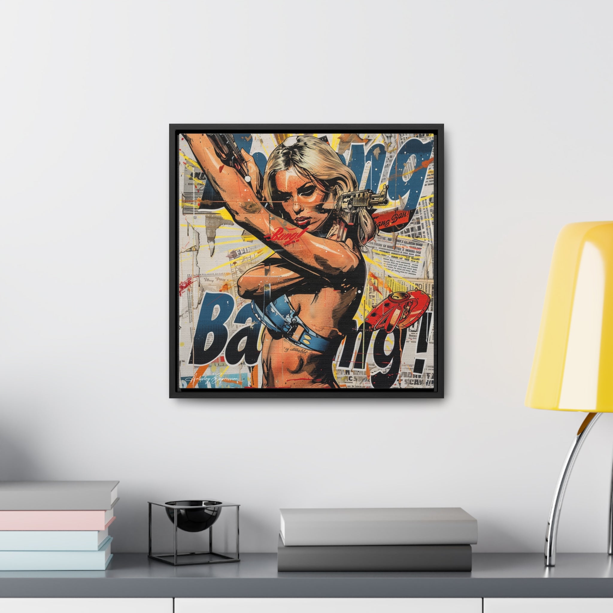 The artwork is a striking visual collage that merges pop culture with elements of firearms and feminine sensuality. At the center of the composition are a pair of crossed hands, along with the silhouette of a woman in lingerie, firmly grasping an automatic weapon.