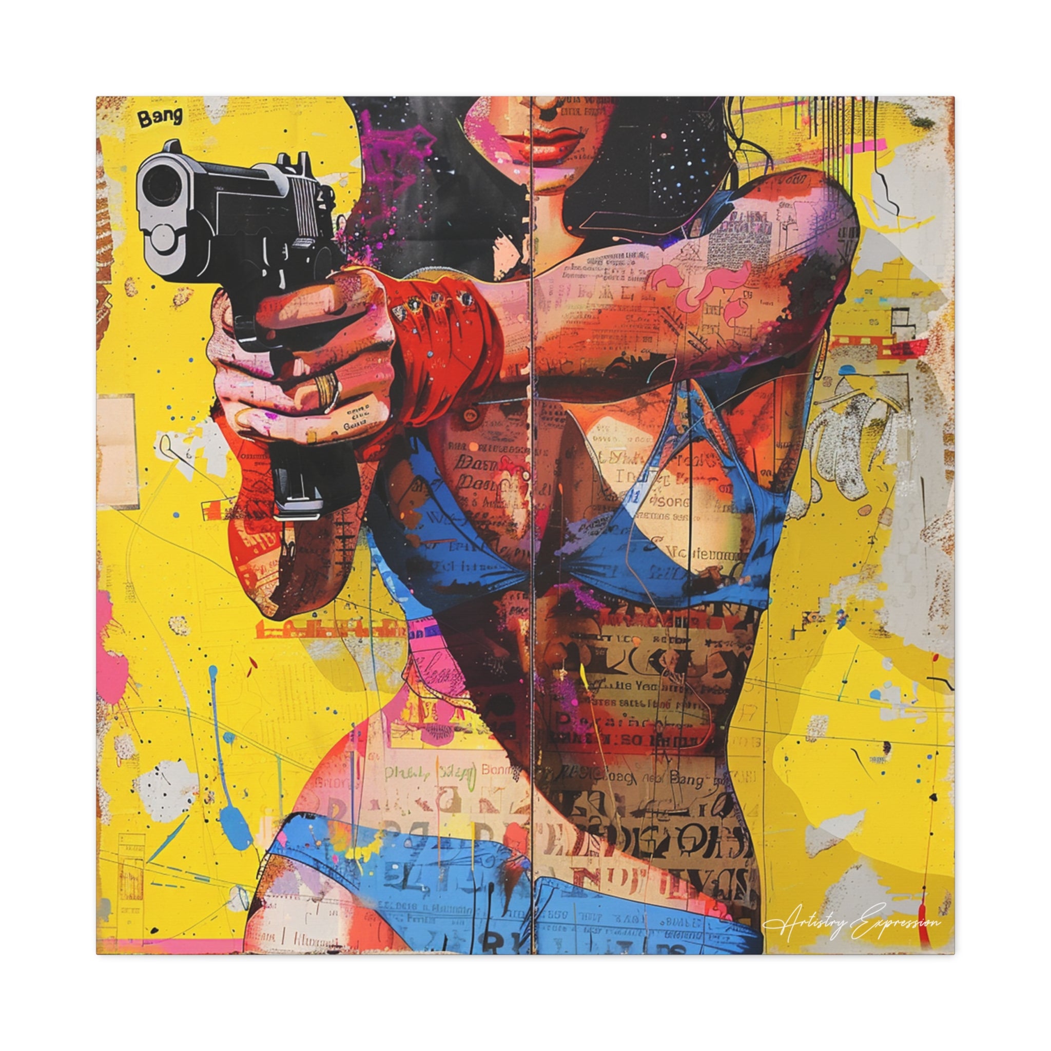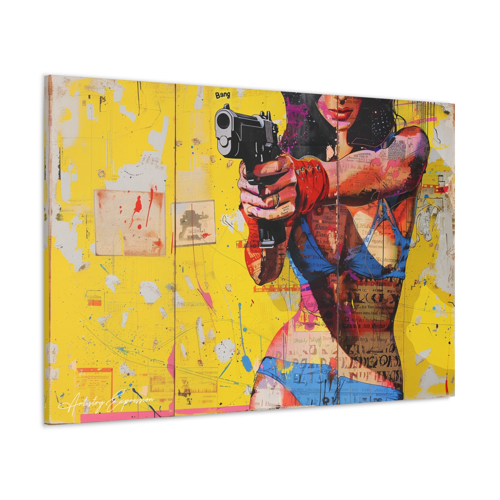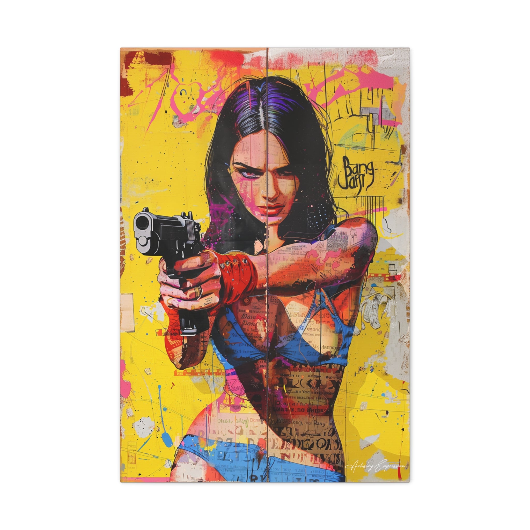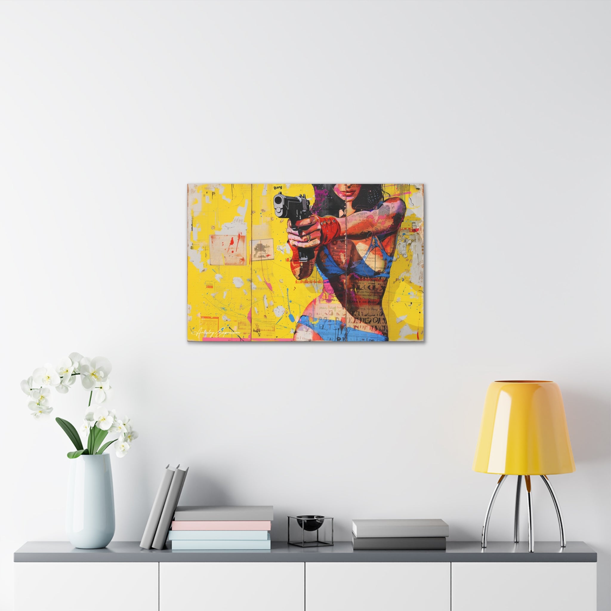 This artwork is a striking visual collage that merges elements of pop culture with firearms and female sensuality, depicting the female body in all its forms. The central subject is a pair of crossed hands, accompanied by the silhouette of a woman in lingerie firmly holding an automatic weapon.
