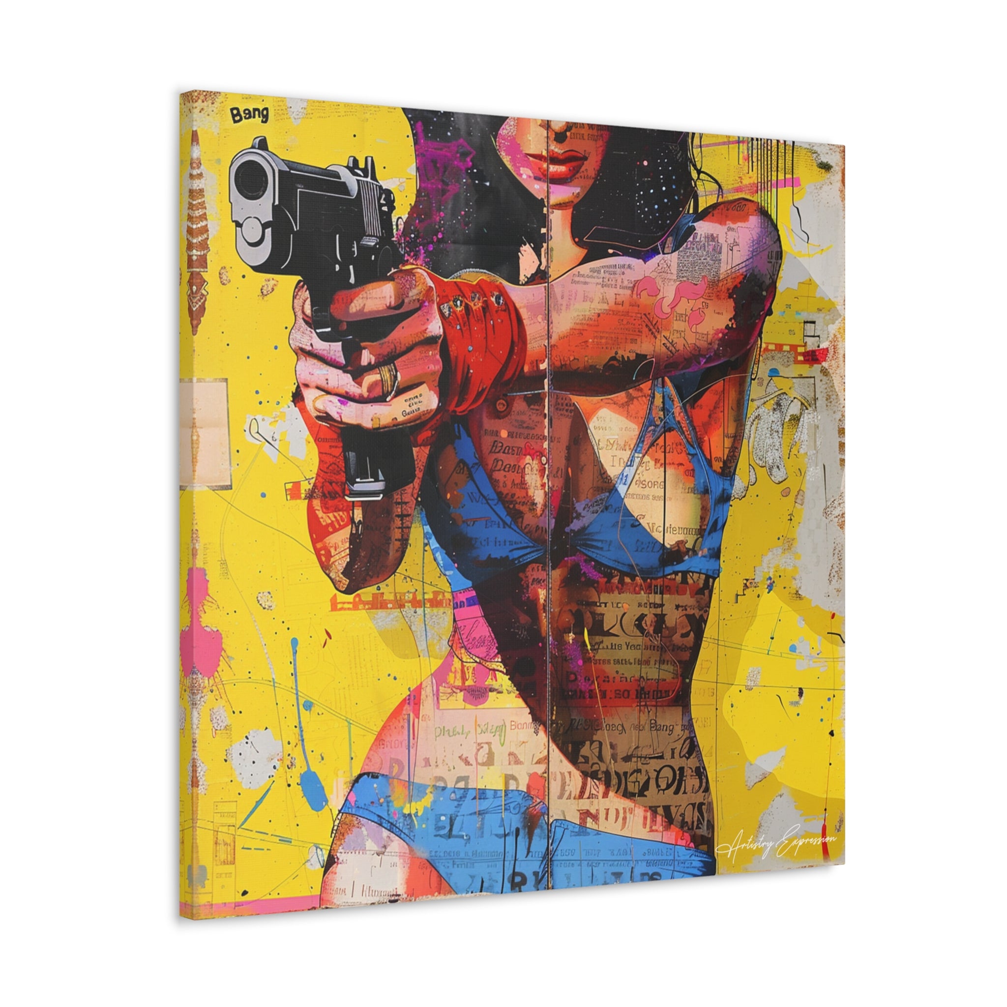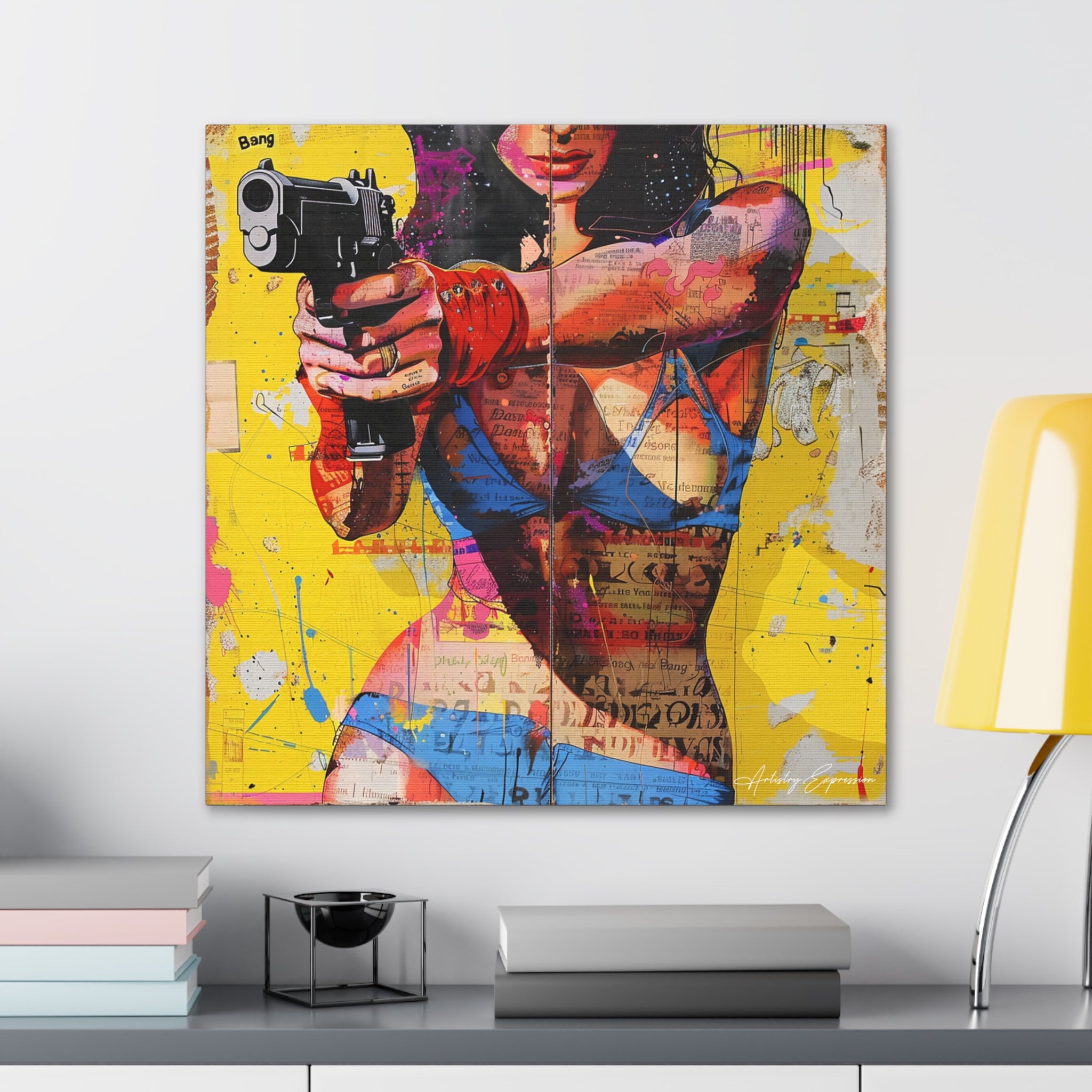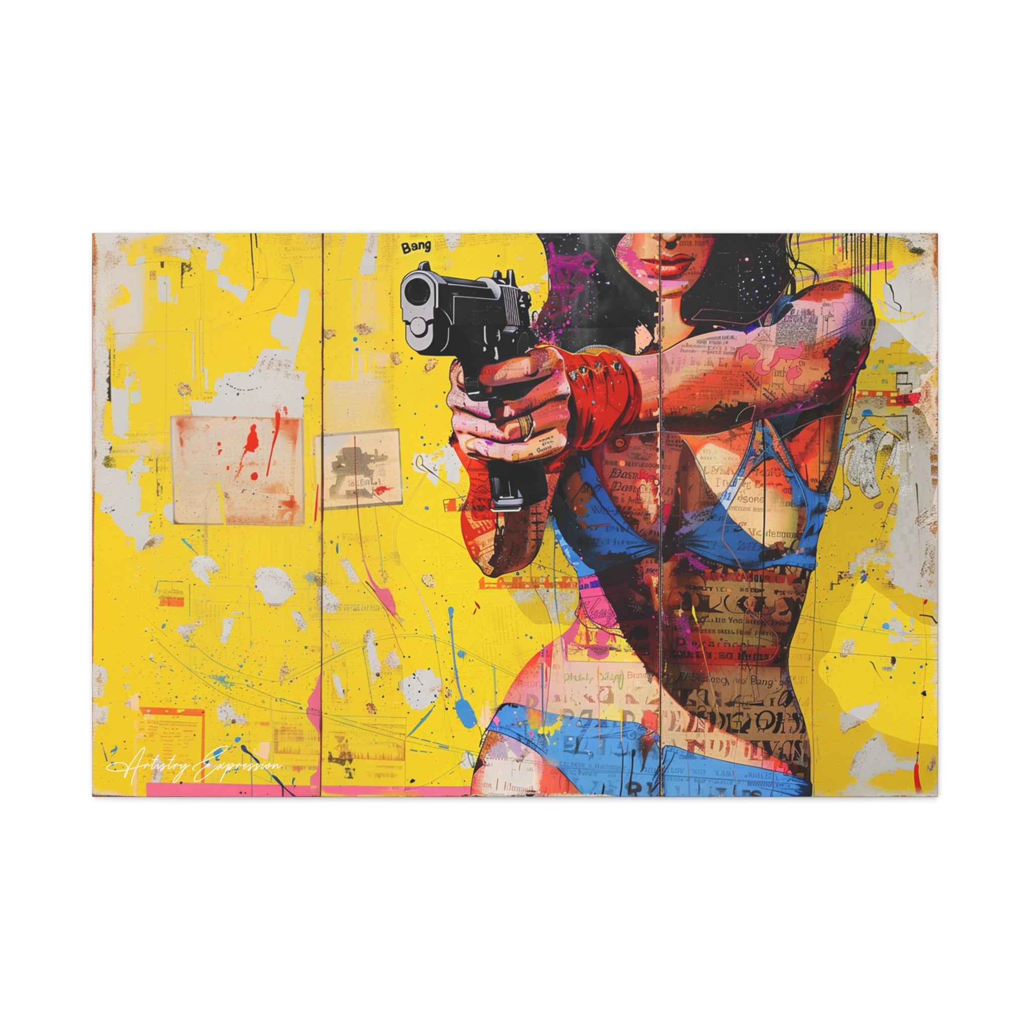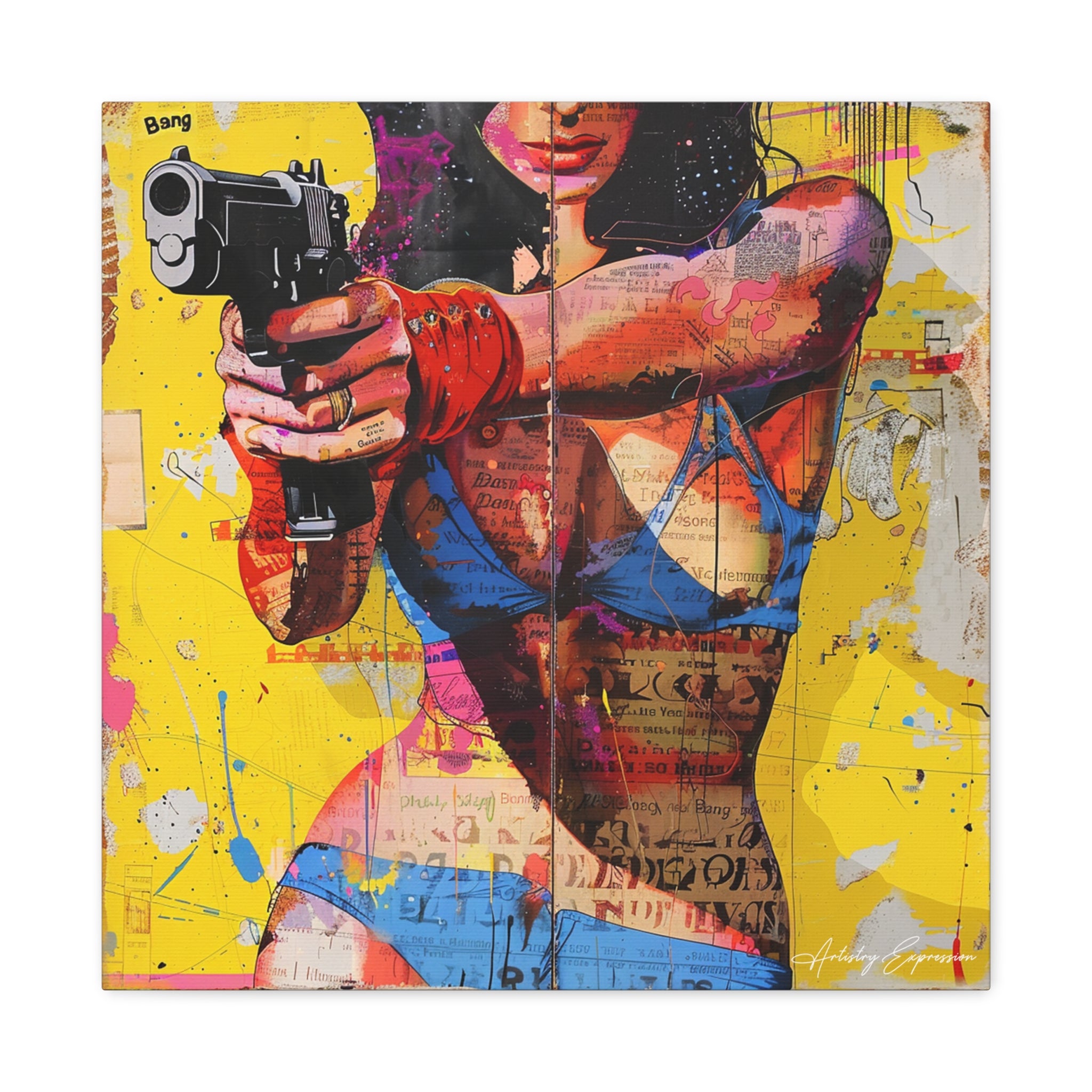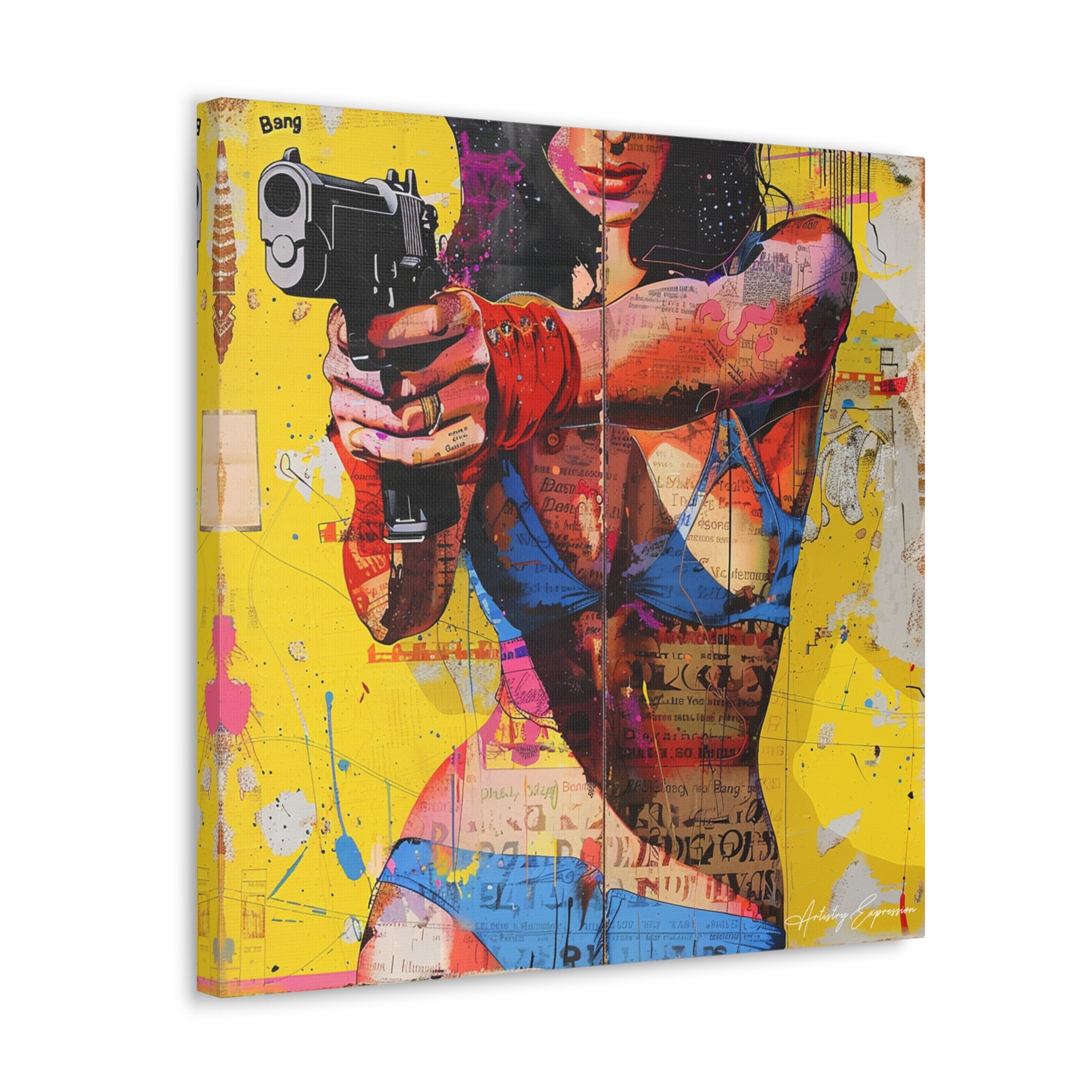 This artwork is a striking visual collage that merges elements of pop culture with firearms and female sensuality, depicting the female body in all its forms. The central subject is a pair of crossed hands, accompanied by the silhouette of a woman in lingerie firmly holding an automatic weapon.