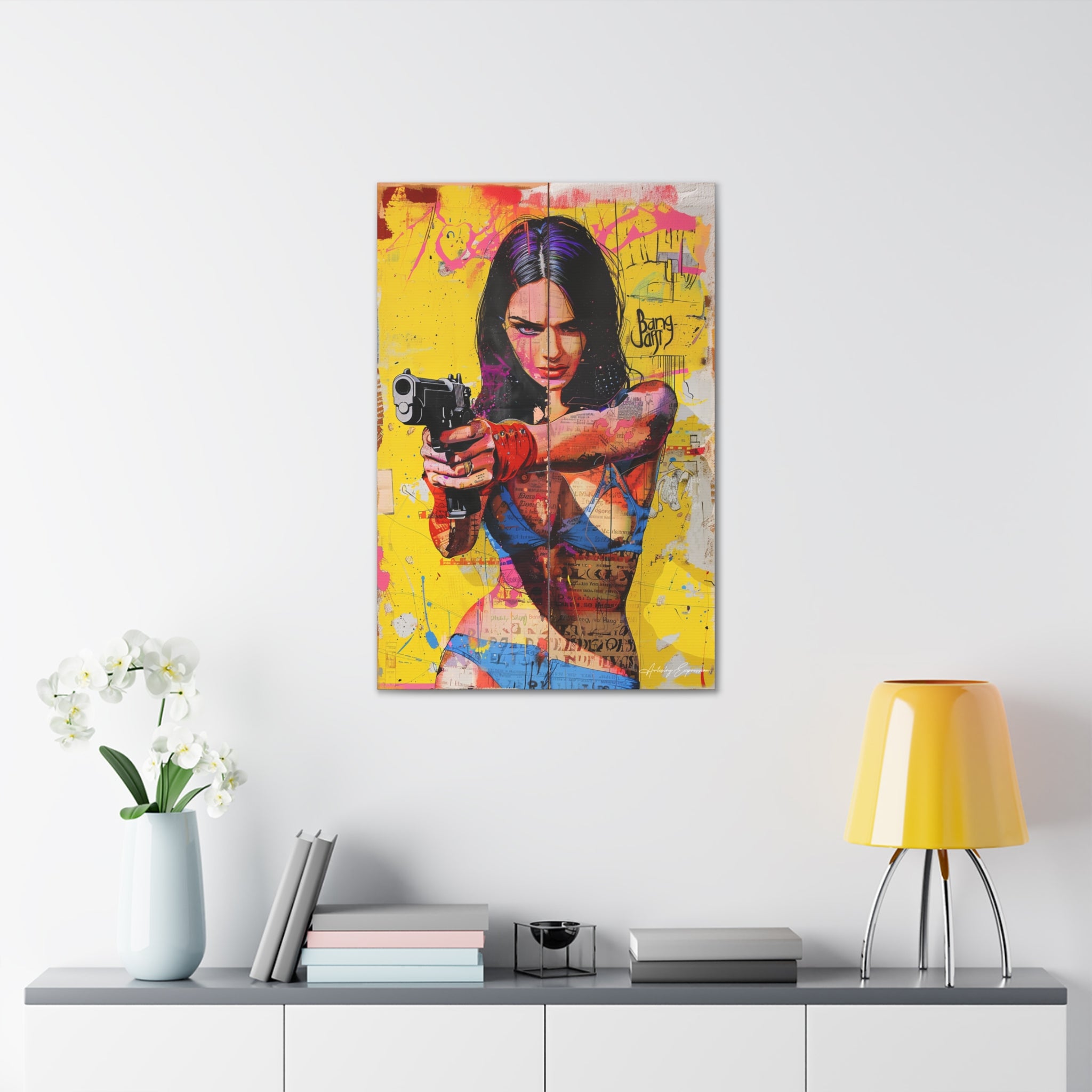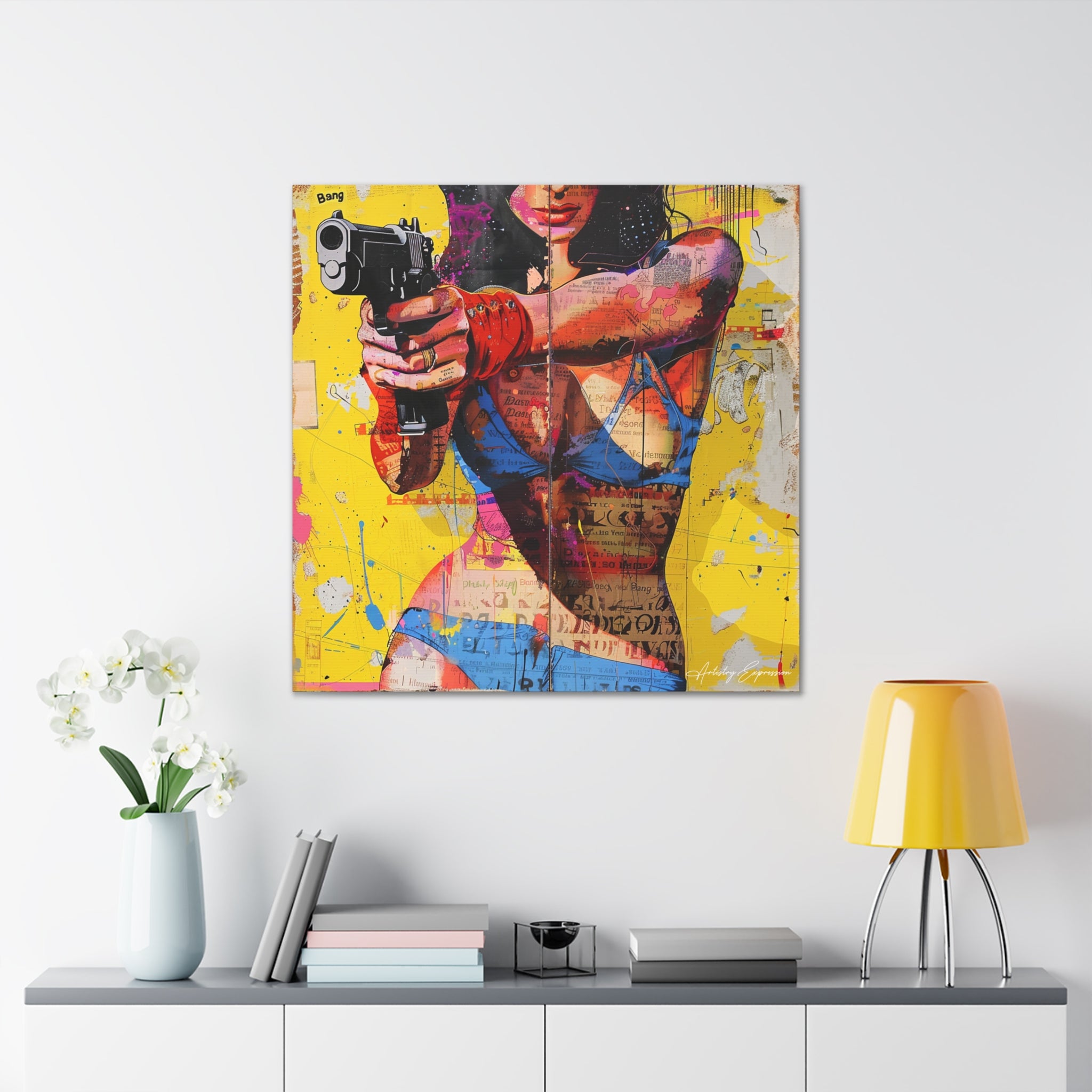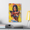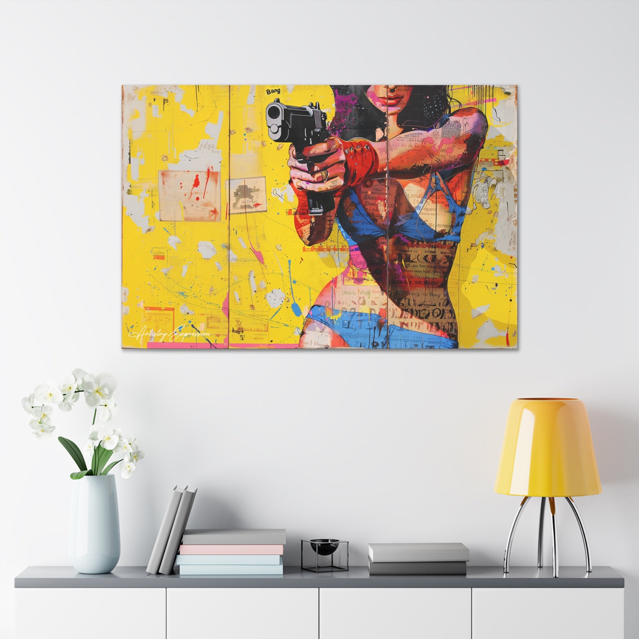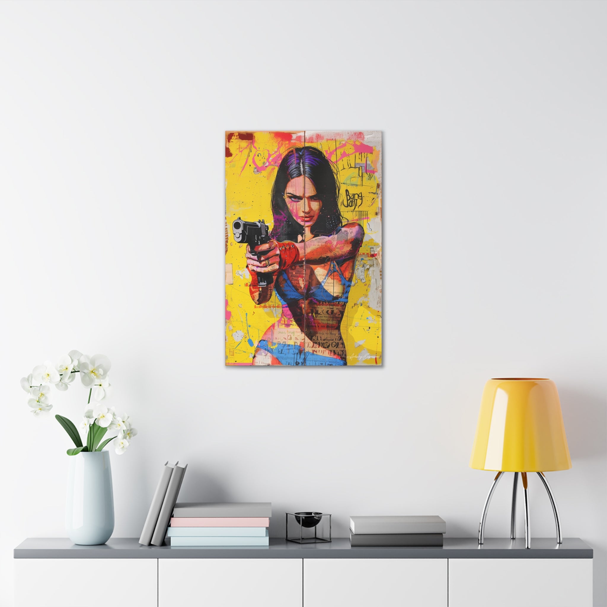 This artwork is a striking visual collage that merges elements of pop culture with firearms and female sensuality, depicting the female body in all its forms. The central subject is a pair of crossed hands, accompanied by the silhouette of a woman in lingerie firmly holding an automatic weapon.