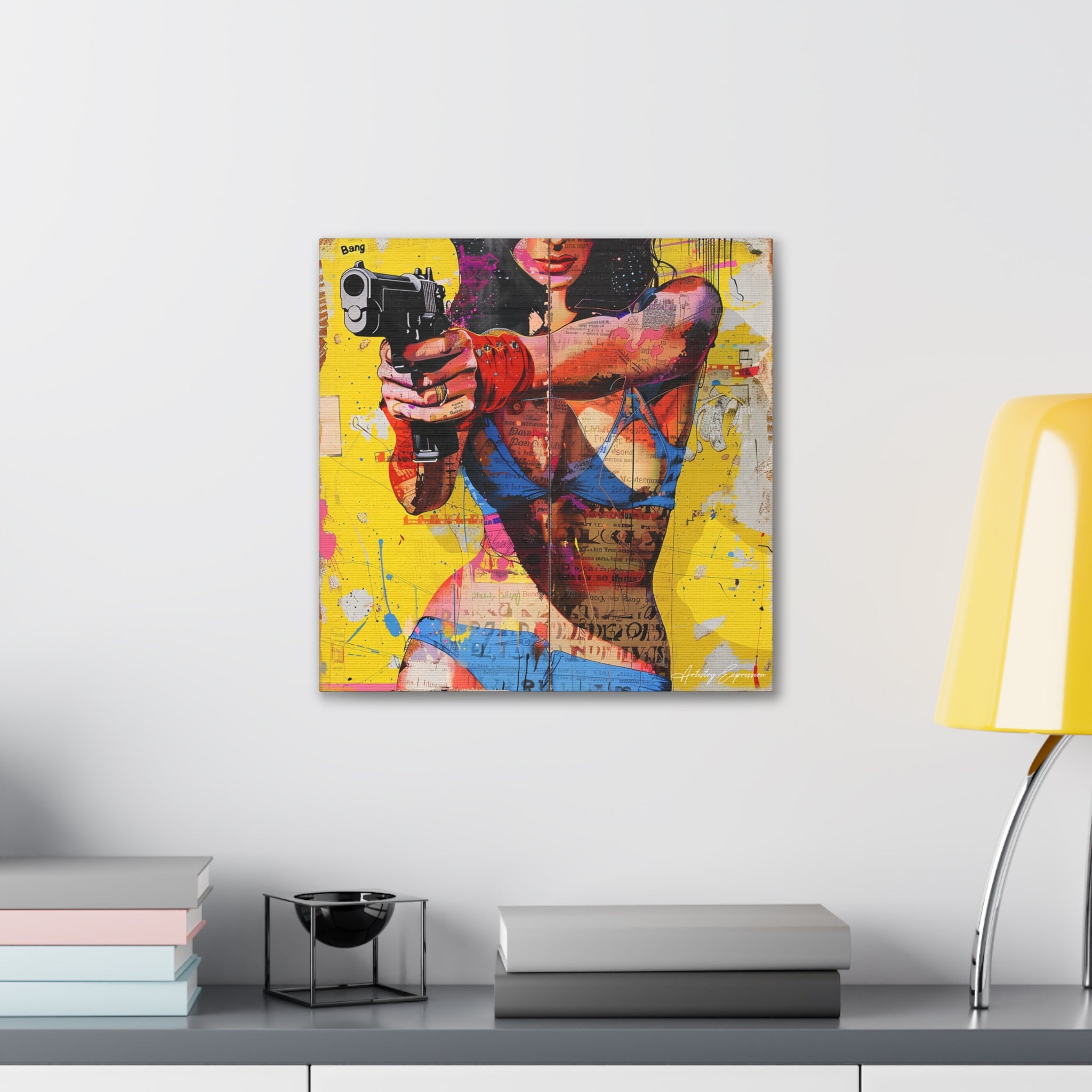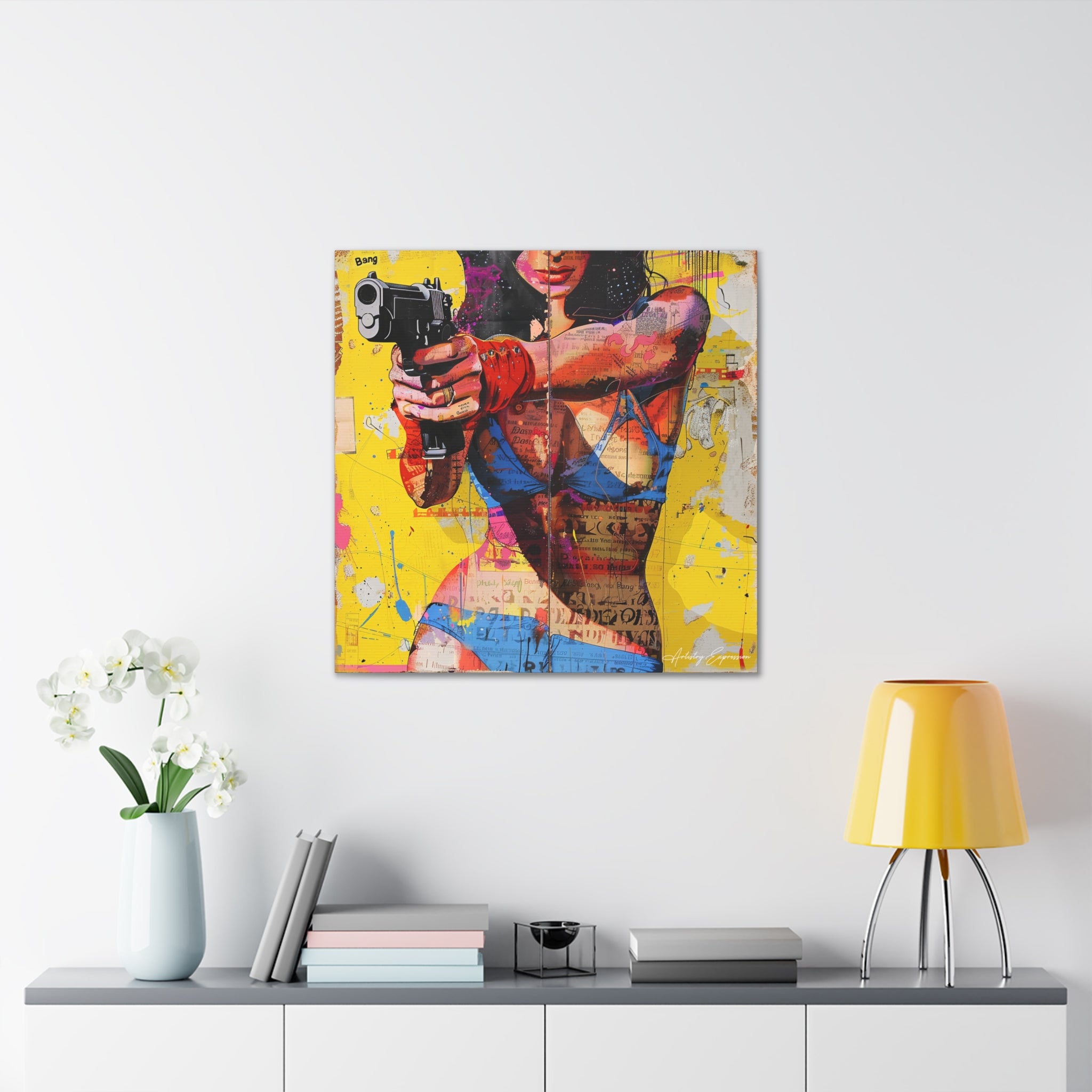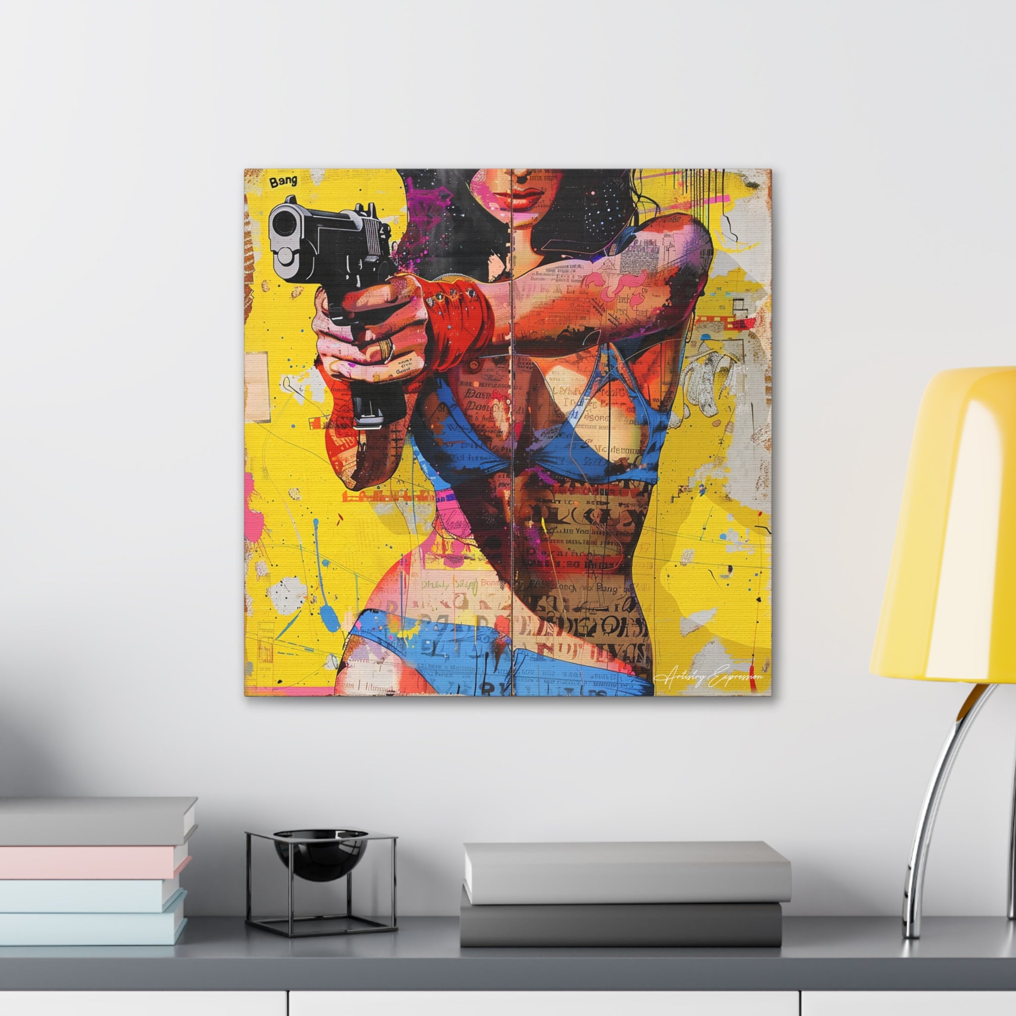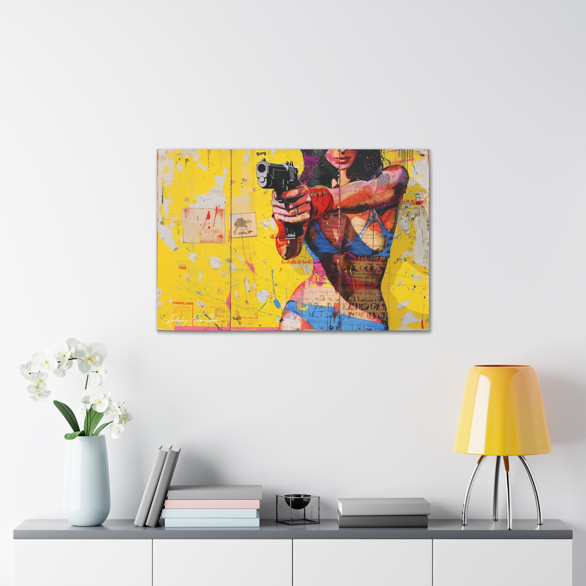 This artwork is a striking visual collage that merges elements of pop culture with firearms and female sensuality, depicting the female body in all its forms. The central subject is a pair of crossed hands, accompanied by the silhouette of a woman in lingerie firmly holding an automatic weapon.