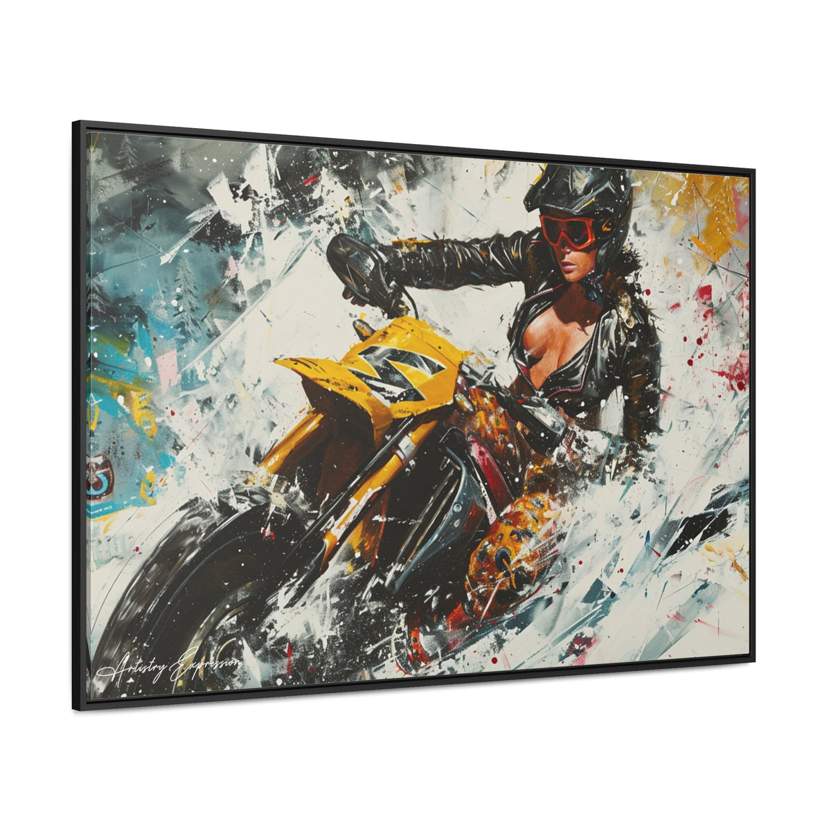 An oil painting depicting a captivating scene of a confident woman driving a motorcycle through a snowy landscape. Against the wintry backdrop, her presence exudes warmth and boldness, adding a touch of allure to the chilly surroundings.