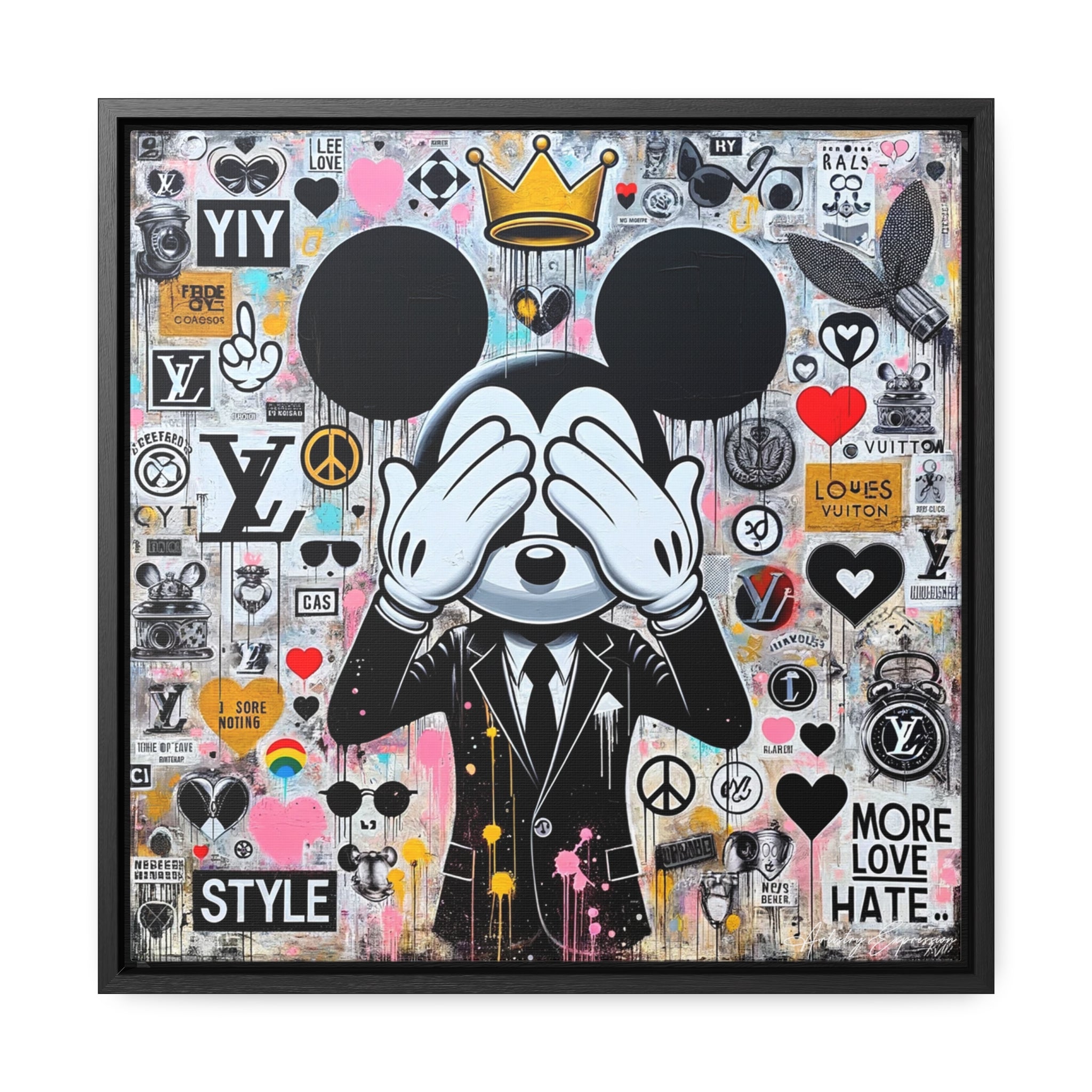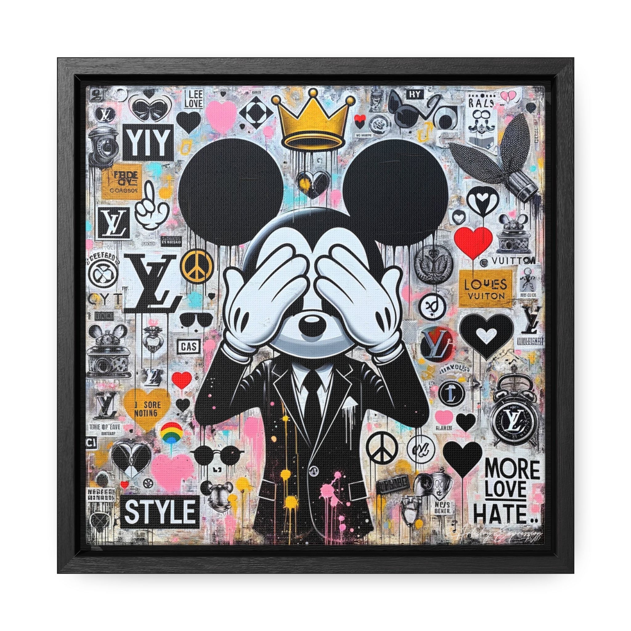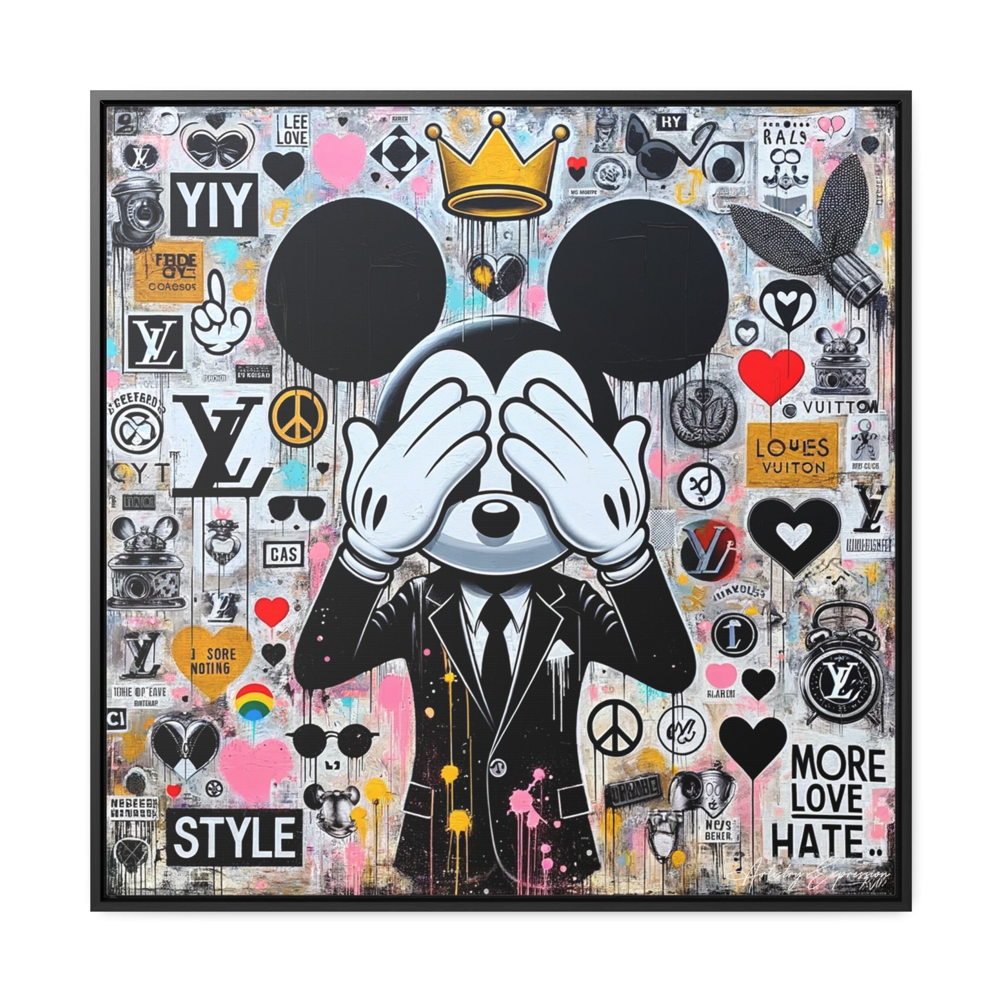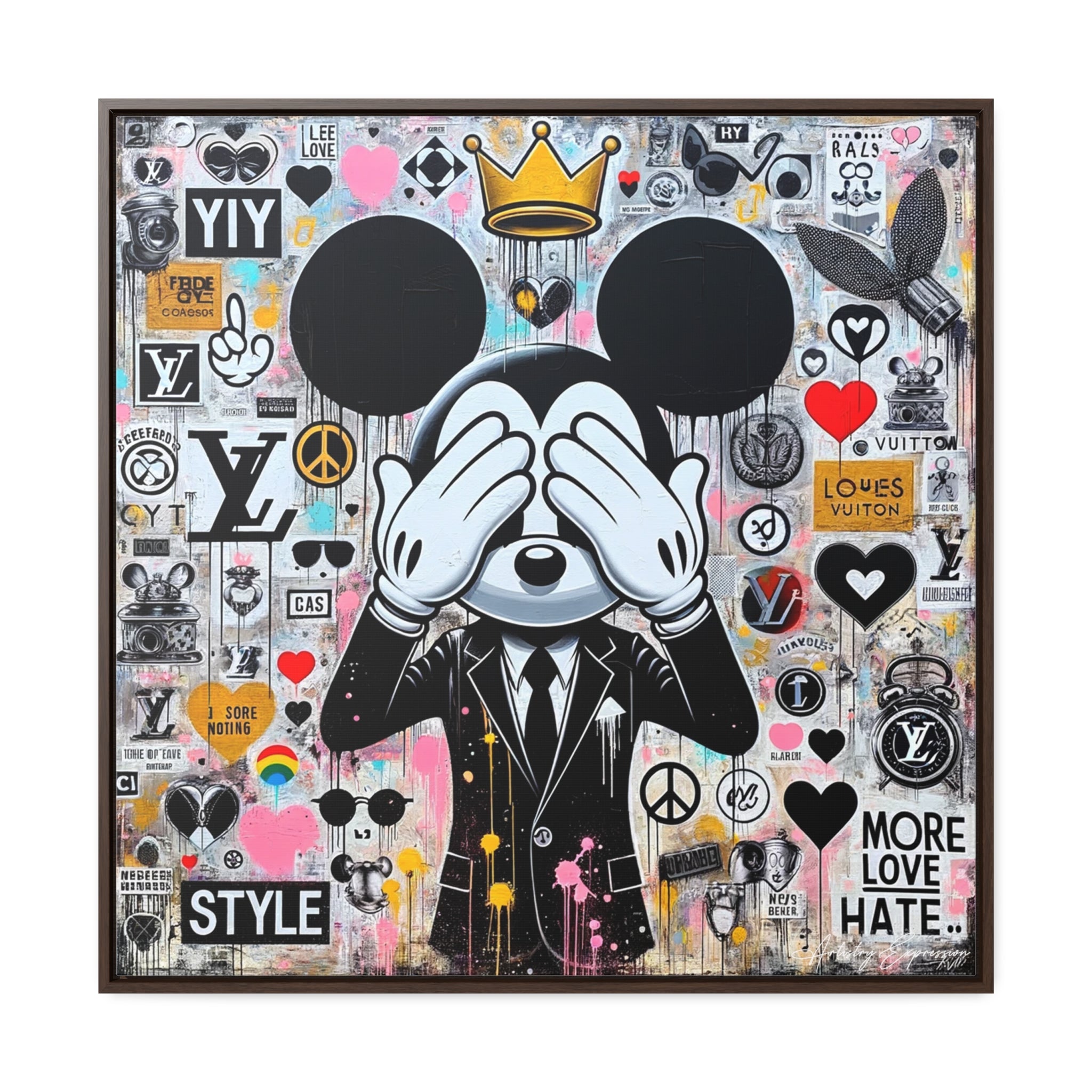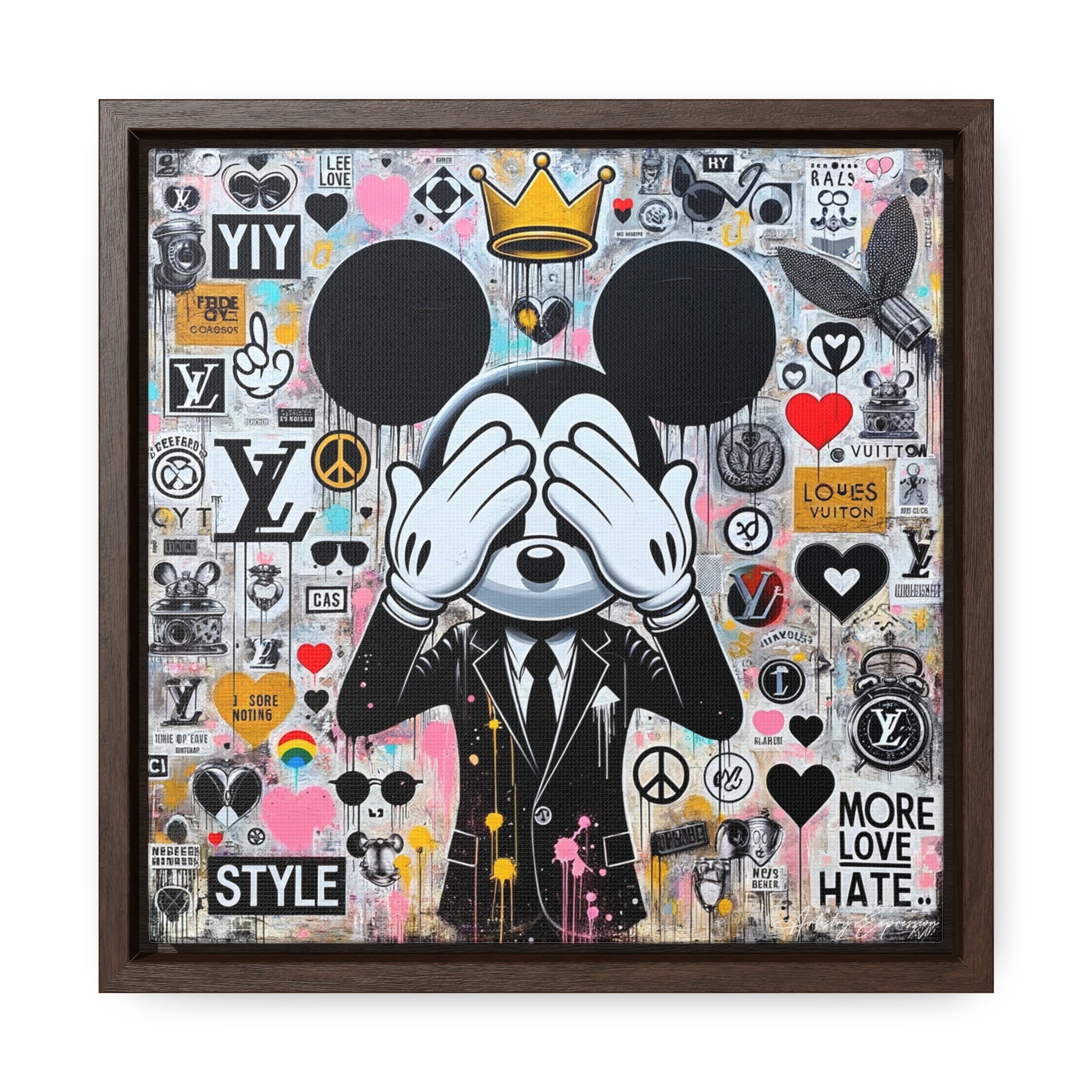 A vibrant collage combining pop culture and street art elements, featuring a caricature reminiscent of Mickey Mouse with hands covering its eyes. The background includes luxury brand logos, crown and heart patterns, and a positive message bubble. With a varied color palette, it celebrates pop culture while promoting love and unity in an urban style.