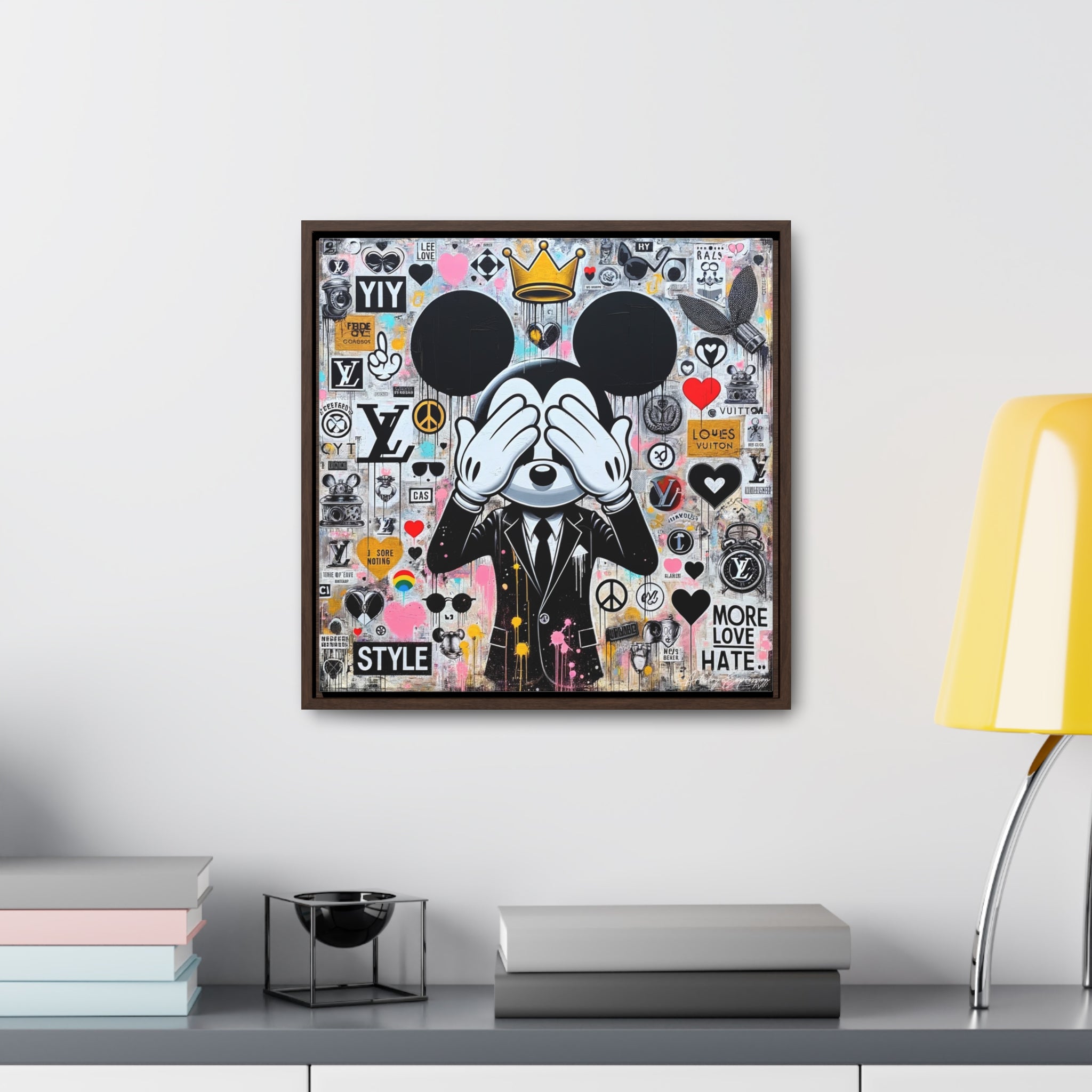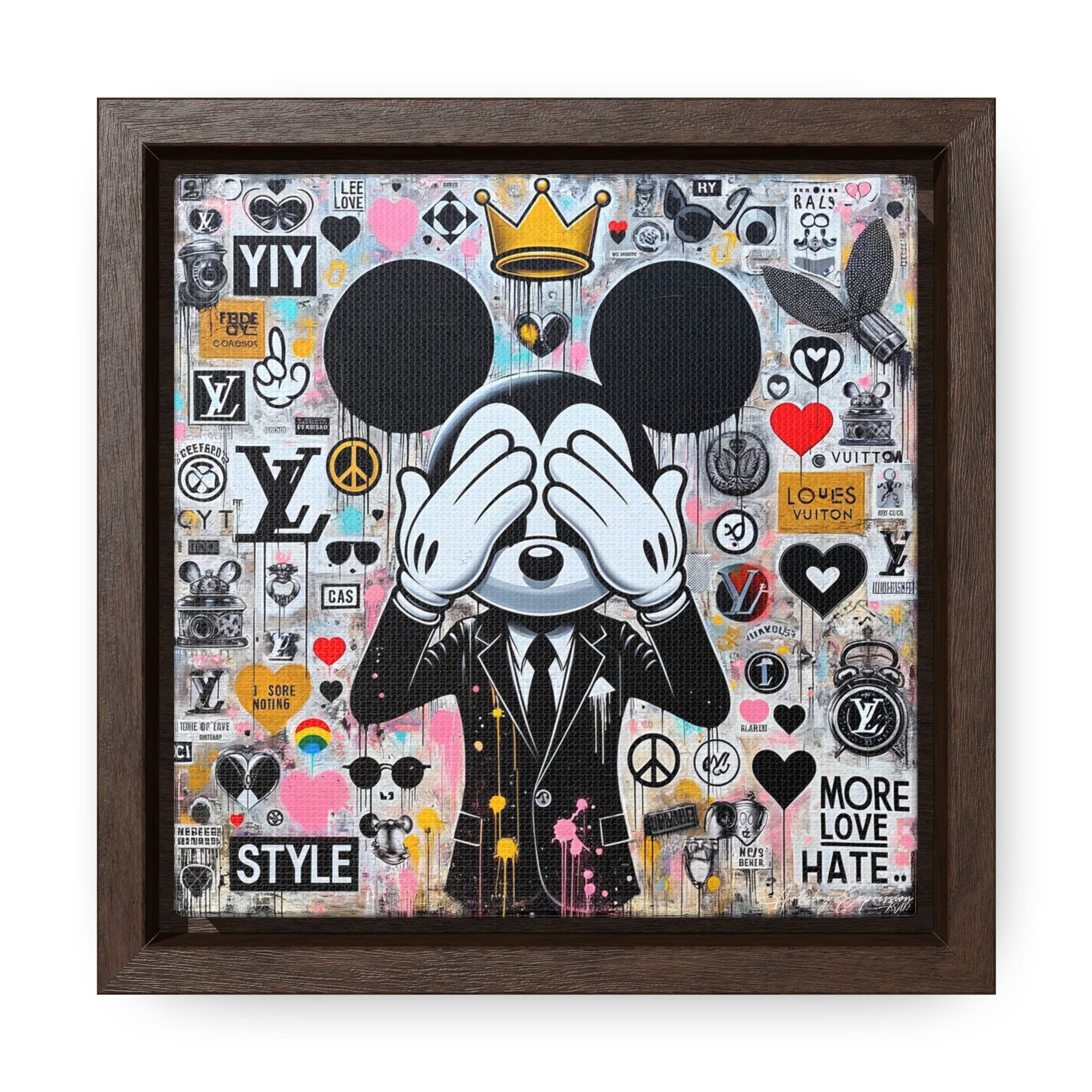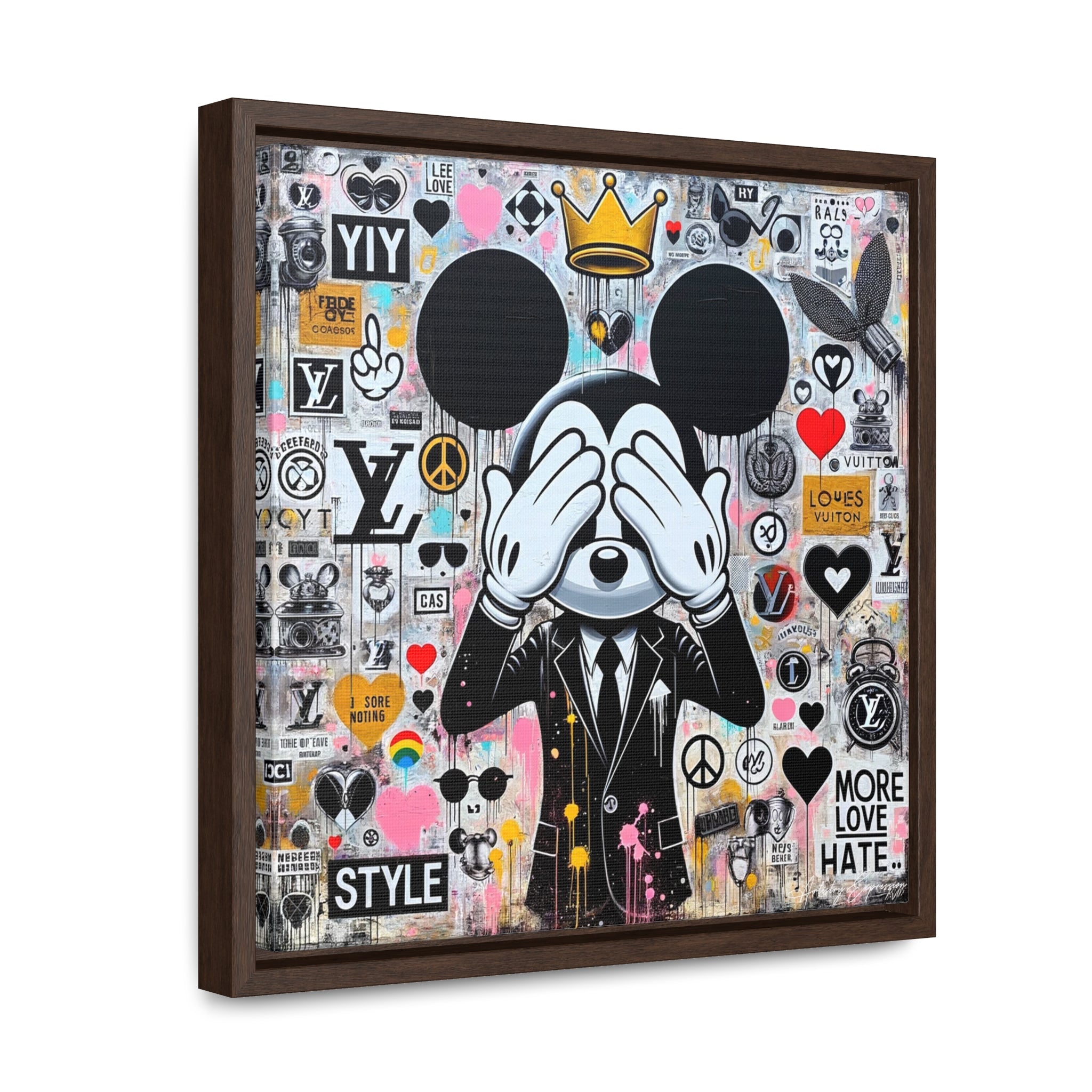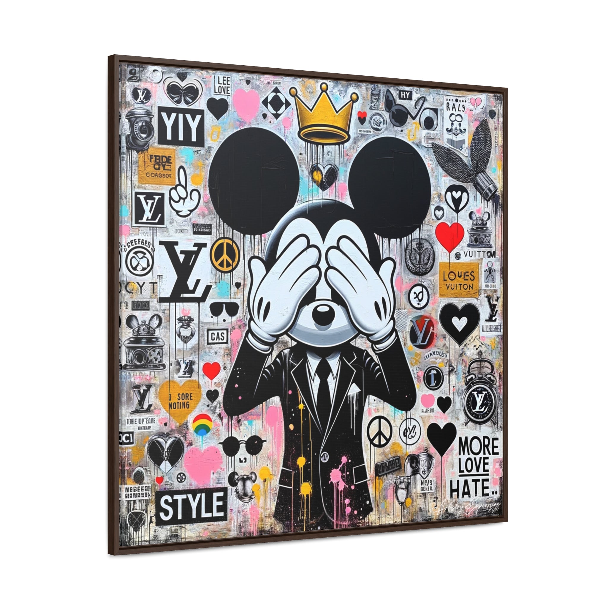 A vibrant collage combining pop culture and street art elements, featuring a caricature reminiscent of Mickey Mouse with hands covering its eyes. The background includes luxury brand logos, crown and heart patterns, and a positive message bubble. With a varied color palette, it celebrates pop culture while promoting love and unity in an urban style.
