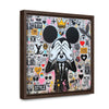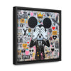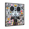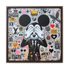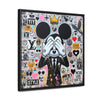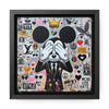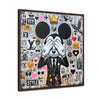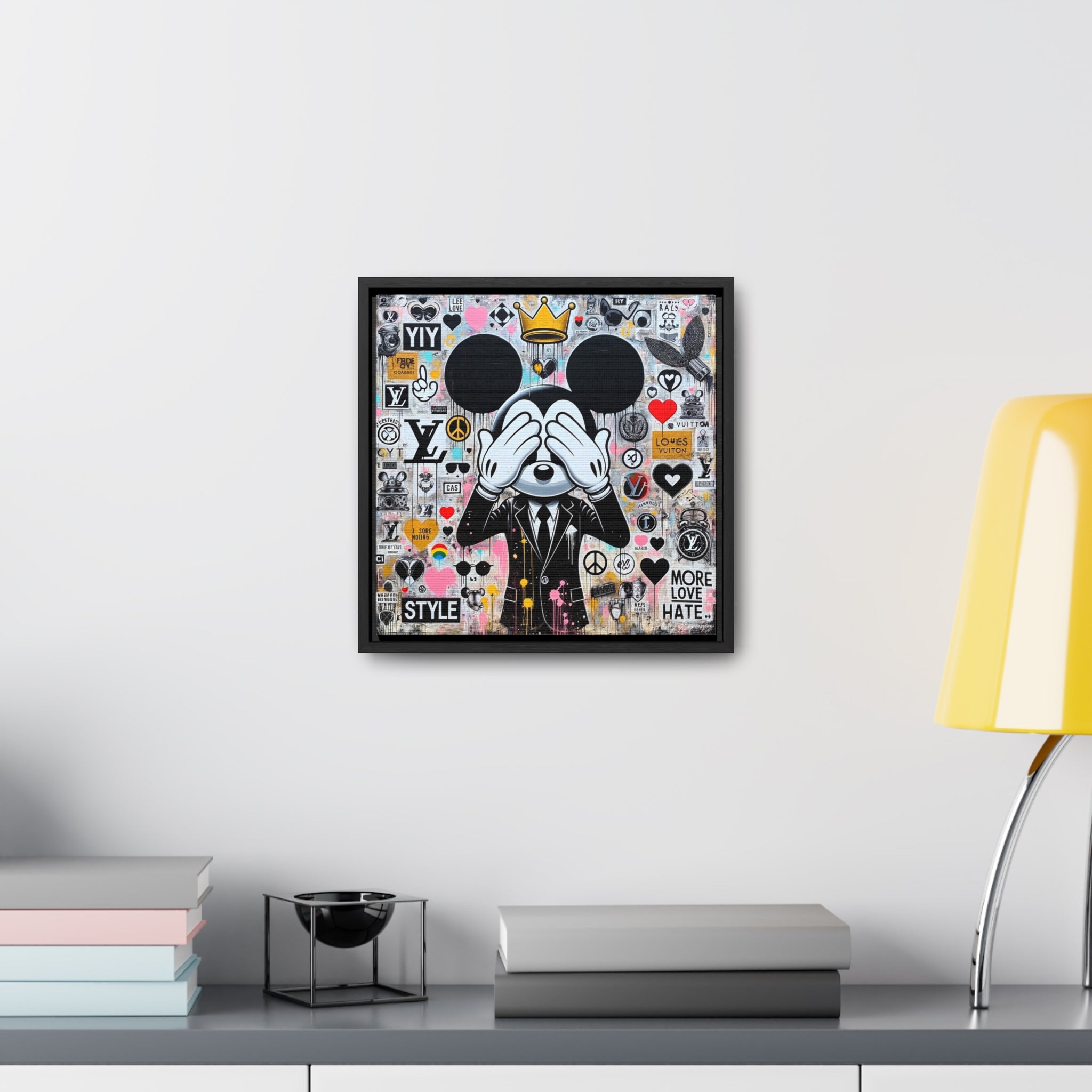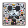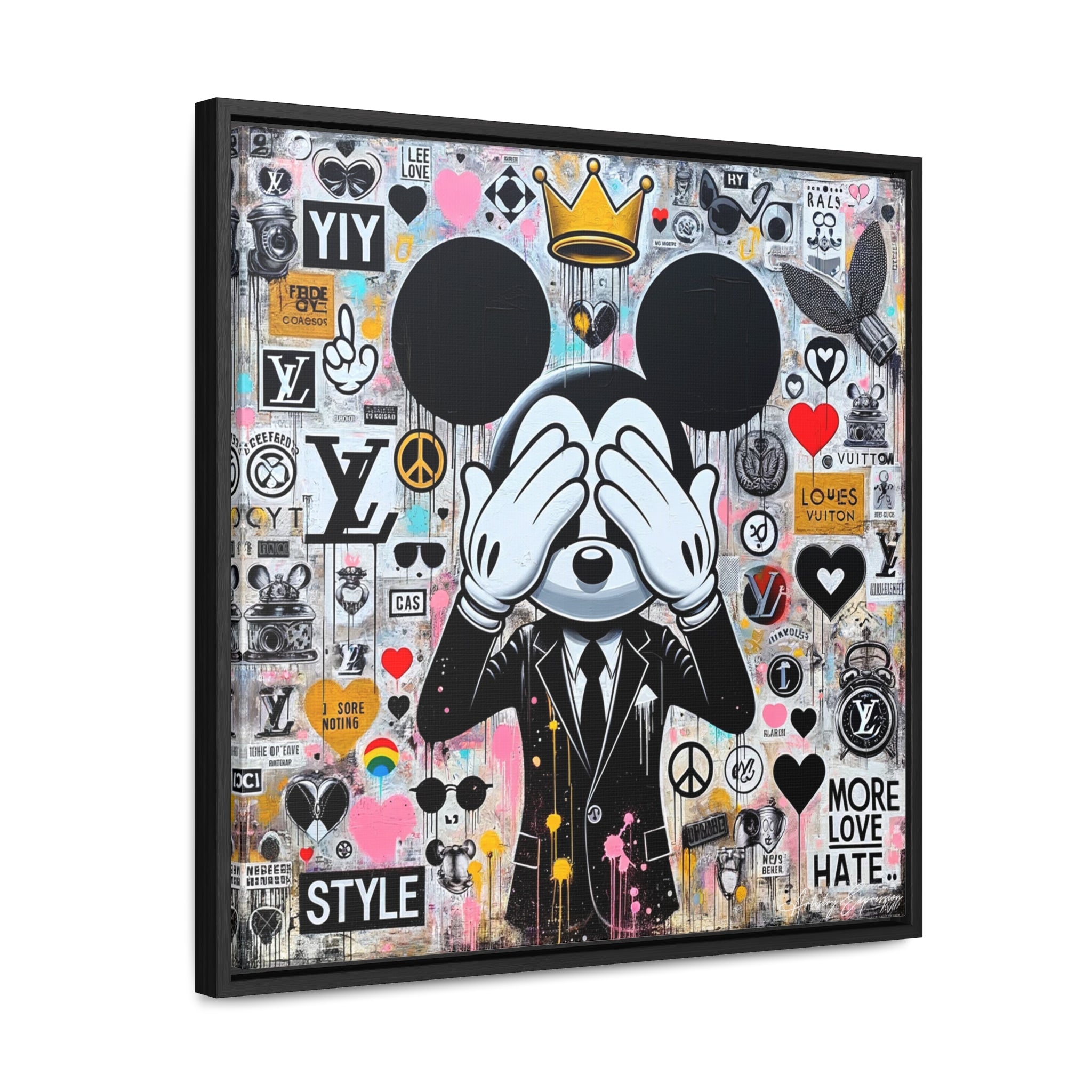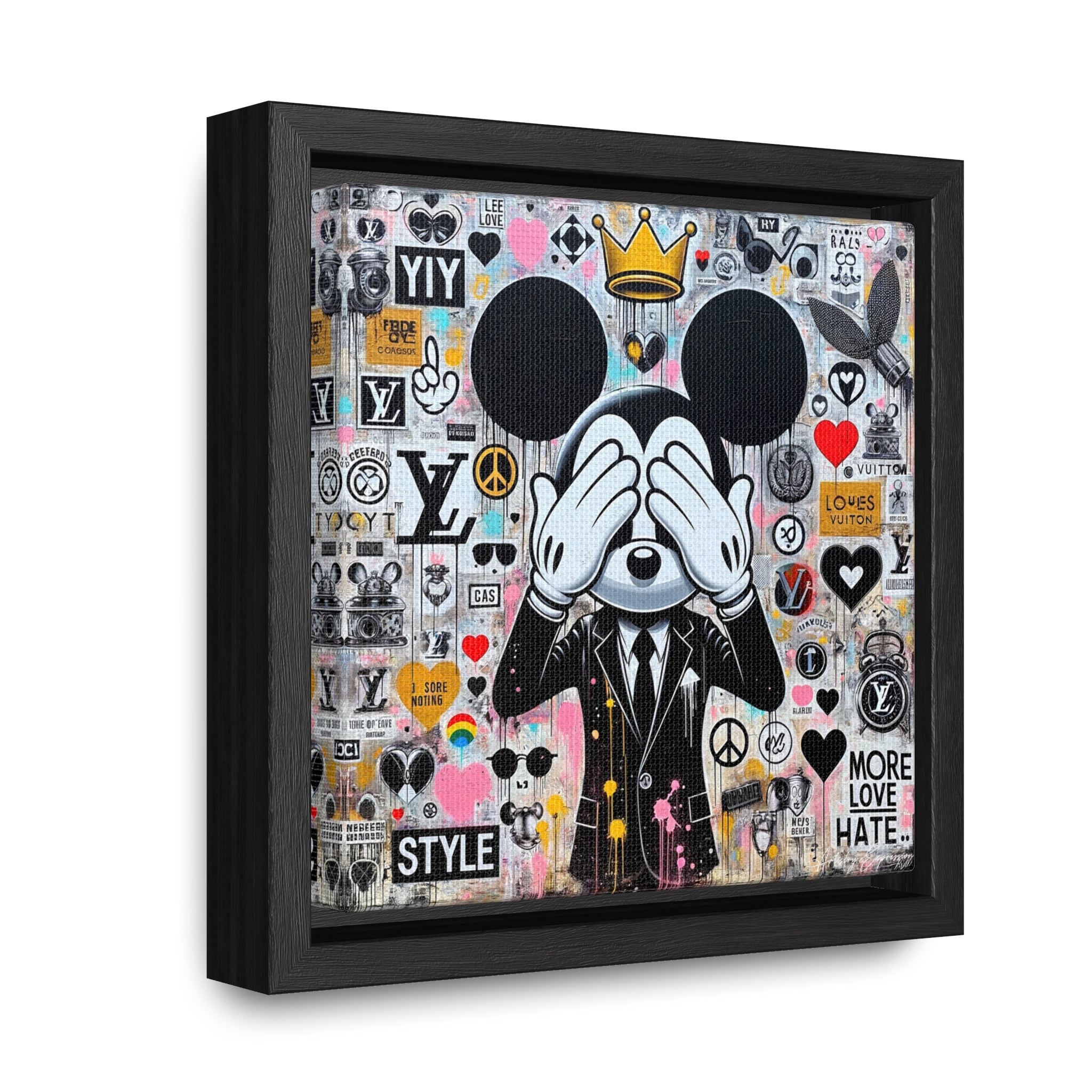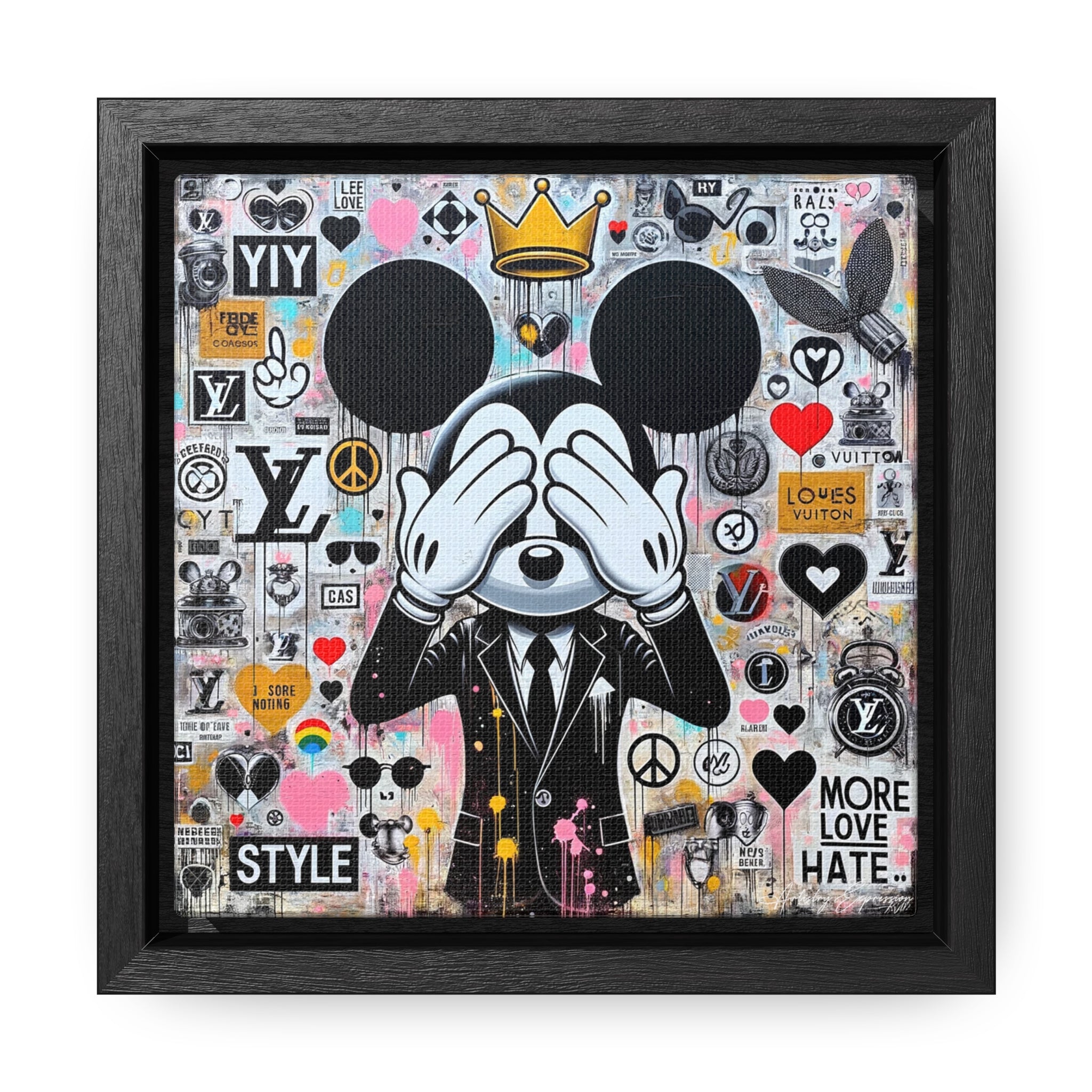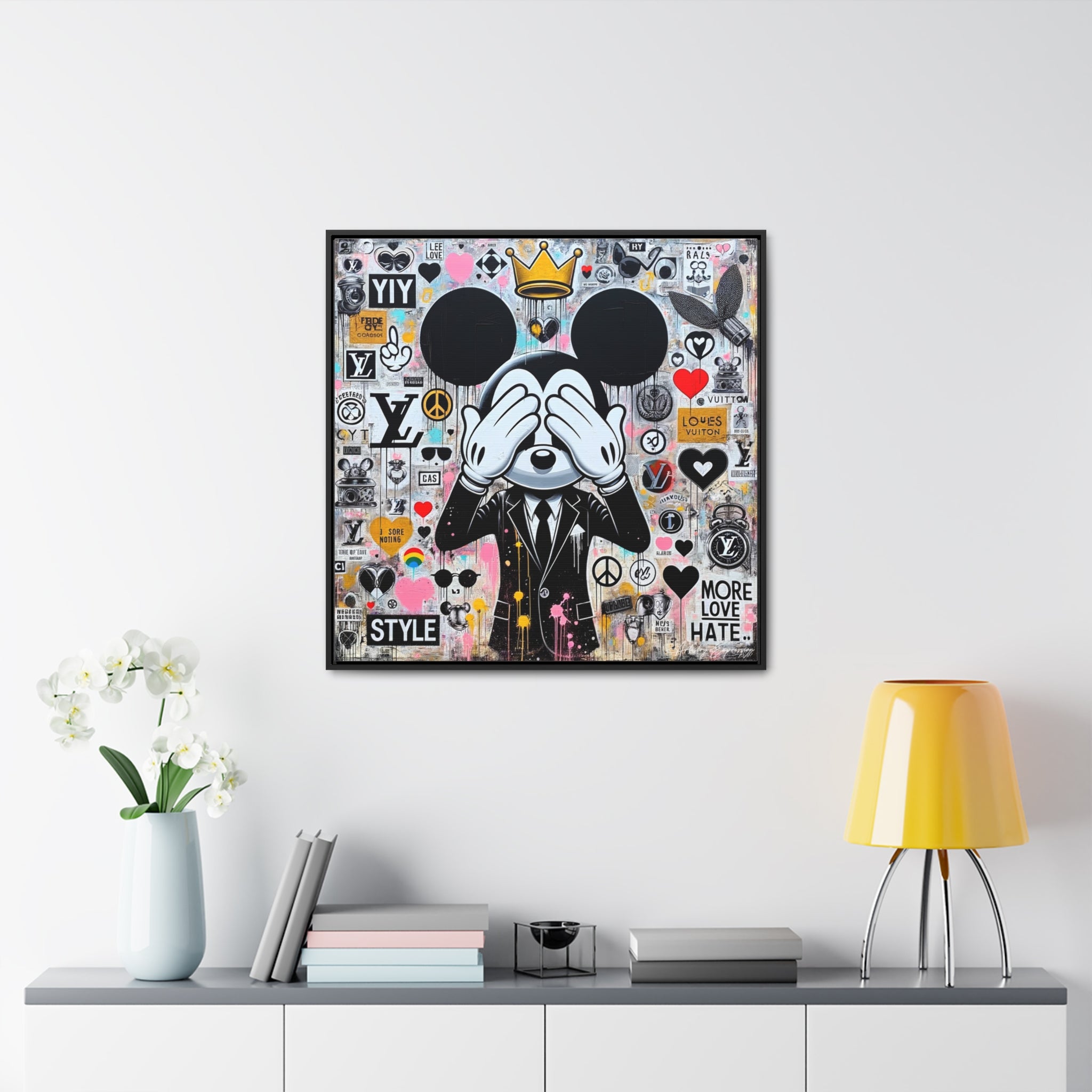 A vibrant collage combining pop culture and street art elements, featuring a caricature reminiscent of Mickey Mouse with hands covering its eyes. The background includes luxury brand logos, crown and heart patterns, and a positive message bubble. With a varied color palette, it celebrates pop culture while promoting love and unity in an urban style.